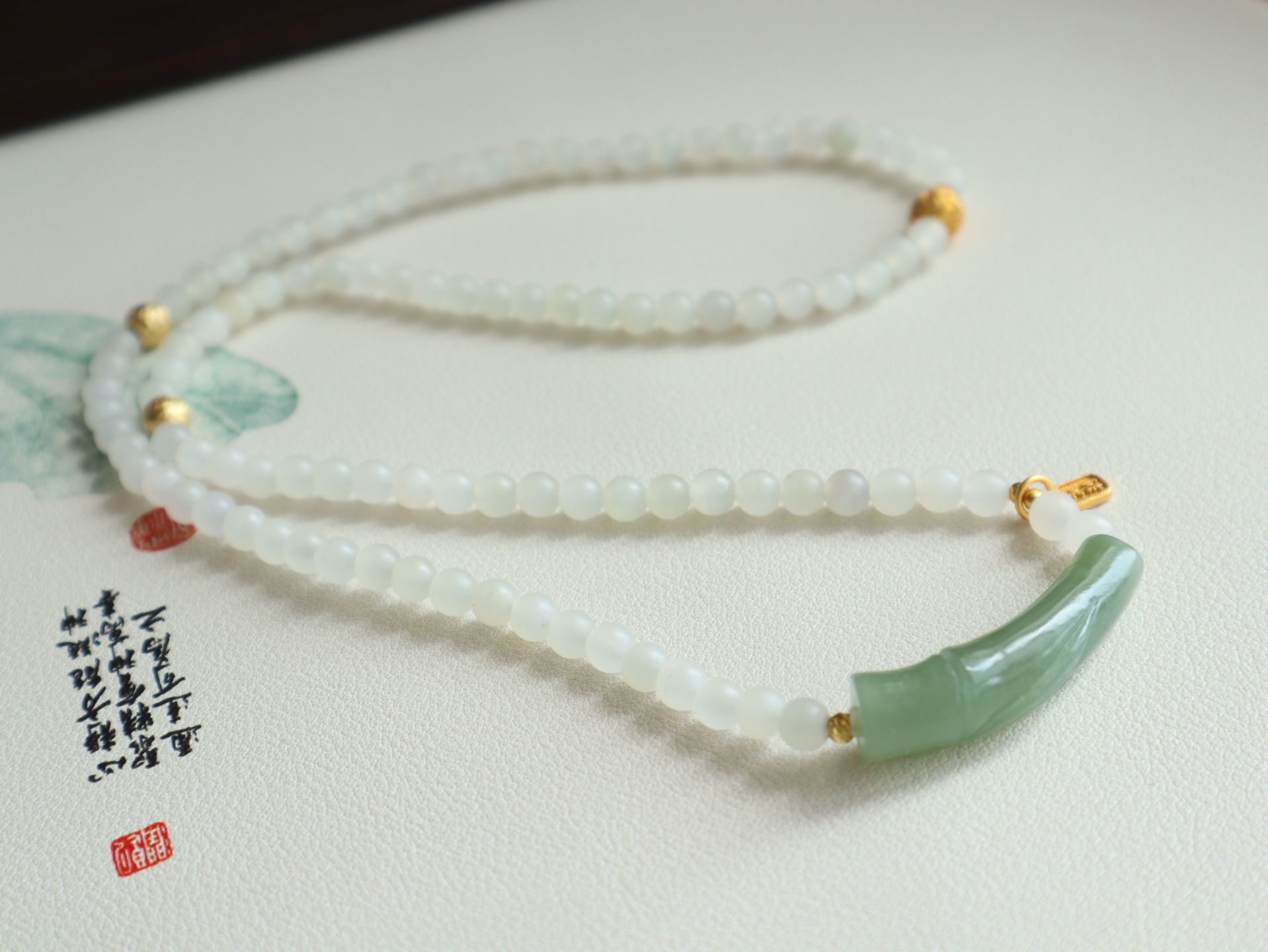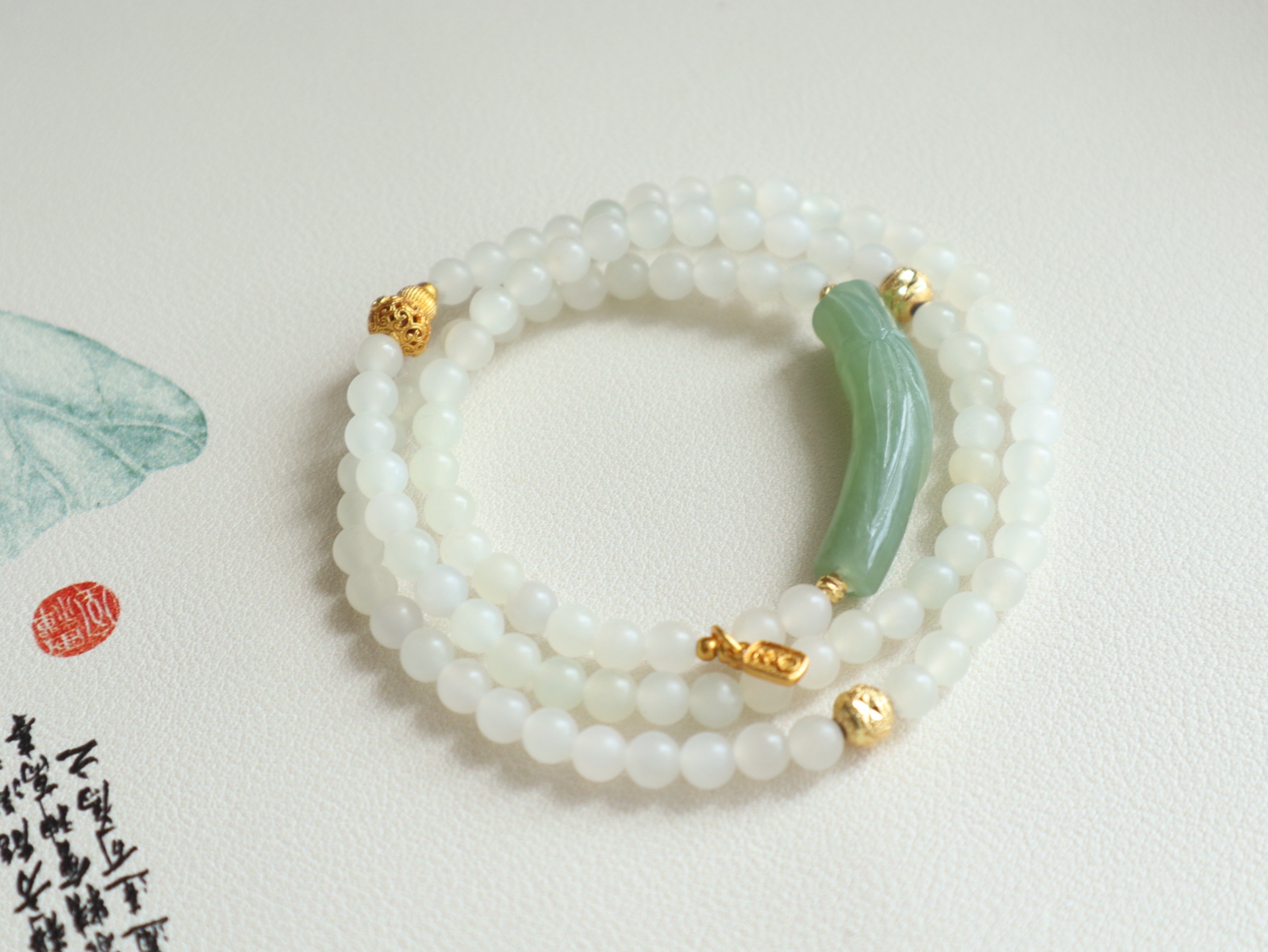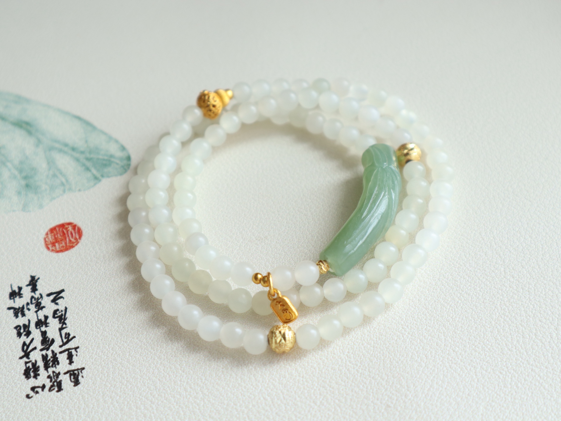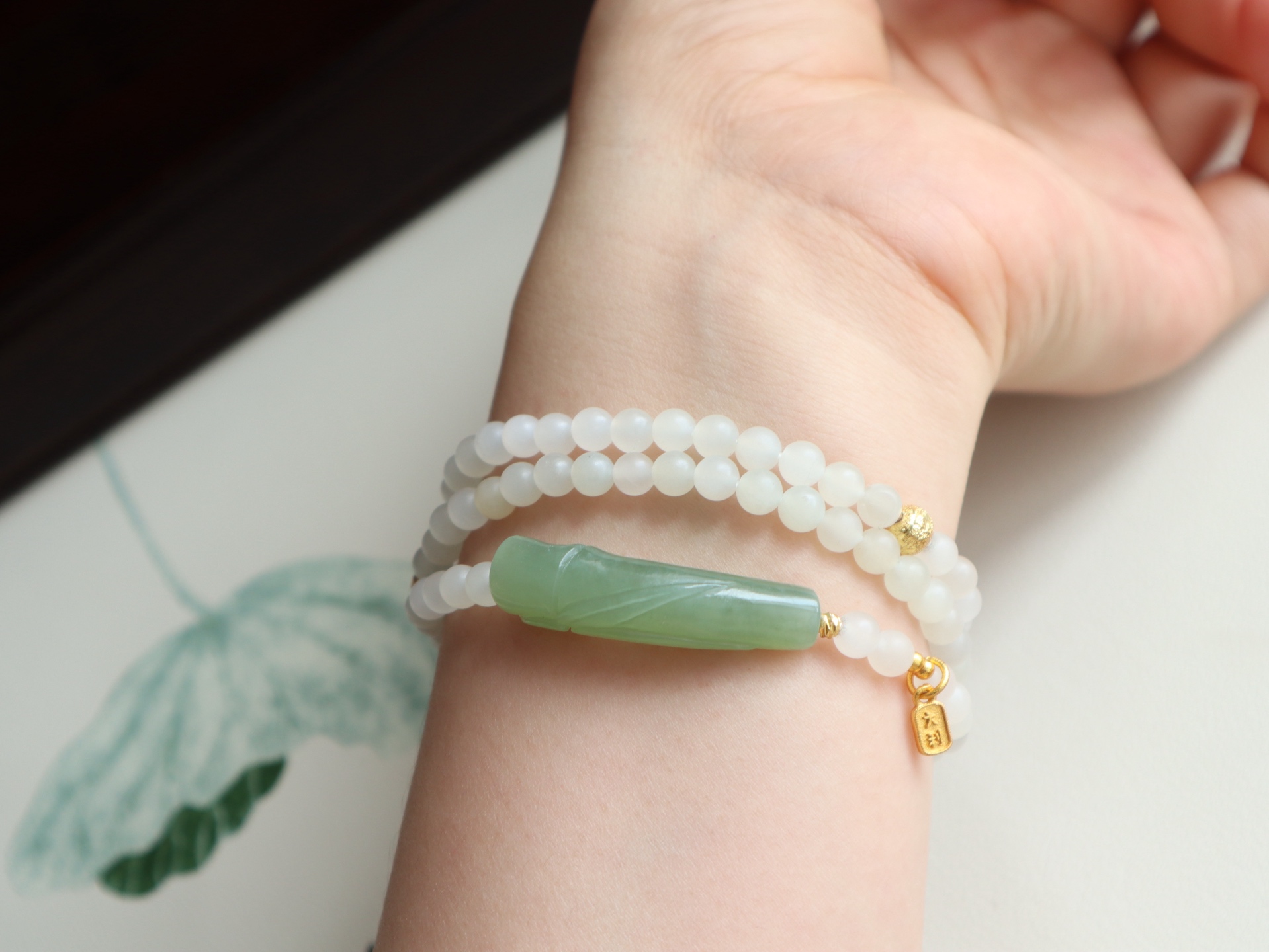 天然和田玉多圈手链,羊脂玉手链,玉质细腻,冰底干净,搭配天然碧玉竹节,古法配饰等,珠子约5+mm