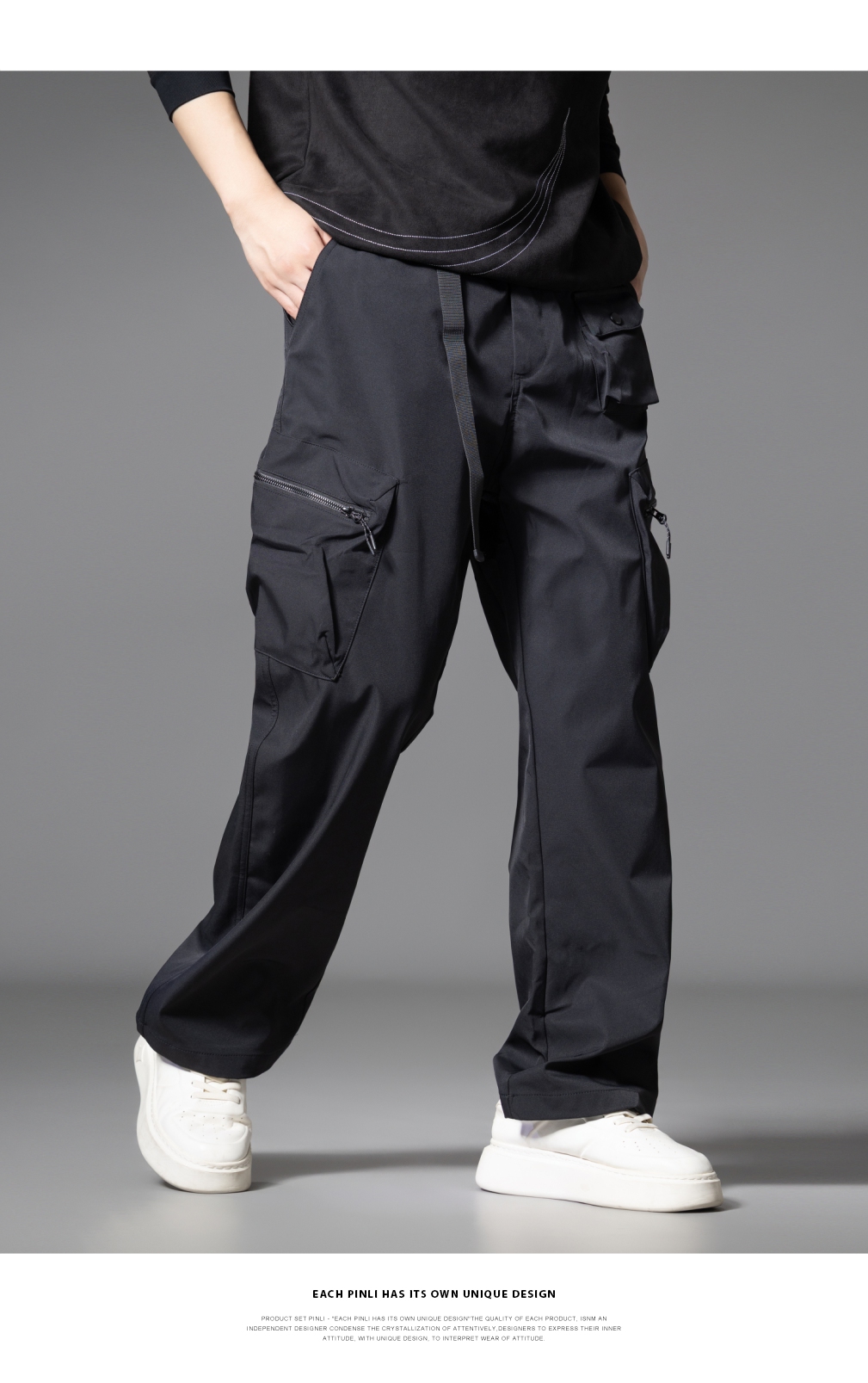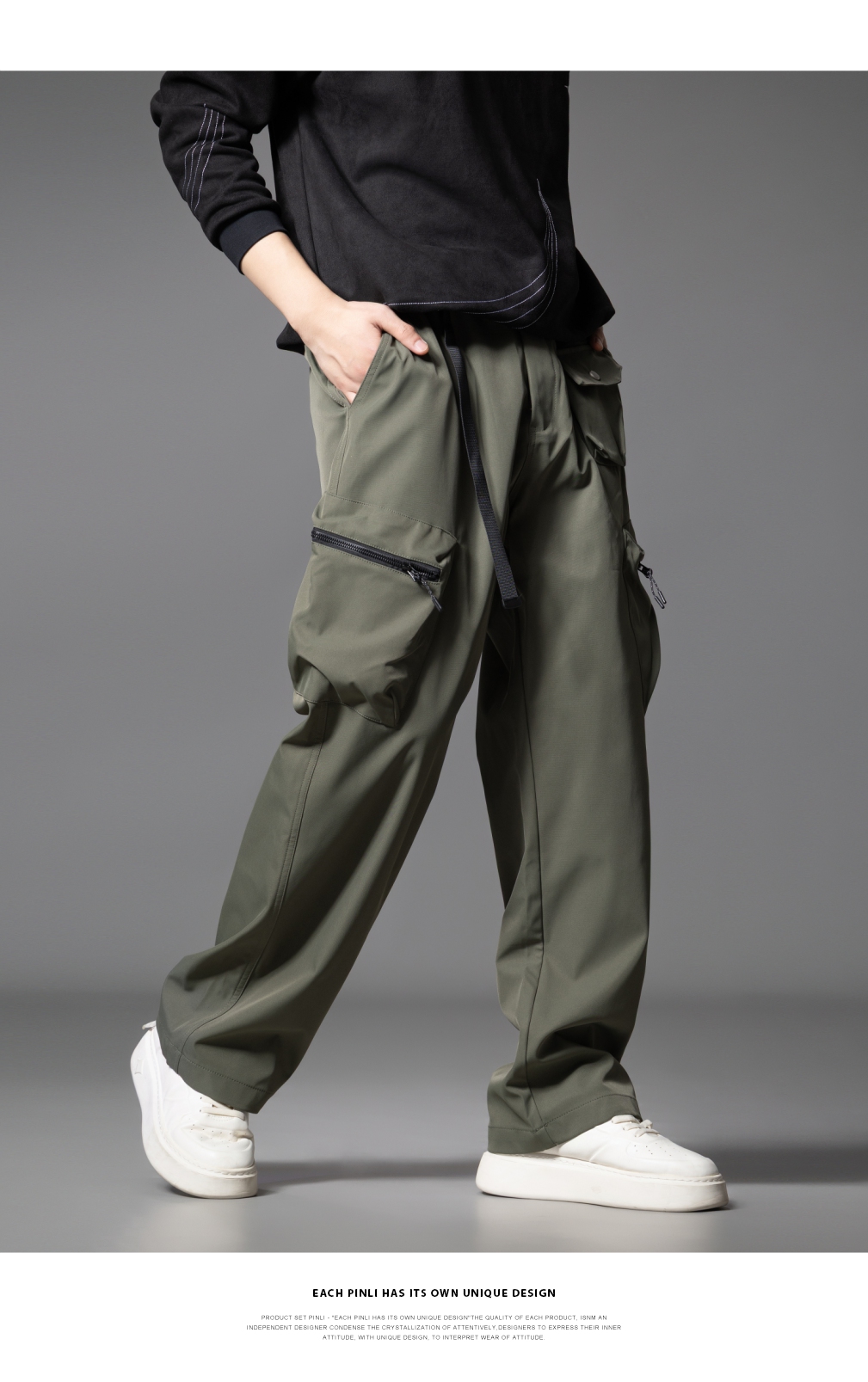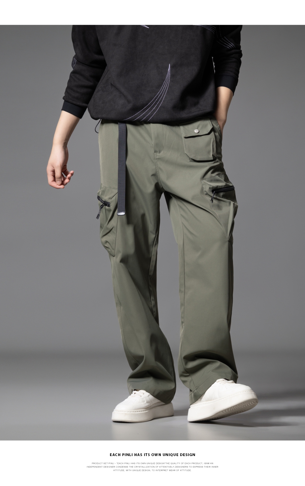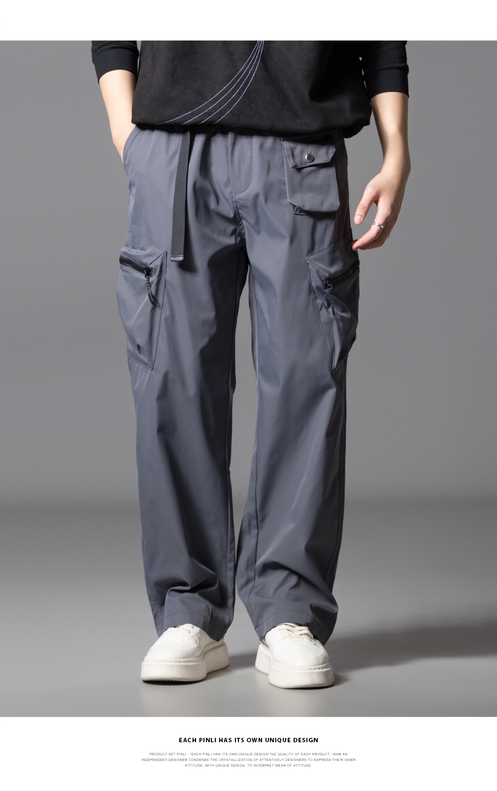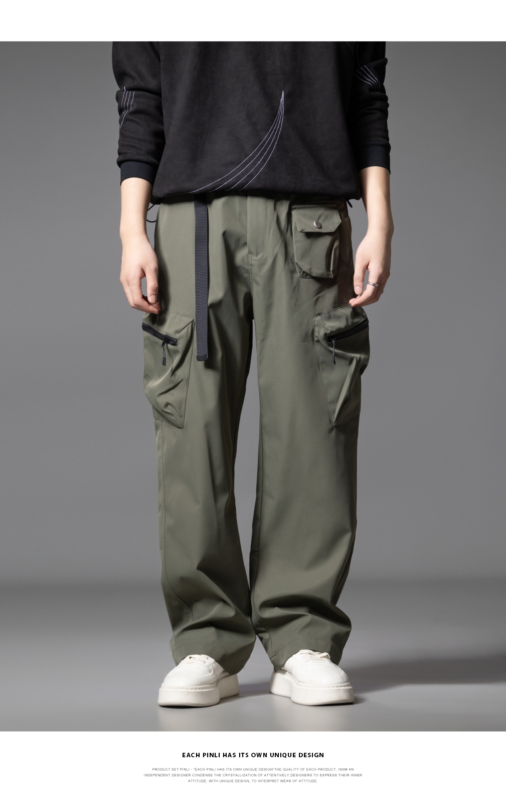 PINLI品立2025秋季新款男士系皮带宽松直筒工装裤多口袋休闲长裤GD253117026