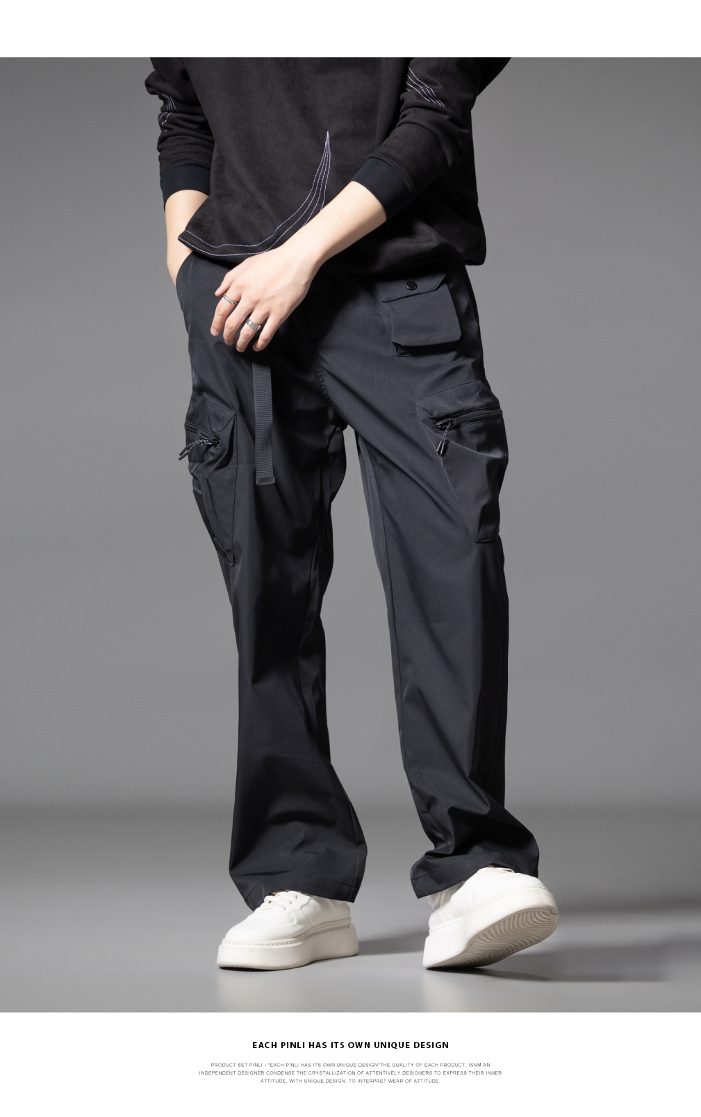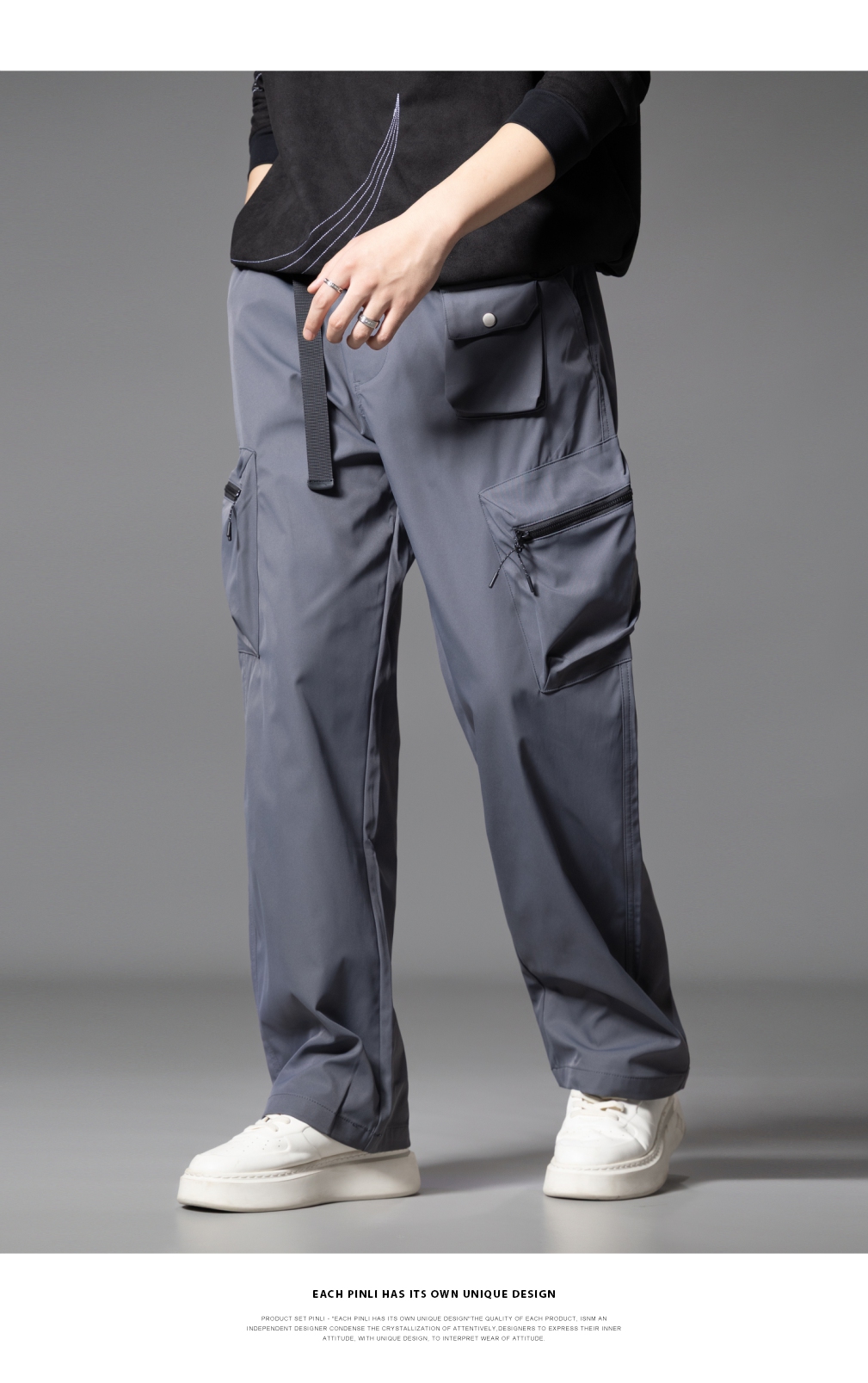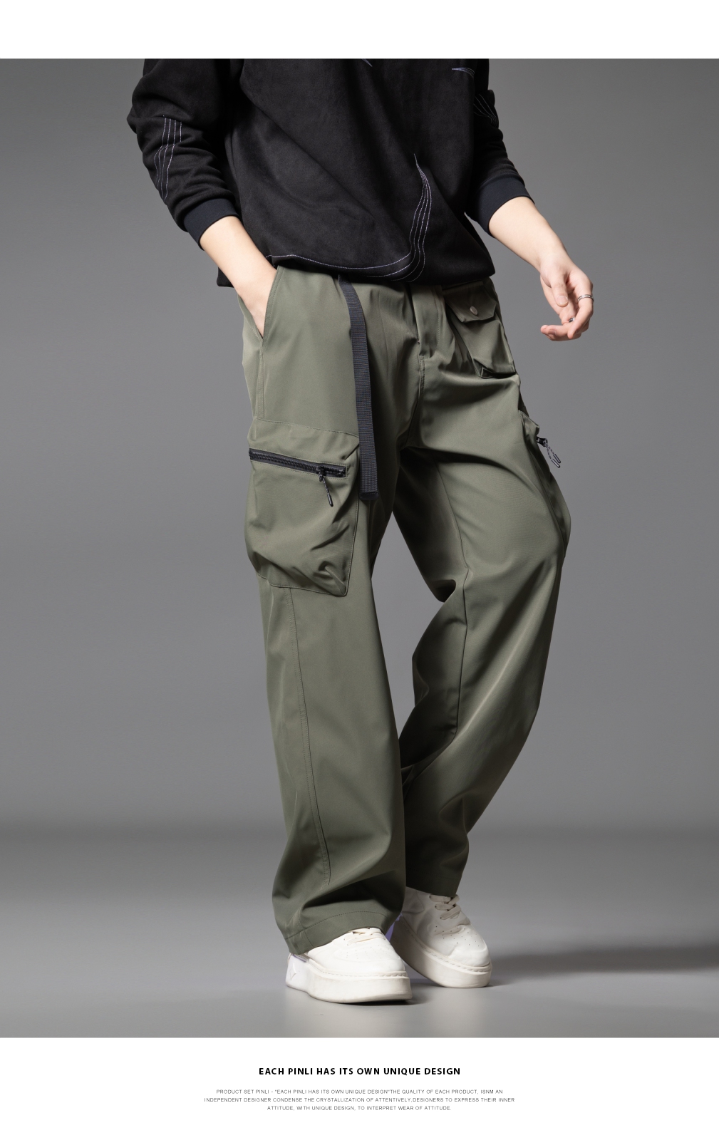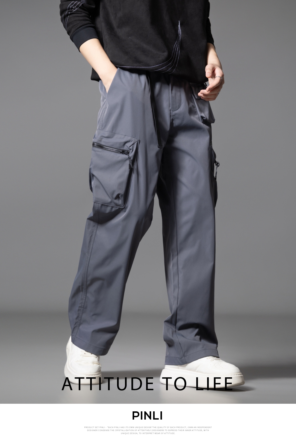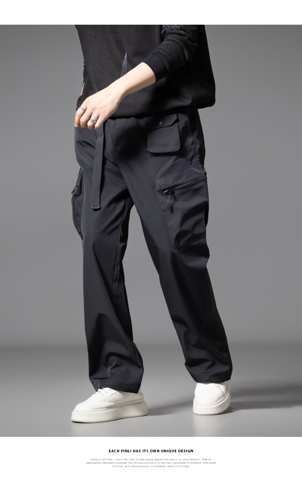 PINLI品立2025秋季新款男士系皮带宽松直筒工装裤多口袋休闲长裤GD253117026