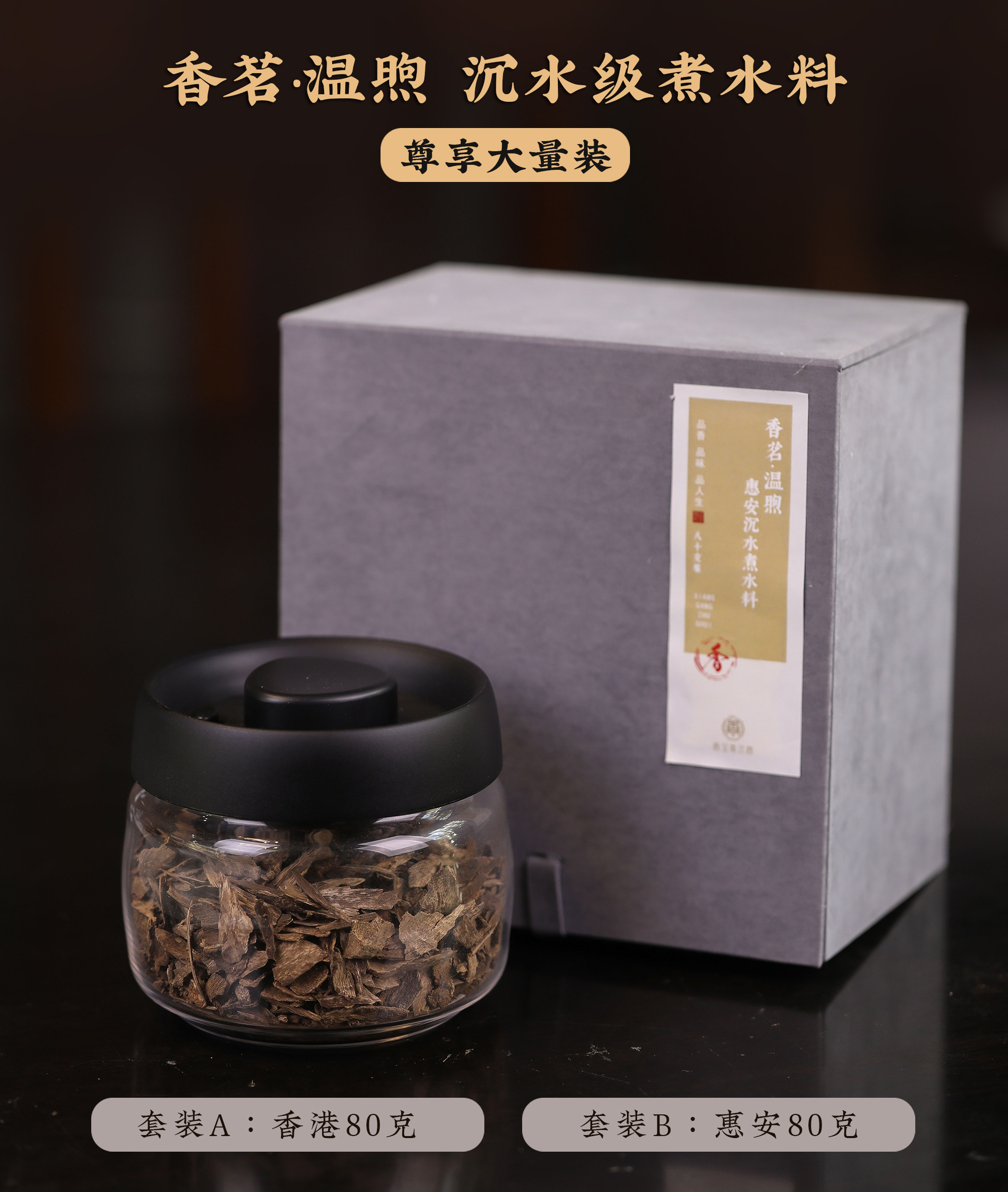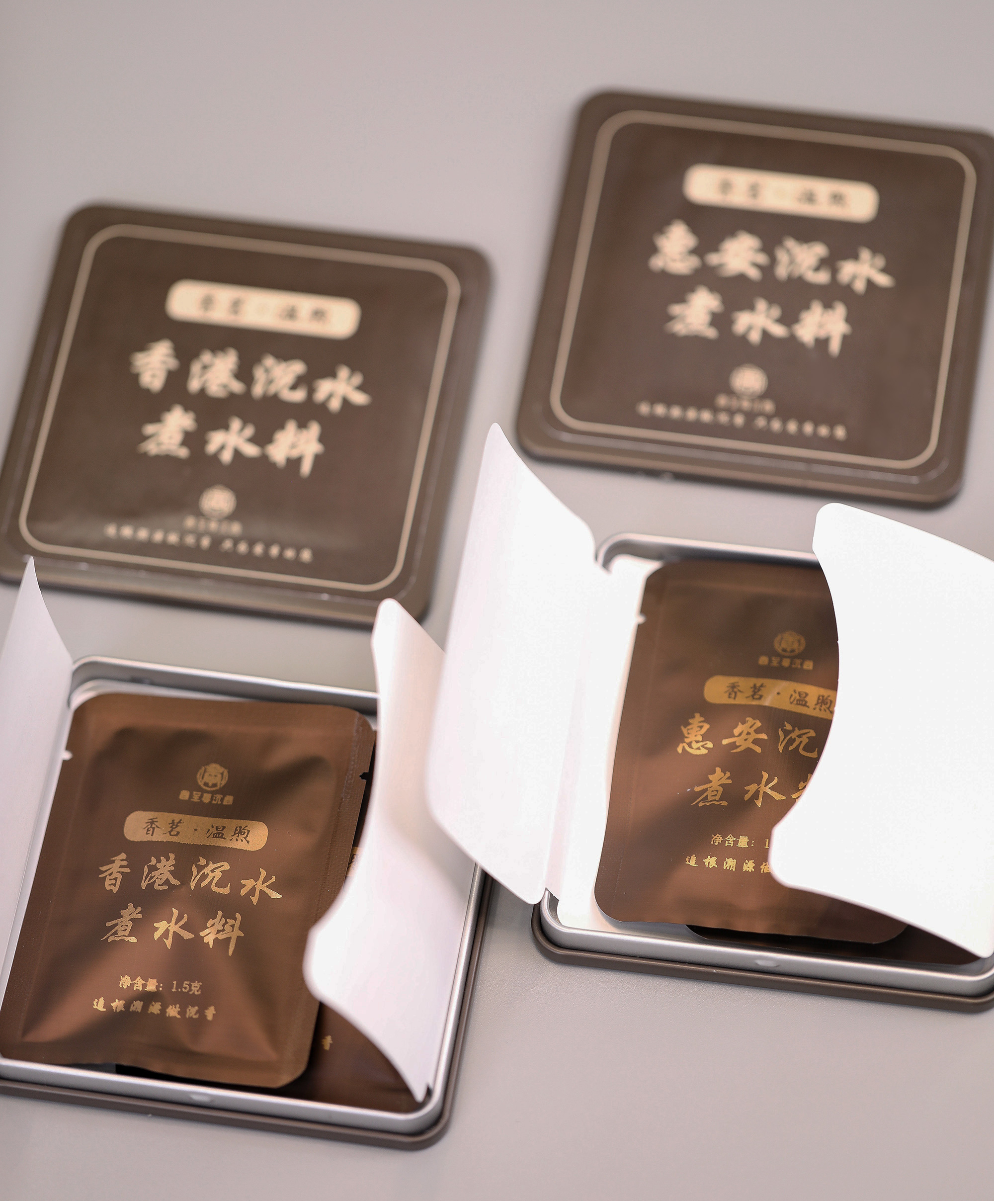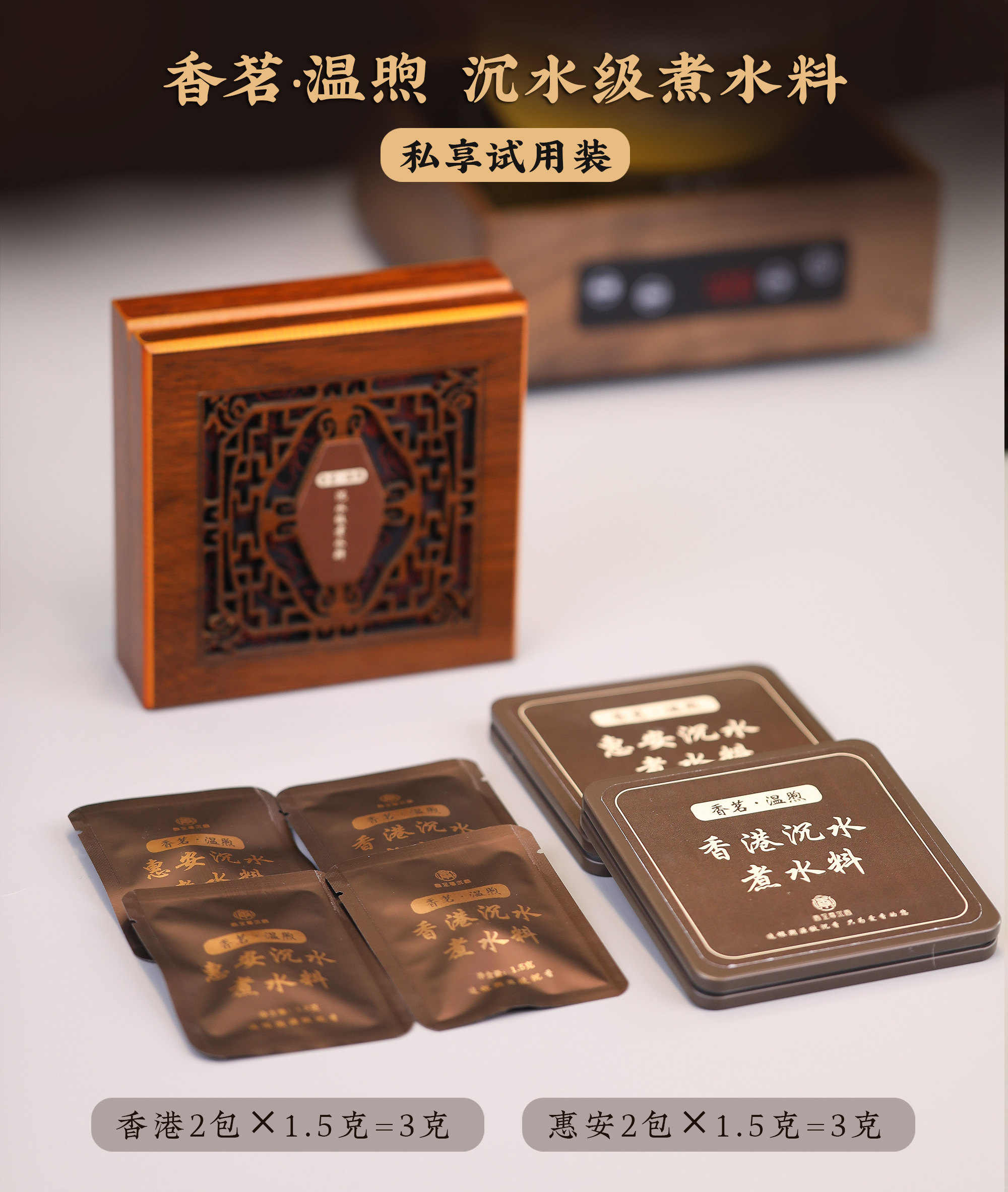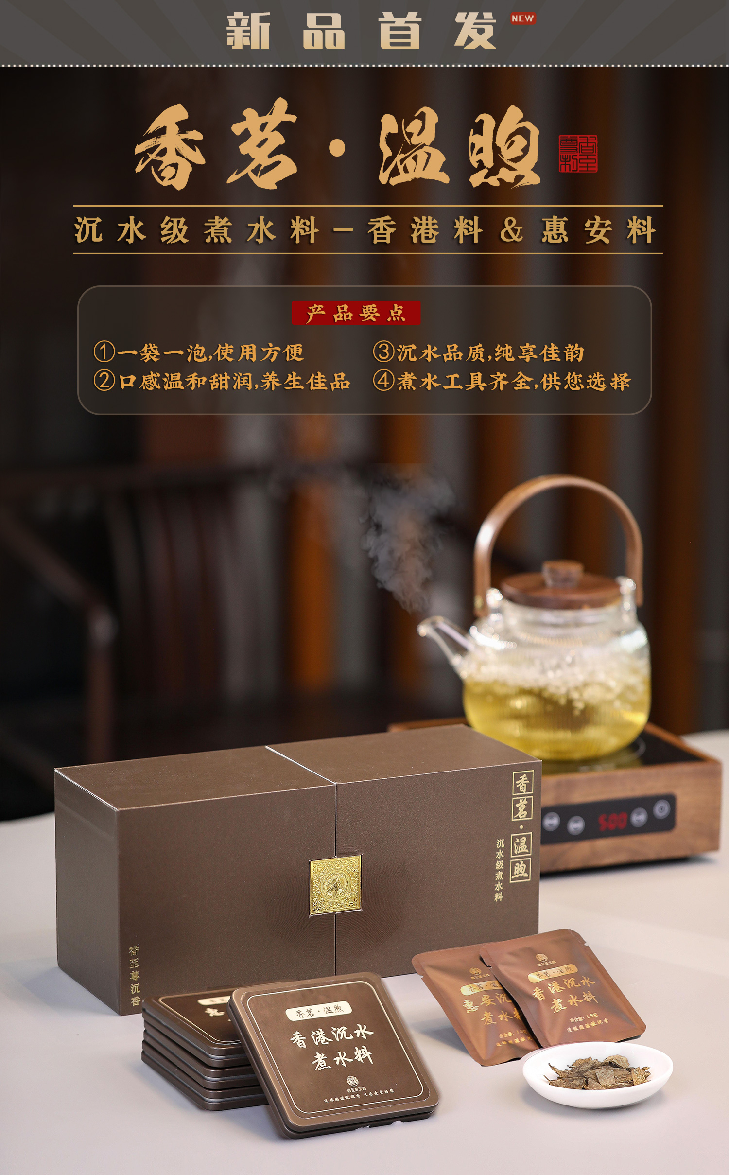 “香茗·温煦”的核心元素,就是两款沉香的煮水料:香港沉香煮水料以及惠安沉香煮水料。