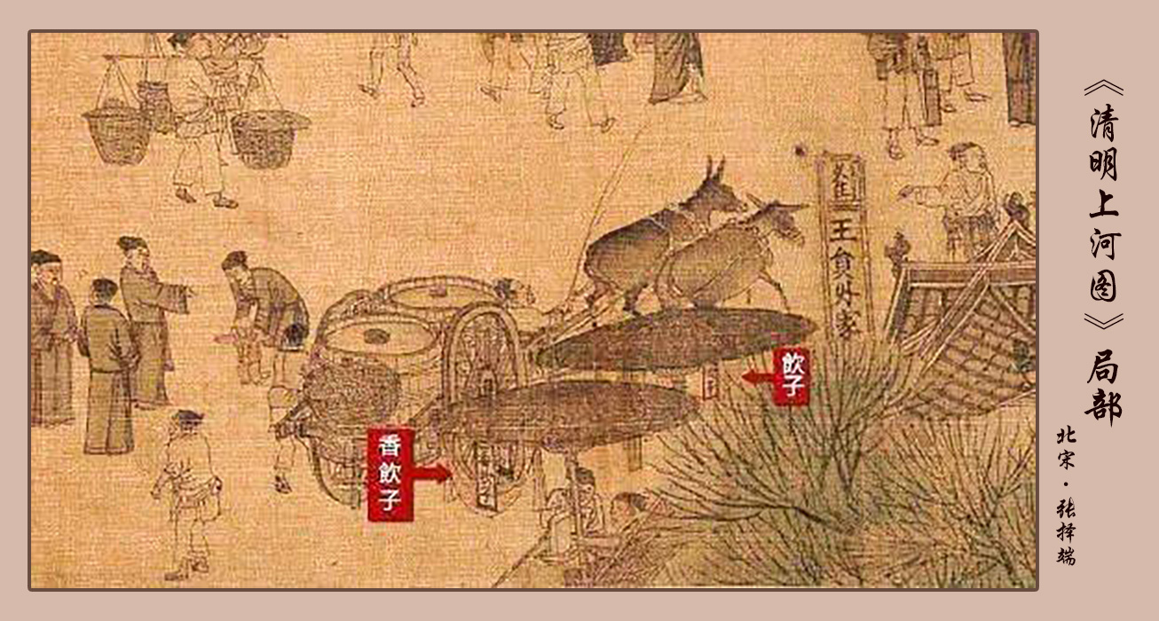 《清明上河图》中,有这么一个细节:“久住王员外家”的门外不远处,支起了两顶太阳伞和一个小摊位,伞上挂着2个招牌,一个是“饮子”,另一个是“香饮子”。