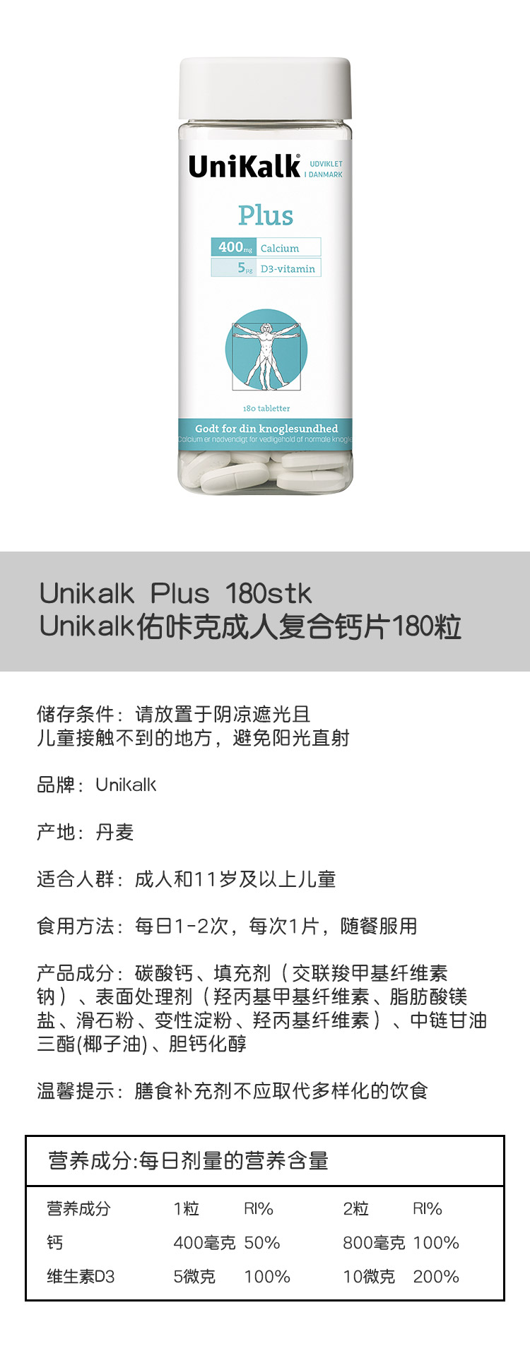 [丹麦]新Unikalk佑咔克成人复合钙片180粒. New!Unikalk Plus 180stk.