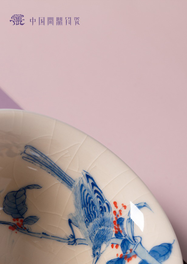 问鼎钧瓷鹅黄青花三才盖碗(喜鹊踏枝)