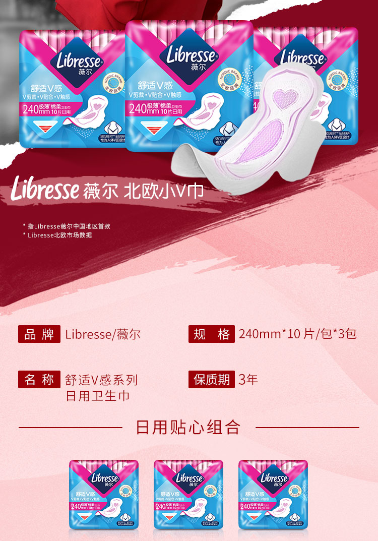 Libresse薇尔舒适V感240日用10片极薄棉柔卫生巾×3包