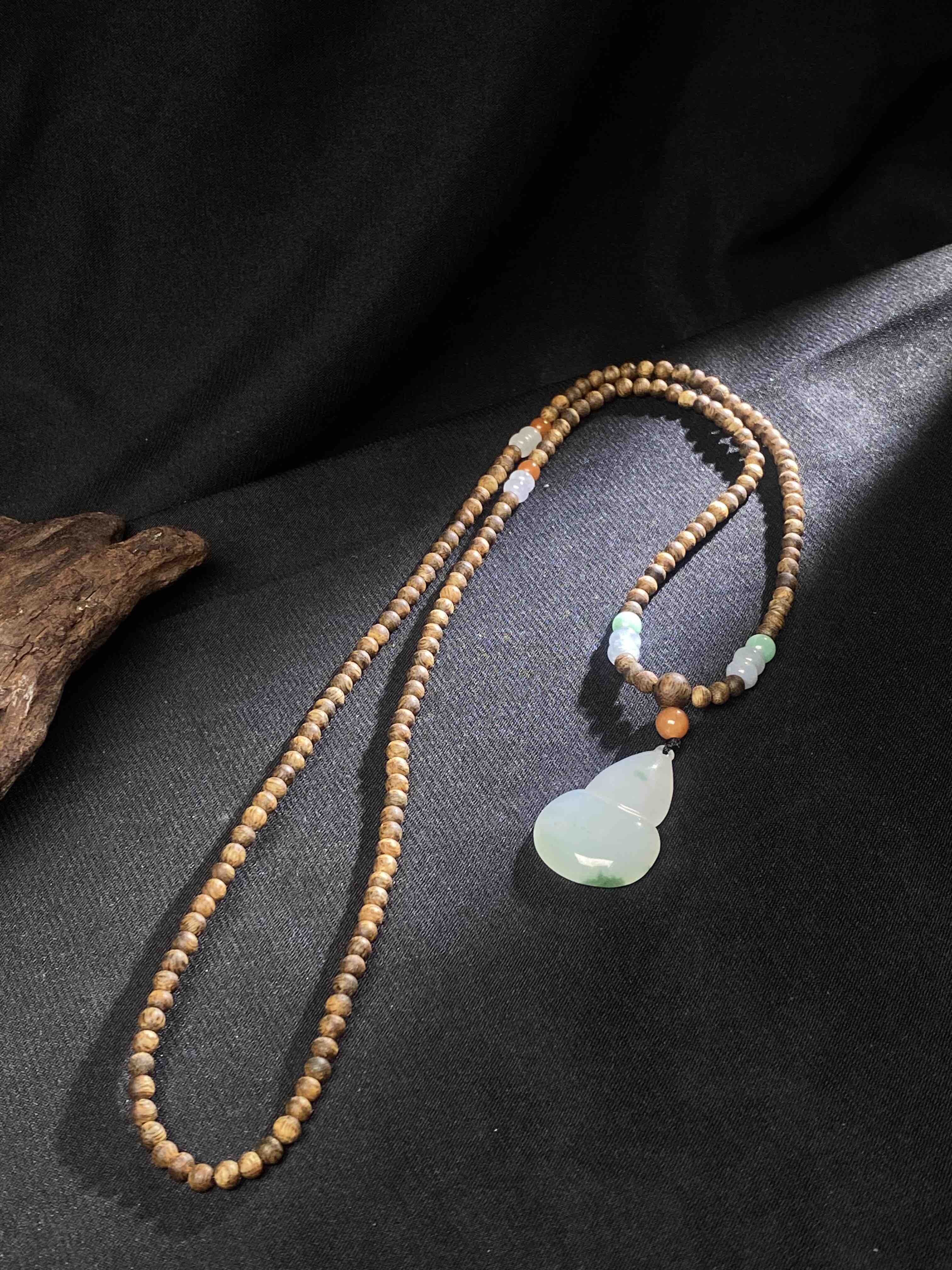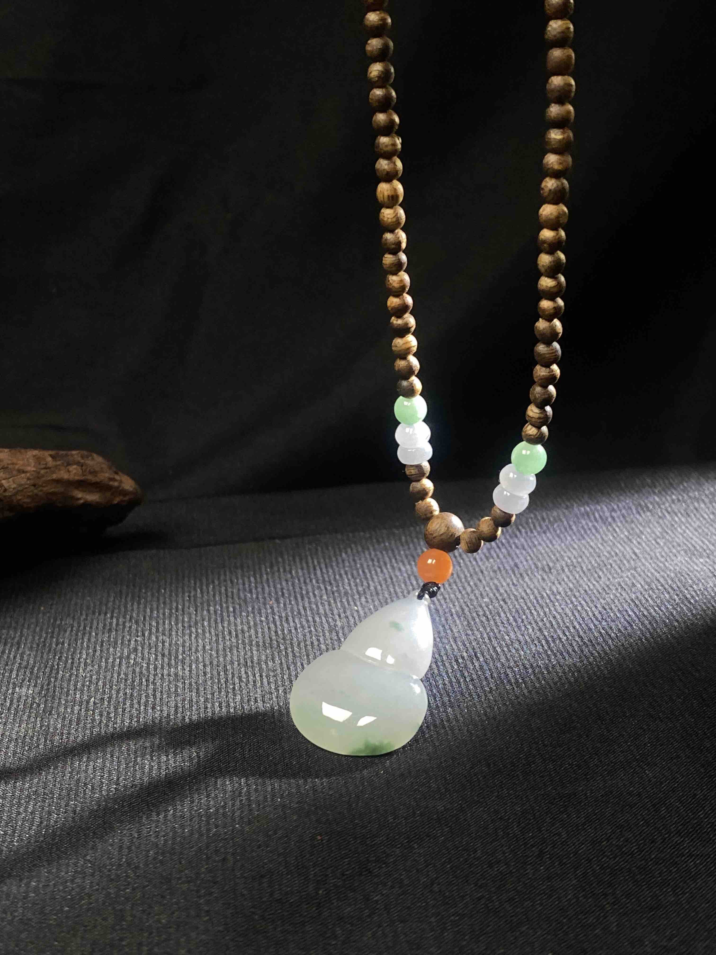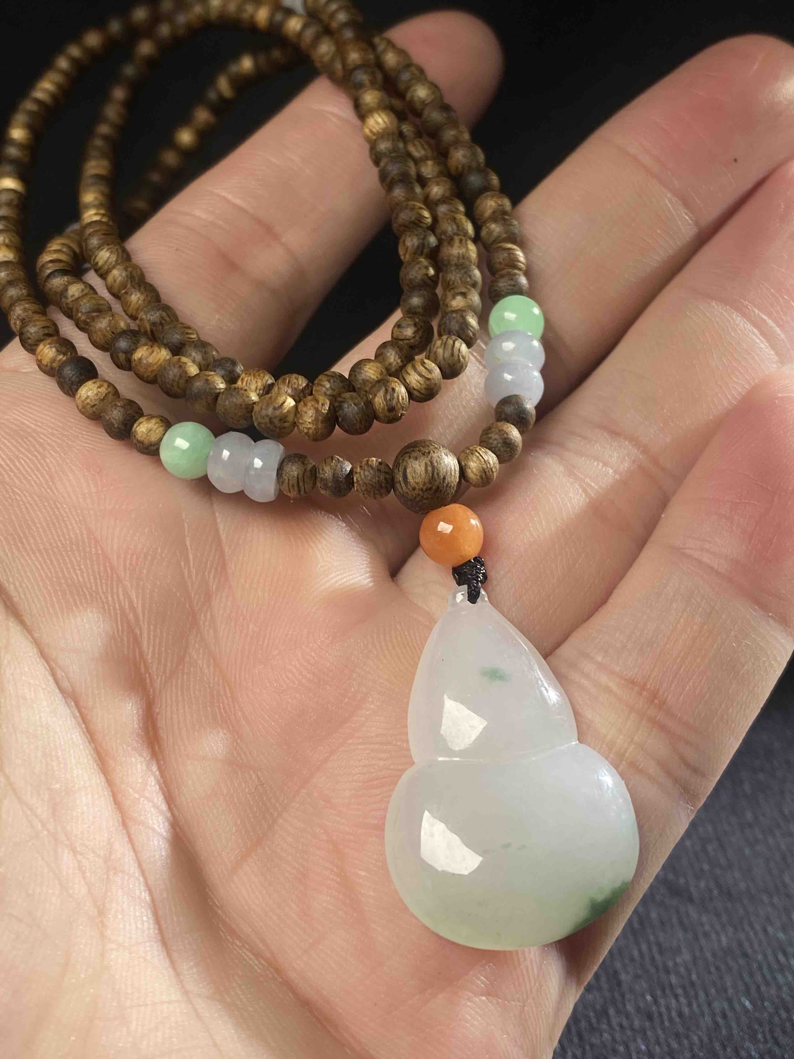 沉香DIY翡翠飘花葫芦挂件,沉香圆珠约3.7mm,链子总长29厘米,原色原味,香味清甜自然,搭翡翠、南红隔珠,配飘花翡翠葫芦,20-29.8-5.6mm,款式精致,意为福禄常伴,三阳开泰,六六大顺。💰799