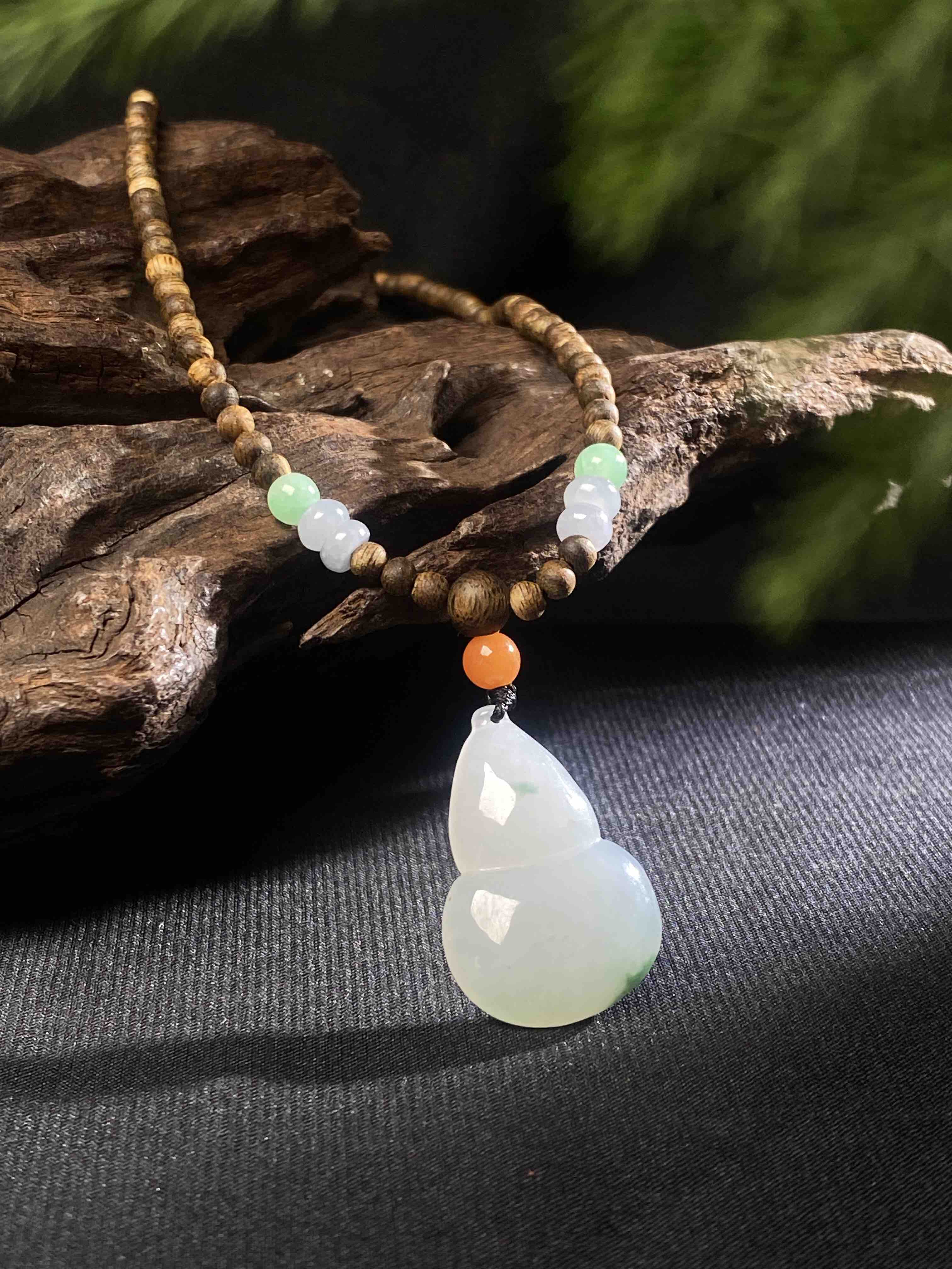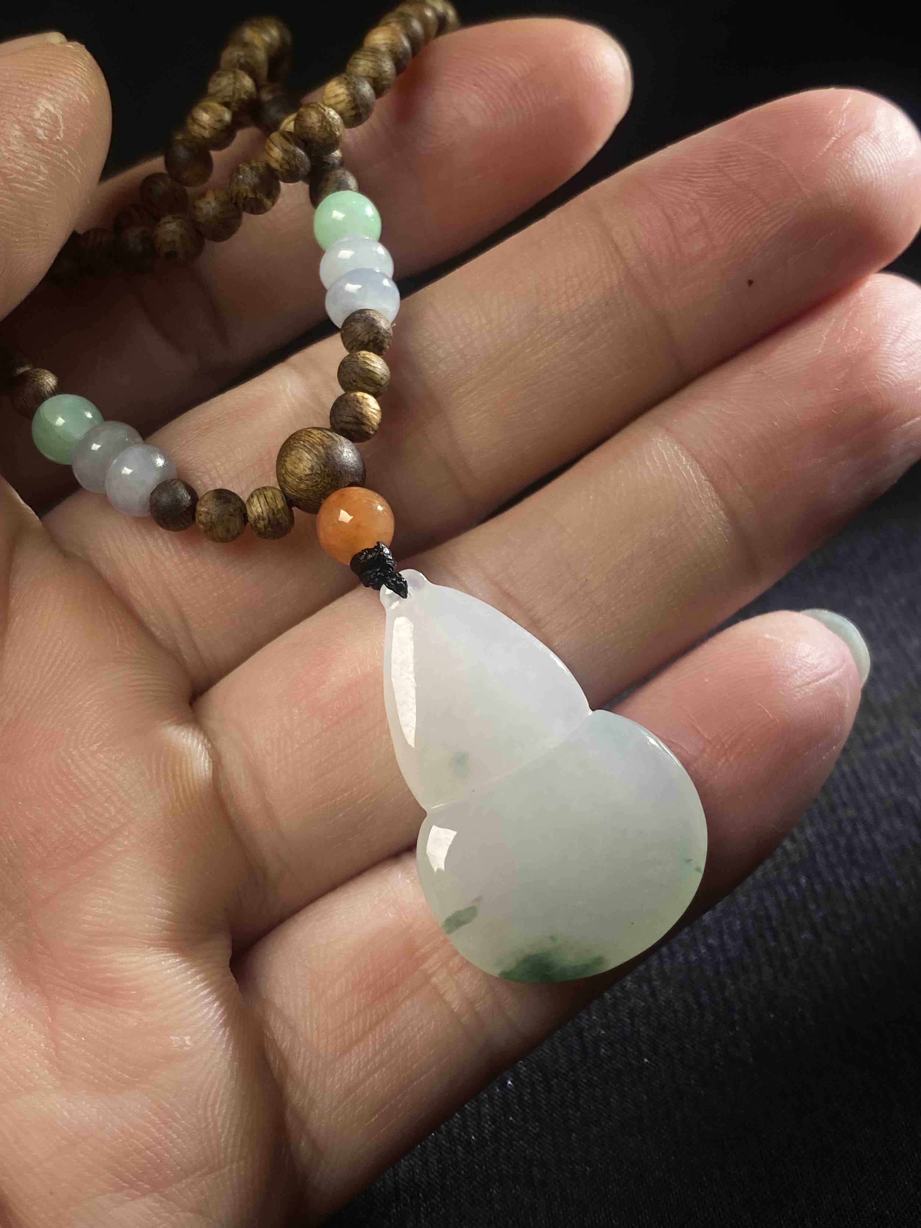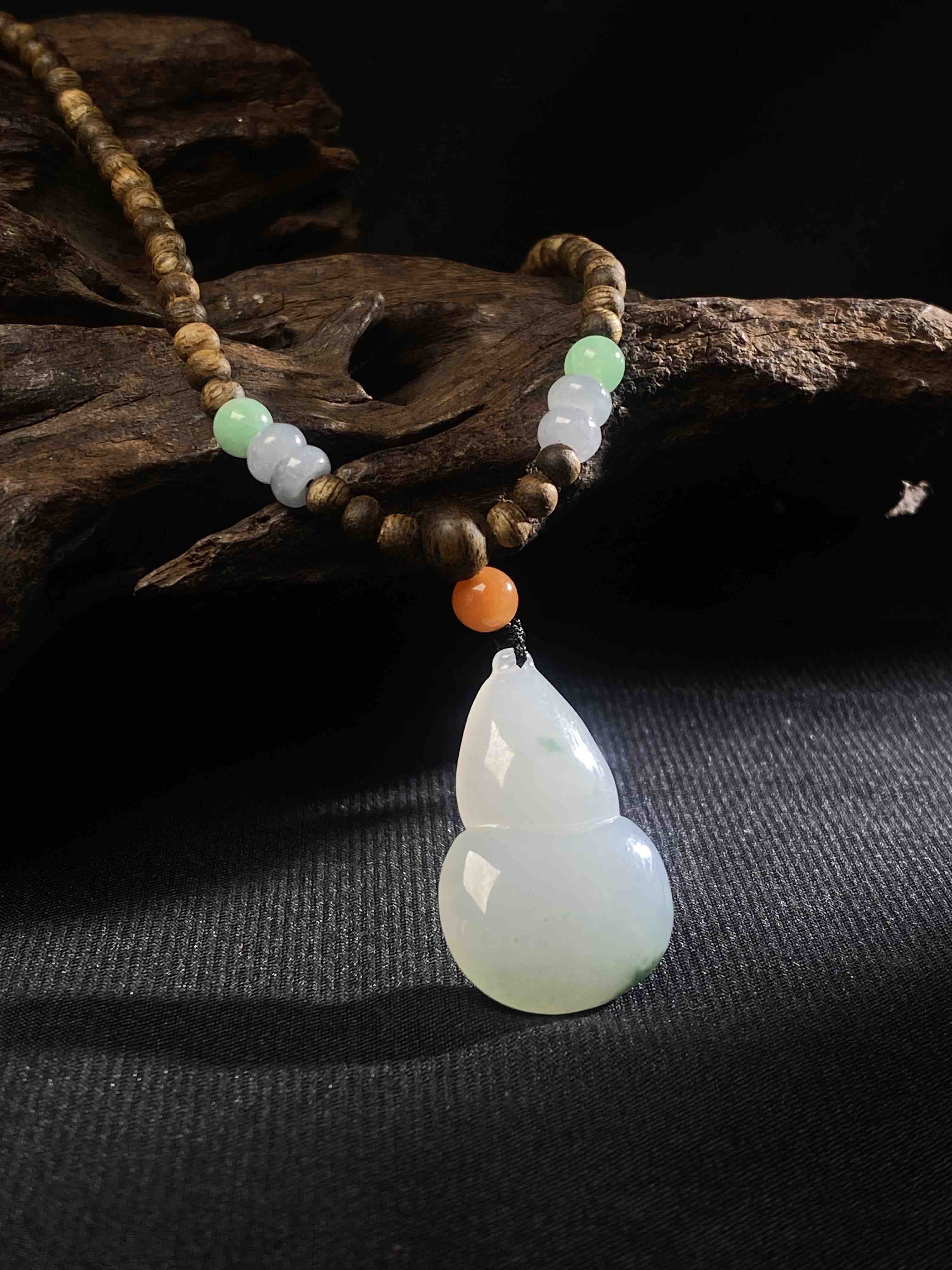 沉香DIY翡翠飘花葫芦挂件,沉香圆珠约3.7mm,链子总长29厘米,原色原味,香味清甜自然,搭翡翠、南红隔珠,配飘花翡翠葫芦,20-29.8-5.6mm,款式精致,意为福禄常伴,三阳开泰,六六大顺。💰799