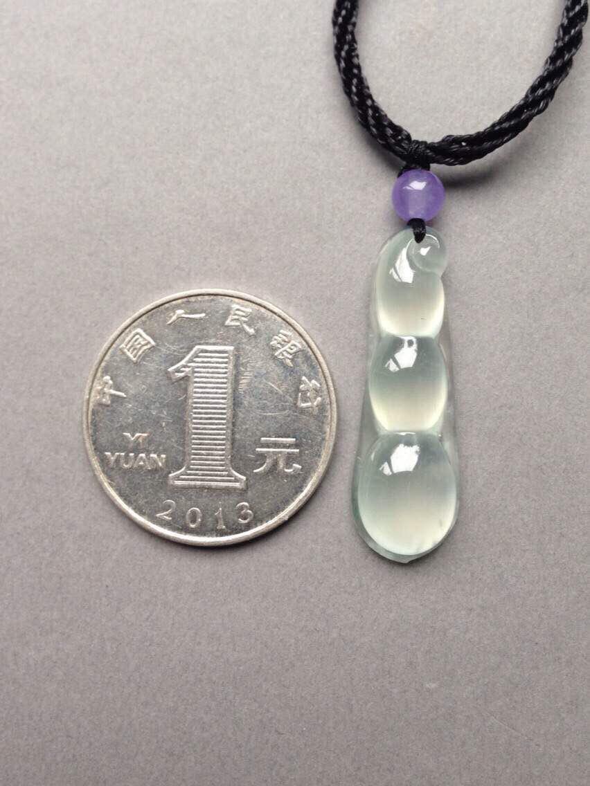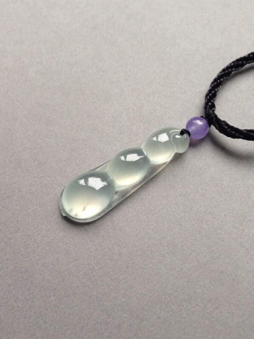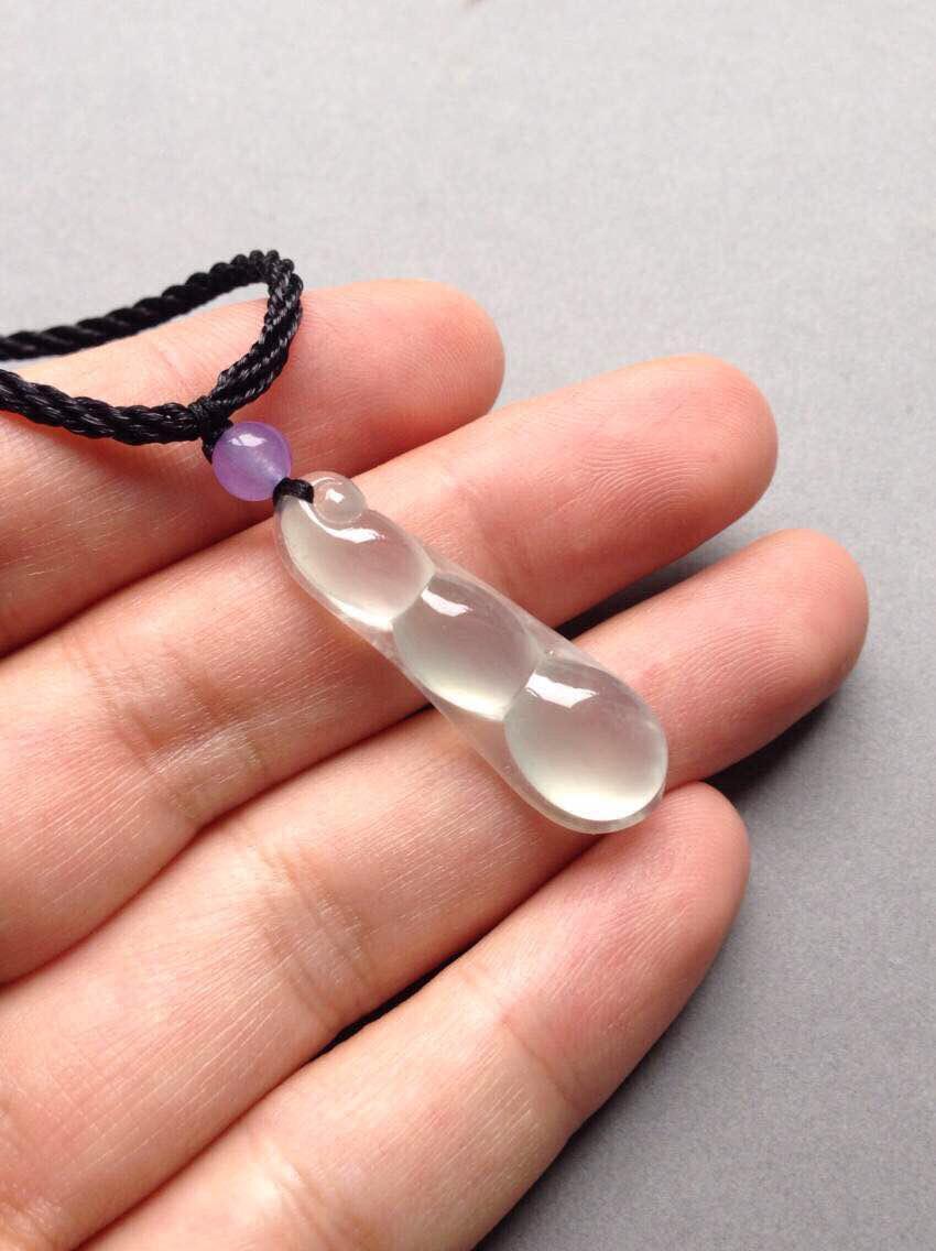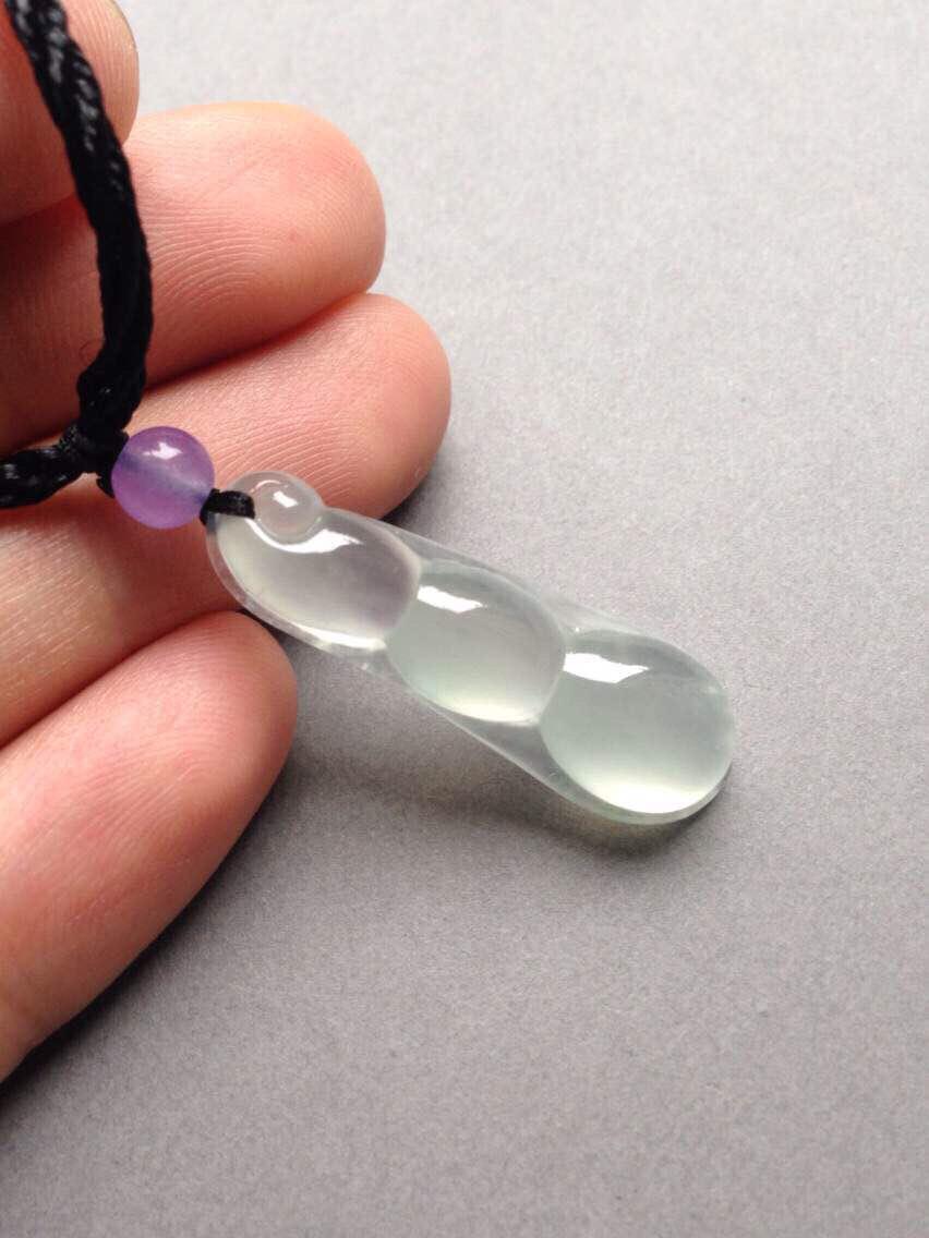 玻璃种福豆,四季平安,32.3*10.4*5.9mm。亮度棒极,阳光下闪到爆,种水贼好,寒气逼人,尺寸饱满,豆粒颗颗动人心魄,底部一颗棉里面隐着点暗纹,不影响。让人无法拒绝的高货,实物超级漂亮,随便五位数的东西,我们才四位数,性价比绝了