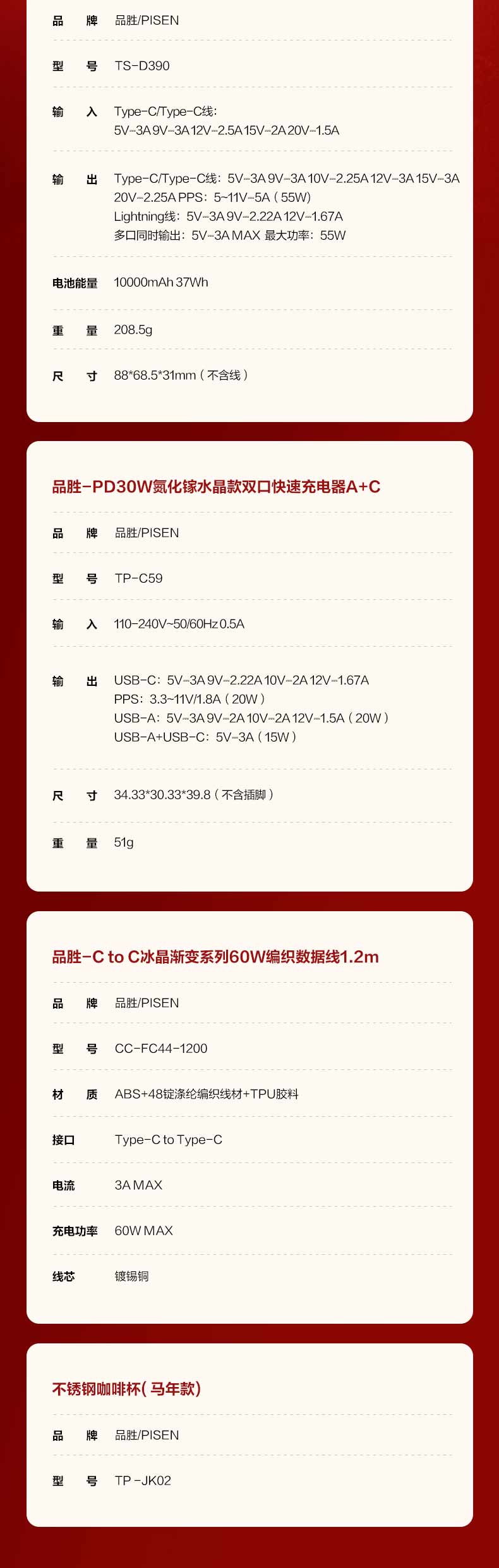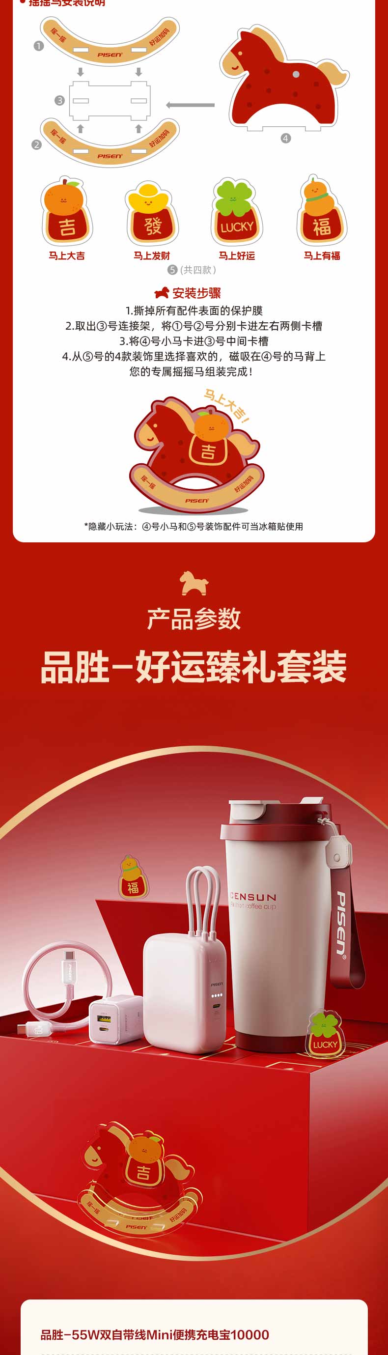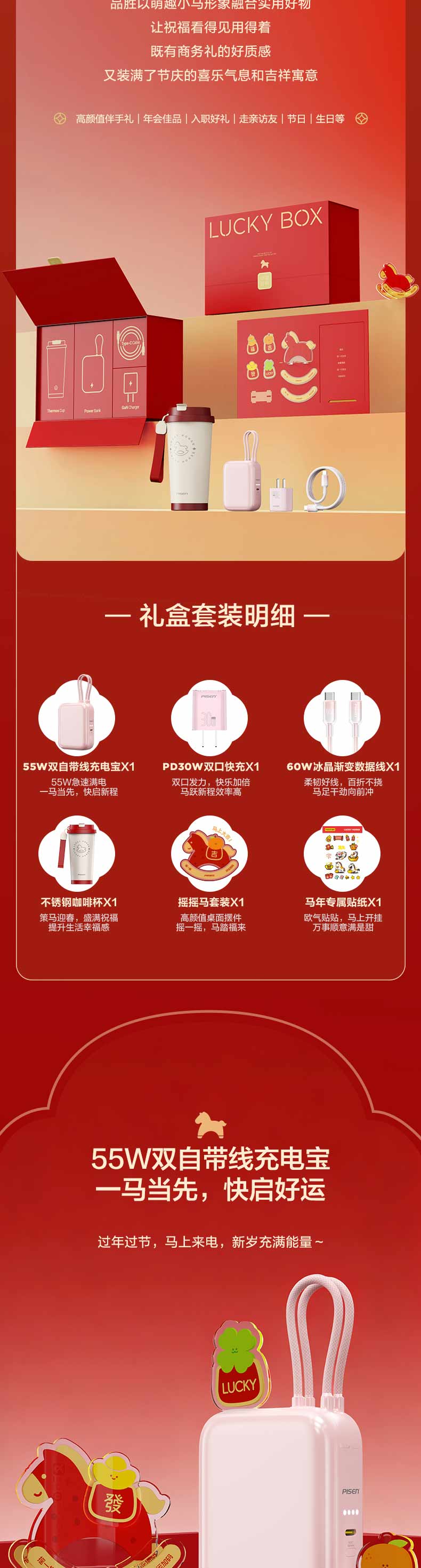 品胜 新年礼盒套装 送礼 数码礼包 55W双自带线充电宝+马年水杯+PD30W充电器套装