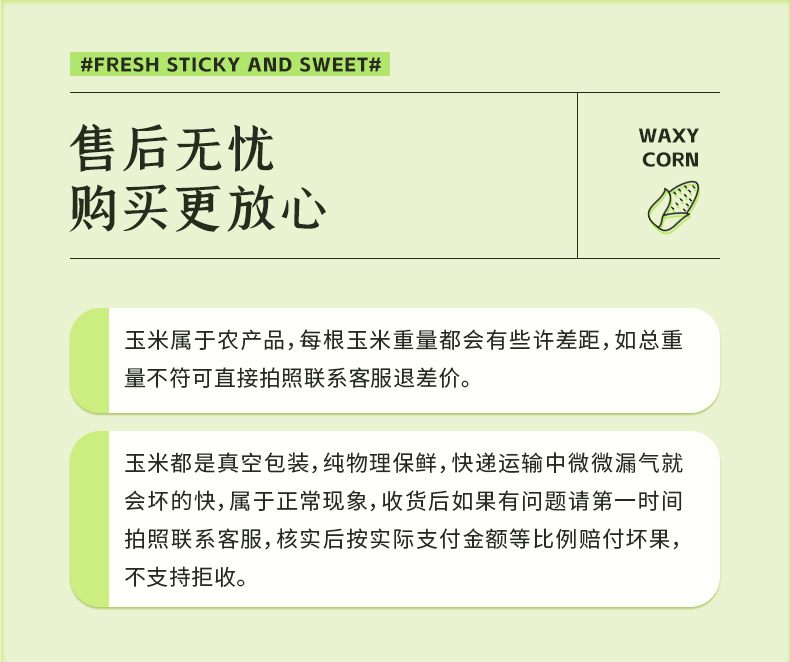 | 【品名】农福翁东北黄糯玉米 【规格】 170-200g*10支(小棒) 220g-250g*8支(中大棒) 【保质期】12个月 【储存方式】置于常温阴凉干燥处、避光保存 【产地】黑龙江 【发货地】黑龙江 【发货快递】圆通,韵达 【不发货区域】新疆、西藏、海南、港澳台地区不发 【补邮费地区】北京、上海、内蒙、青海、甘肃、宁夏、云南、贵州、四川、重庆+1元 【发货时效】48小时,周末节假日顺延 |