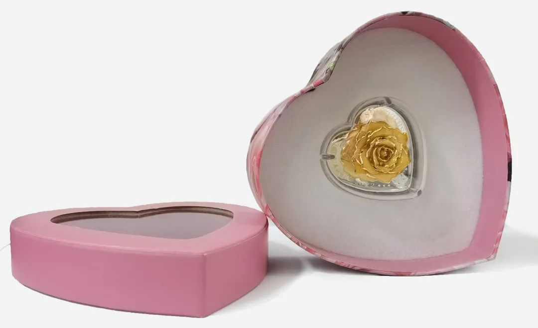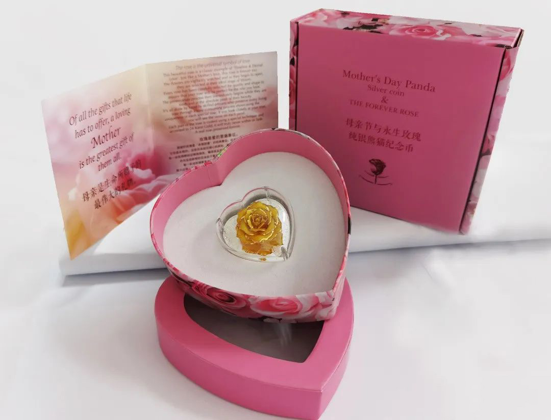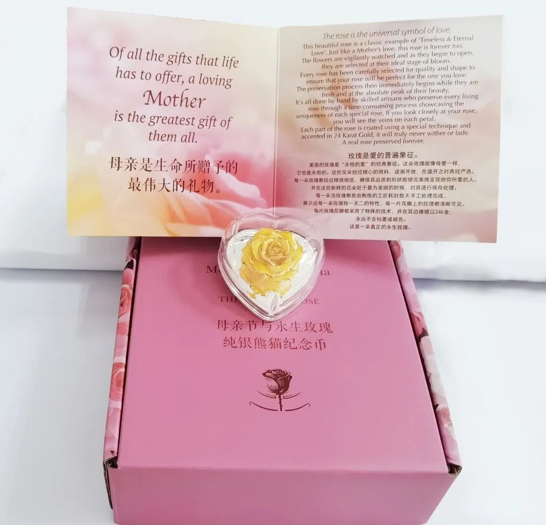 2022年“母爱永恒与永生玫瑰”1盎司纯银熊猫纪念币(简称母亲节纪念币)由坦桑尼亚银行批准铸造,为坦桑尼亚法定货币。(将真玫瑰塑干镀金切合在银币之上)