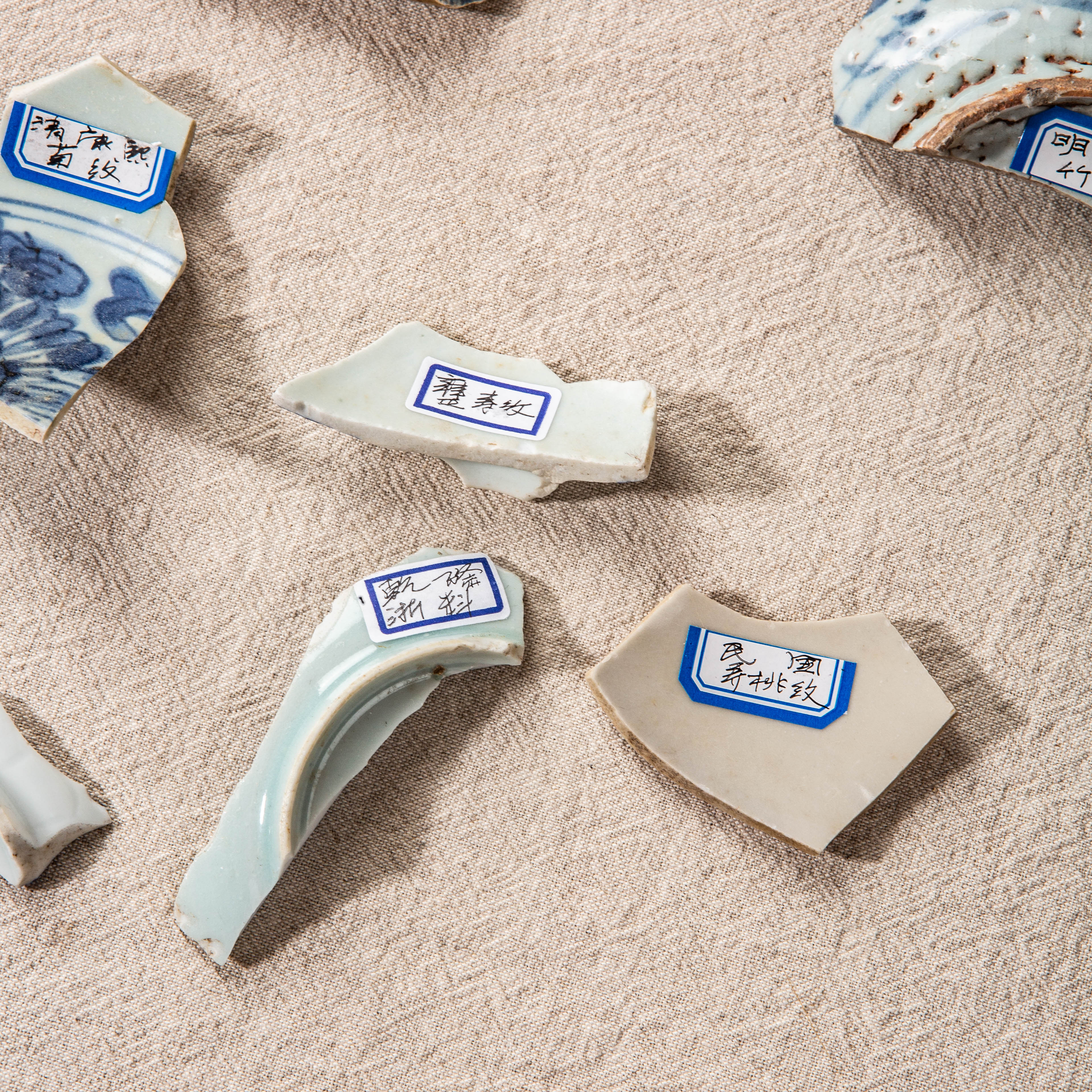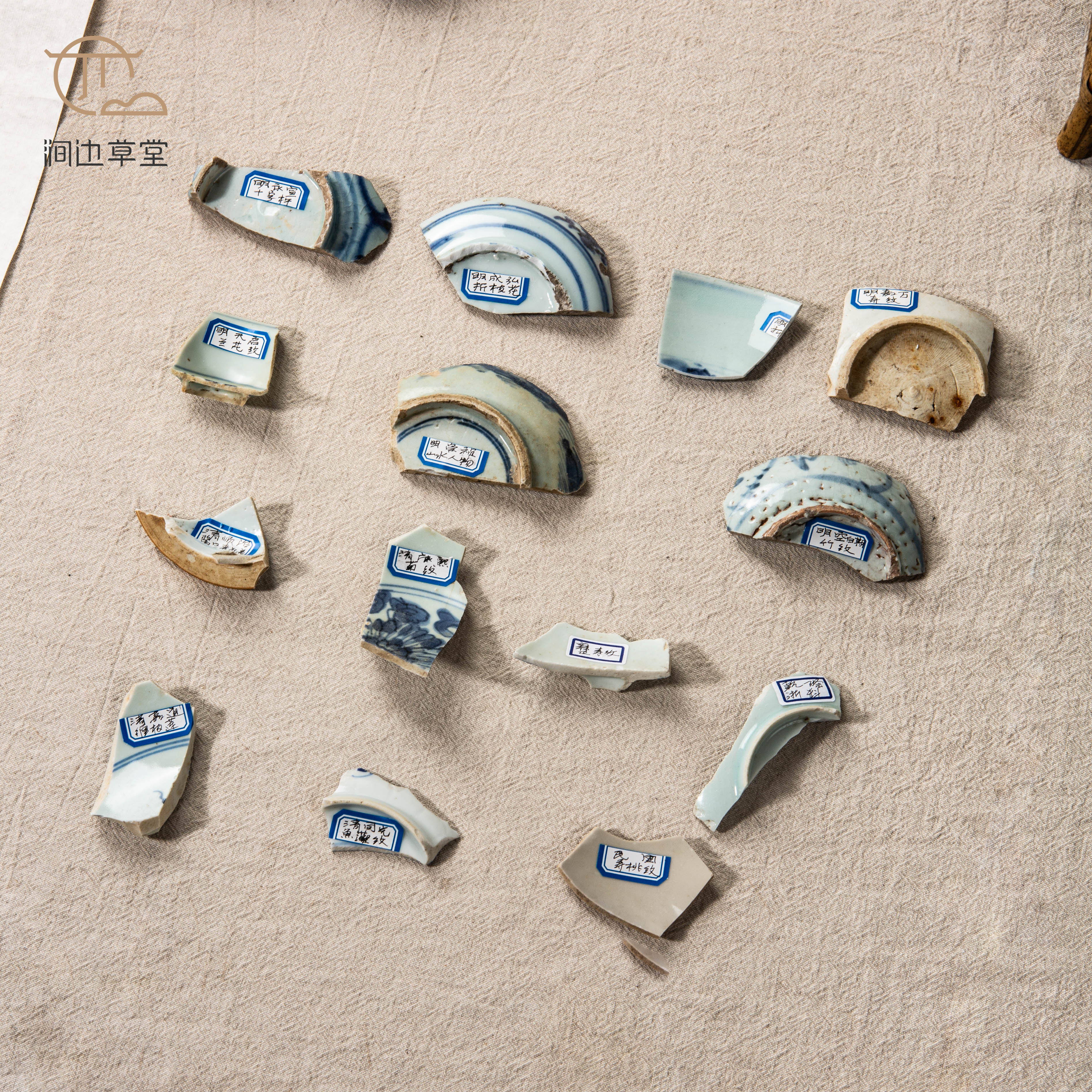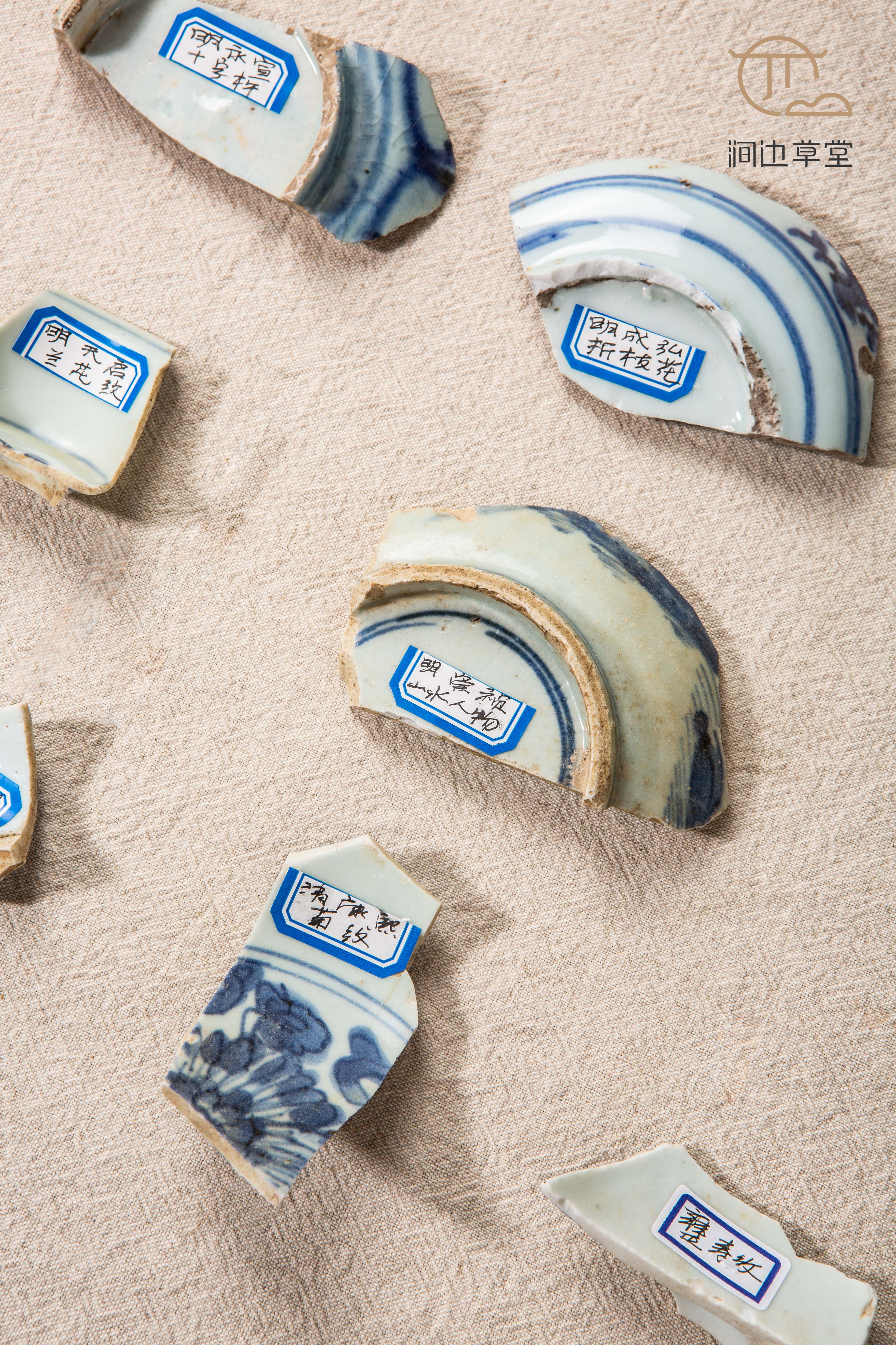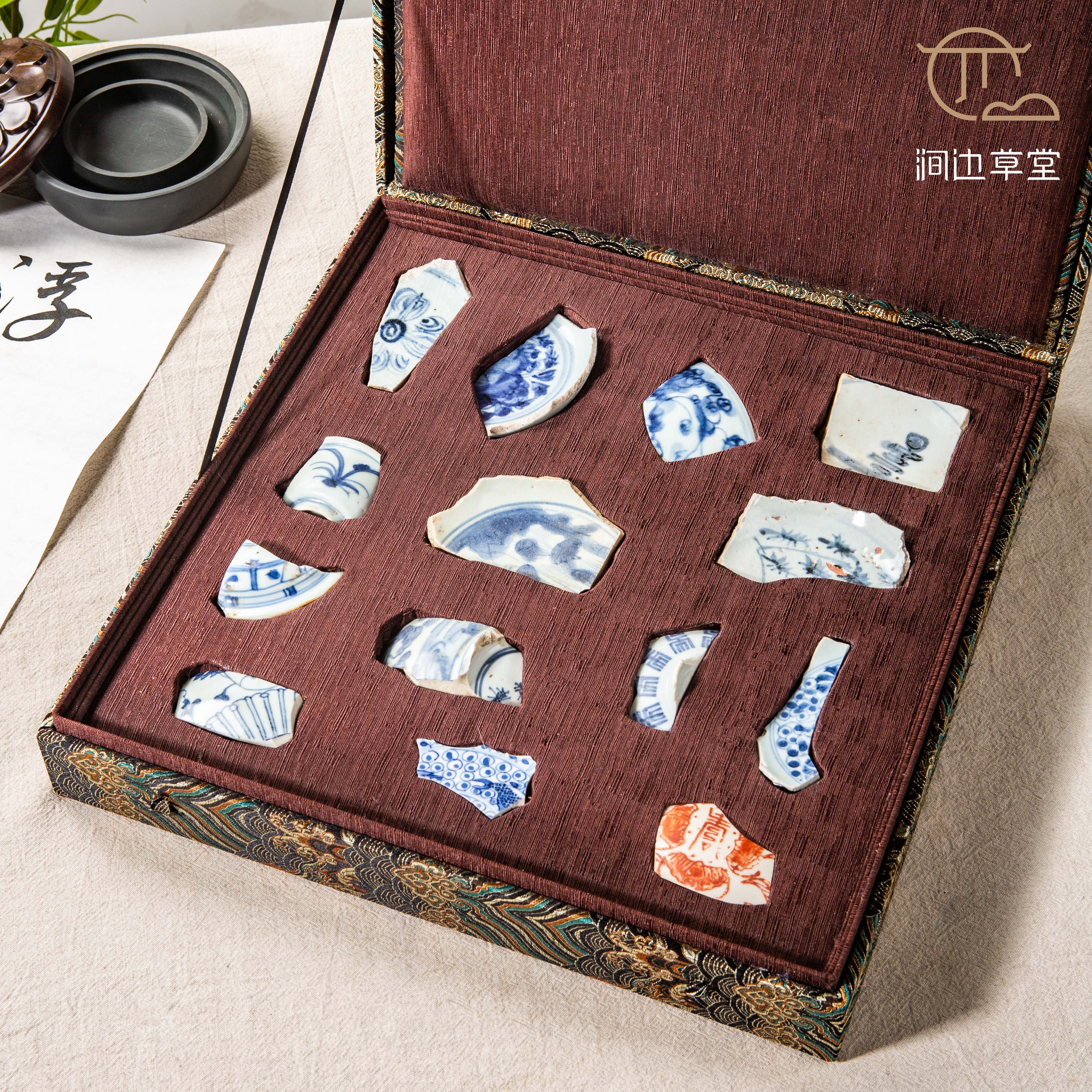 明清青花瓷标本全套,一套14片,分别是:明永宣时期十字杵、明成弘时期折枝花、明正德时期折枝花、明嘉万时期寿纹、明天启时期兰花纹、明崇祯时期山水人物、明空白期竹纹、清顺治时期酱口青花盖、清康熙时期菊纹、清雍正时期寿纹、清乾隆时期浙料、清嘉道时期缠枝莲、清同光时期鱼藻纹、民国时期寿桃纹,是学习明清瓷器的优良范本,配有高档锦盒,同时也是收藏佳品。