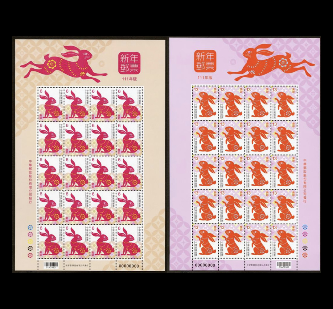 本套邮票图案以「富贵圆满喜迎春」为设计概念,面值 6 元邮票表现的是静坐的兔子象征静待与期盼,迎接新年新希望。
