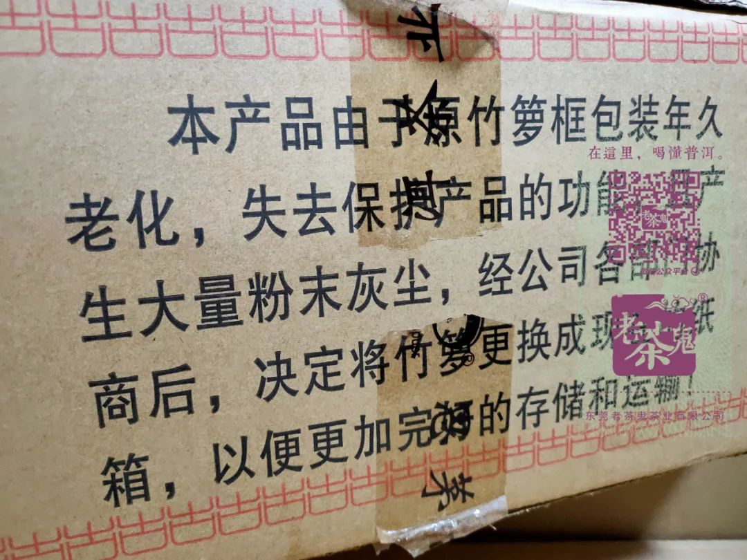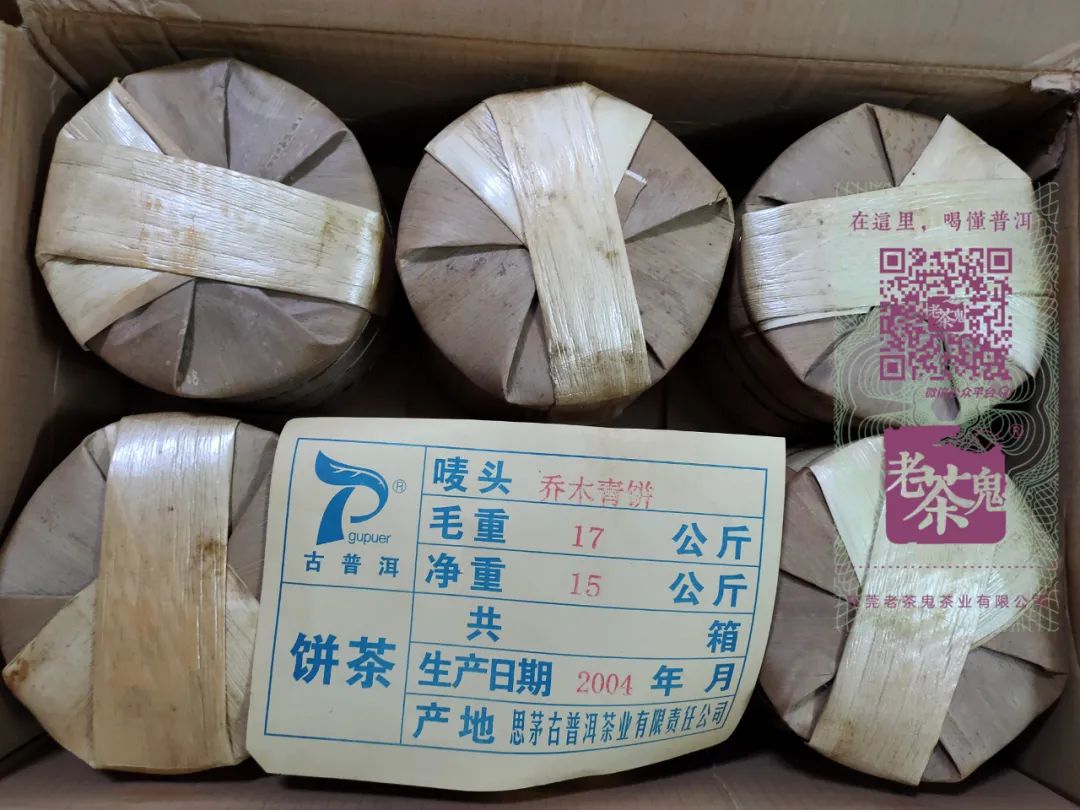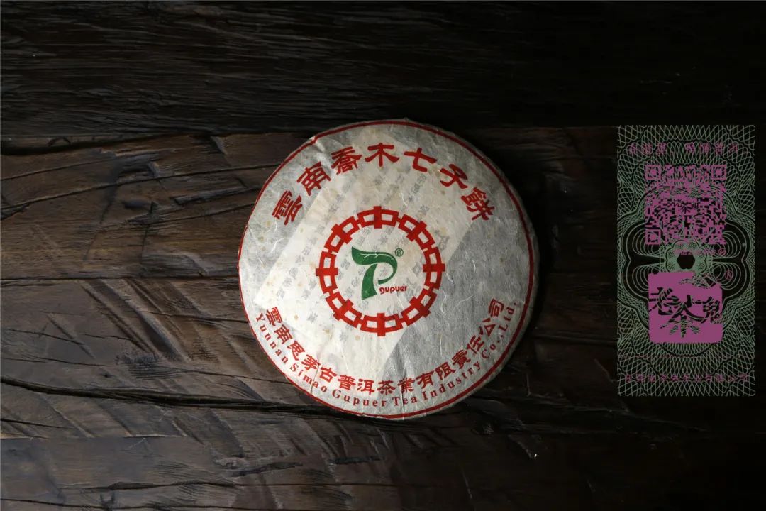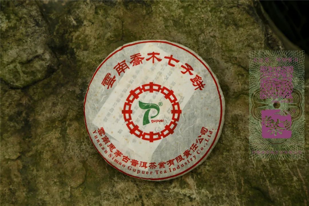 古普洱·云南乔木七子饼是一款有故事的茶。2004年,马来西亚南洋华兴茶有限公司订做了这款茶,总数300多件,由王霞主导制作并且采用的是勐海茶厂7542配方。由于各种原因,南洋华兴茶有限公司当时只提走了50多件货,剩下的就留在了厂部。2018年,古普洱现任董事长李会娟参与整理仓库时,发现该茶的原竹筐老化并产生大量粉尘,所以决定将这批库存茶全部换成纸箱,并亲笔签字作为证明。