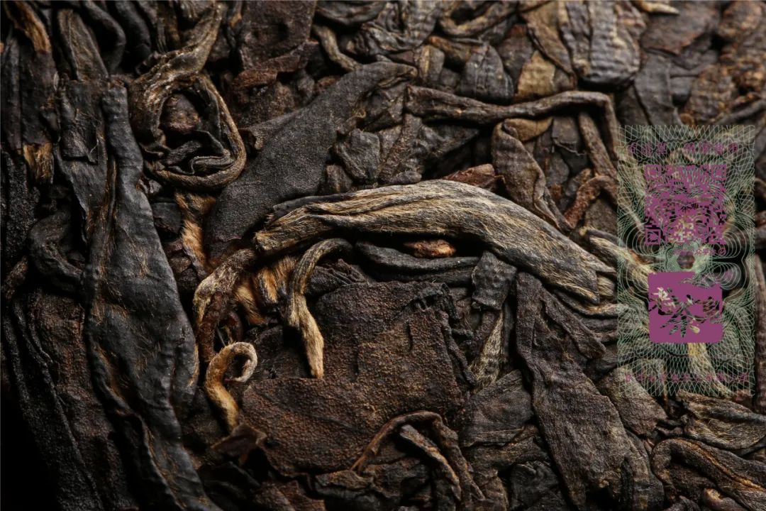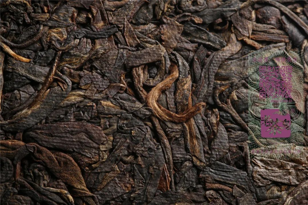 茶饼压制松紧度适中,饼型圆润饱满,饼面干爽,条索乌黑肥厚,金毫显现,干茶陈香浓郁,转化充分。