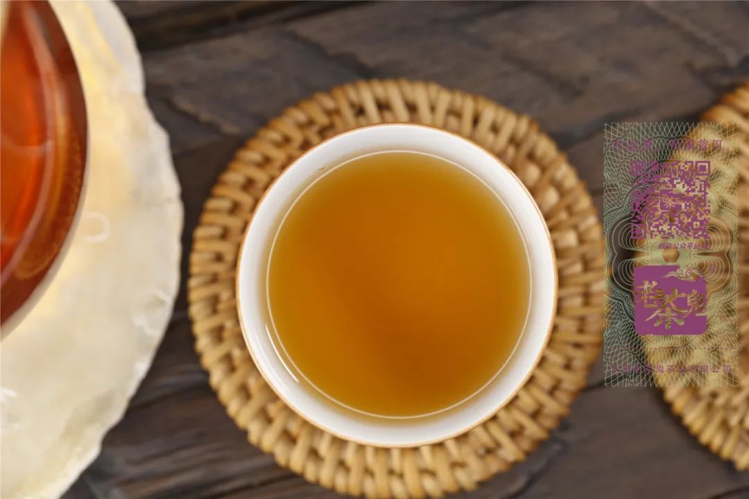 汤色栗黄明亮,通透干净,无杂质沉淀。杯底留香显浓郁果蜜香、陈香,挂杯持久。