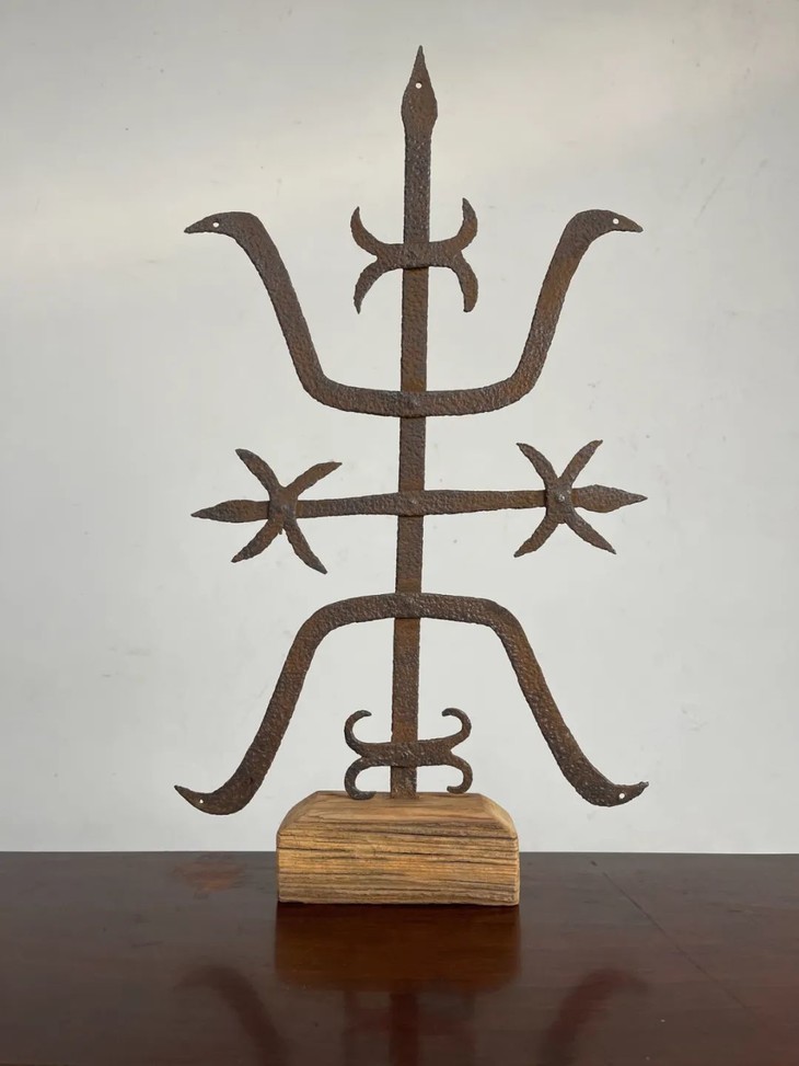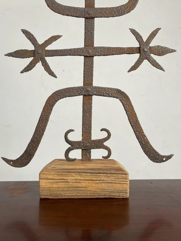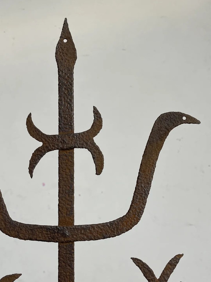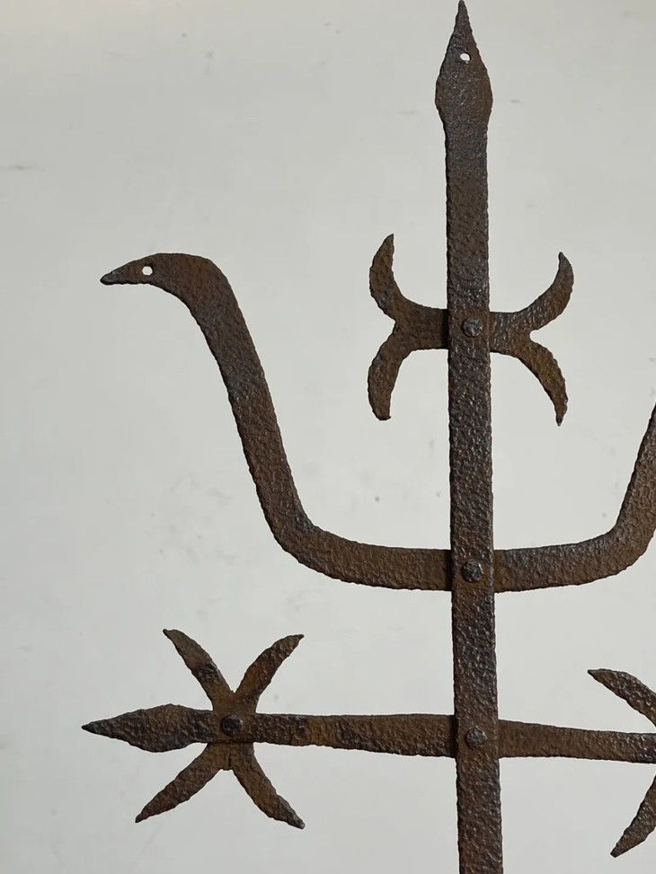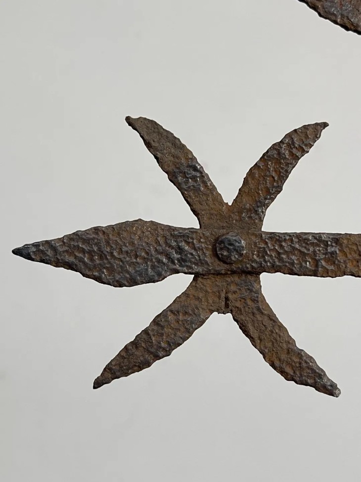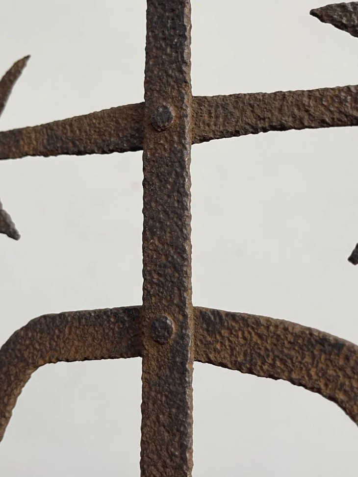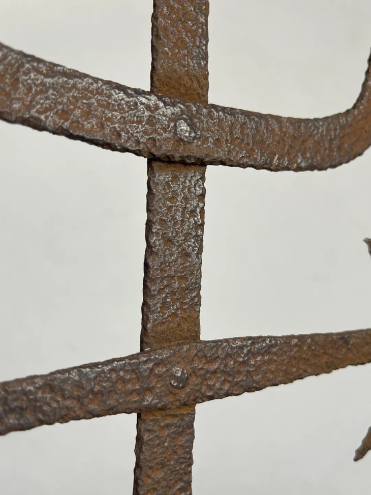 这是一件历史久的铁质”壽”字型大烛台,手工铸造捶打成铁片状篆体壽字笔划组合而成的大烛台,高逾五十厘米的大烛台形式简约、制作严谨,是经典庙宇佛前供奉烛台。