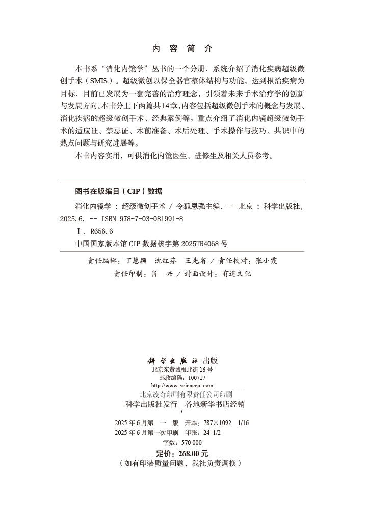 本书系“消化内镜学”丛书的一个分册,系统介绍了消化疾病超级微创手术(SMIS)。令狐恩强教授于 2016 年提出“保全器官整体结构与功能,达到根治疾病目标”的超级微创手术模式。超级微创目前已发展为一套完善的治疗理念,引领着未来手术治疗学的创新与发展方向。本书分上下两篇共14章,内容包括:消化内镜的基本原理和操作技术、超级微创手术的概念与发展、消化疾病的超级微创治疗术、实用案例分享等。重点介绍了消化内镜超级微创手术的适应证、禁忌证、检查前准备、检查流程、检查后注意事项、常见并发症及其治疗手段等。