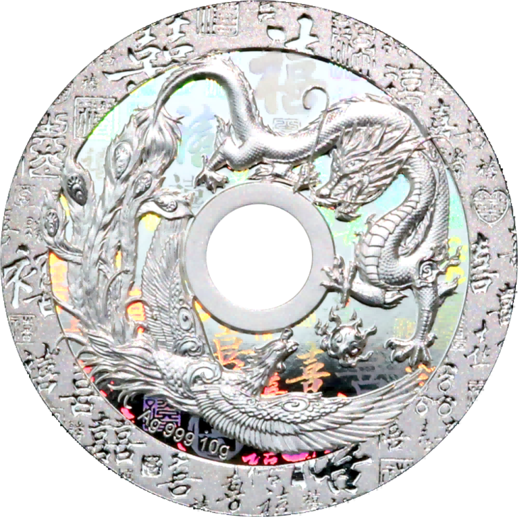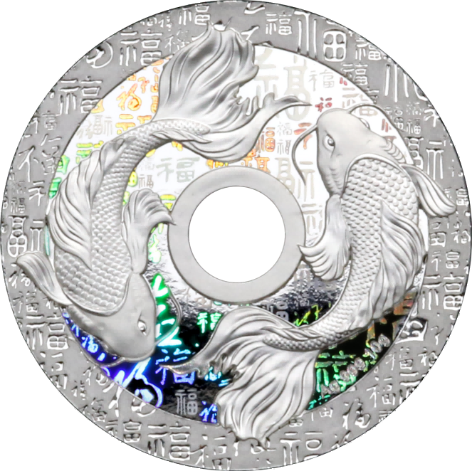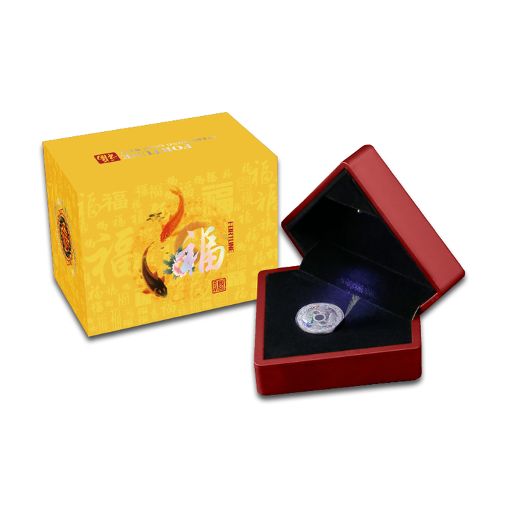 全套4枚,主题分别为福、禄、寿、喜,结合浮雕、全息幻彩和镜面等工艺,且中间镂空,表面进行了防氧化涂层保护,可直接作为挂饰佩戴,或作为挂件。