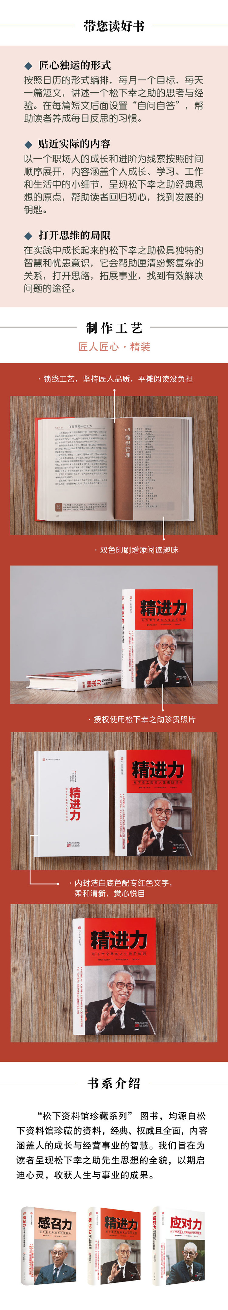 本书精心挑选出来了365篇文章,按照日历的形式,一个月一个主题,围绕提高“精进力”这一主题每天一篇短文,囊括了松下幸之助作为思想家的哲学思考、人生感悟和生活态度以及对愿景的描述,作为经营者对事业、社会、客户、商业伙伴、员工和企业持续发展的思考与经验总结,还有作为历经磨难经验丰富的长者对年轻人在生活与工作上的种种教诲。