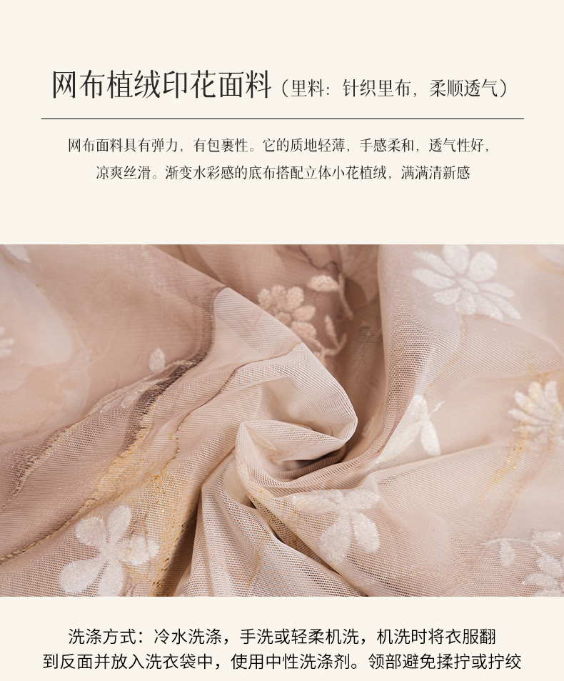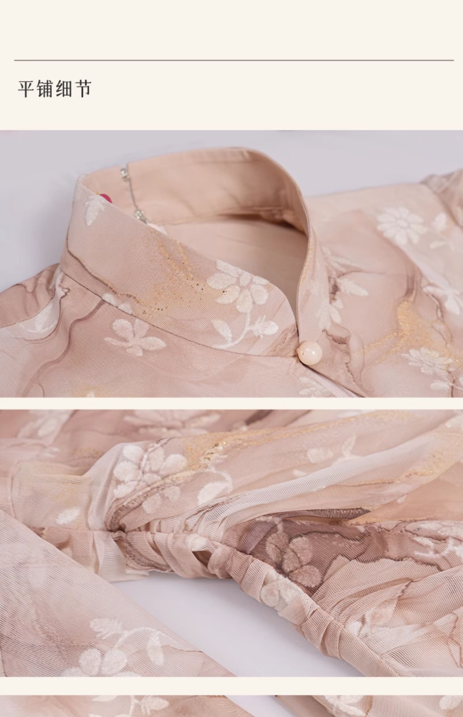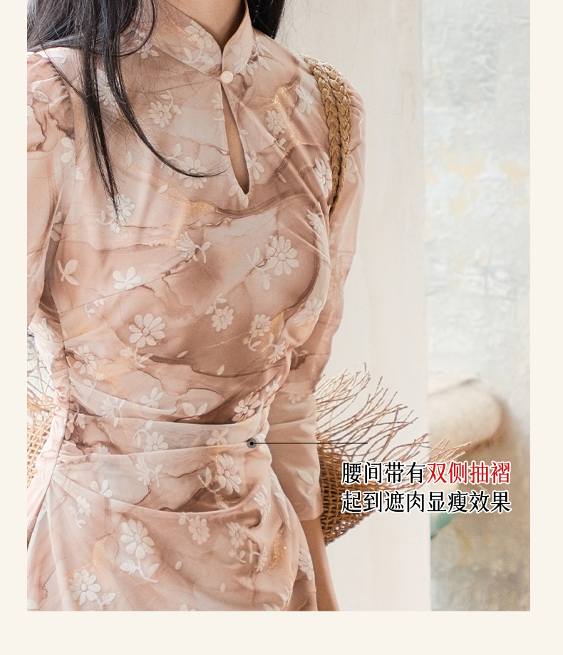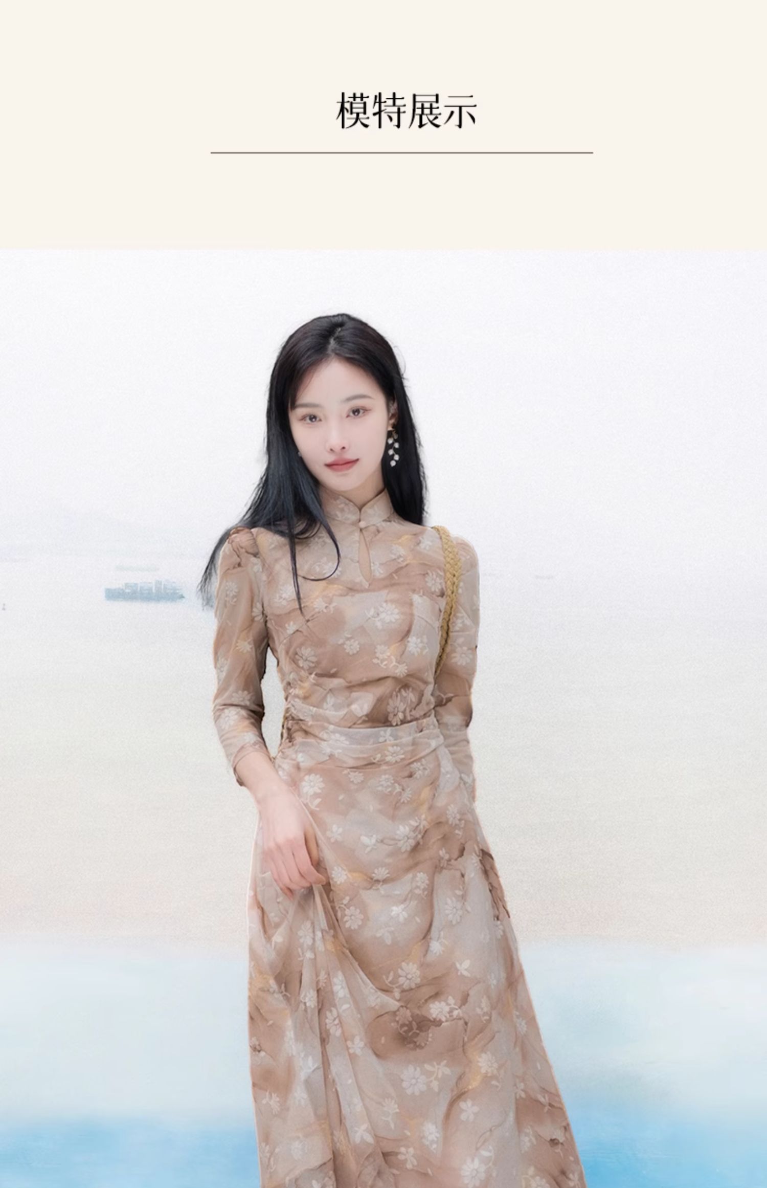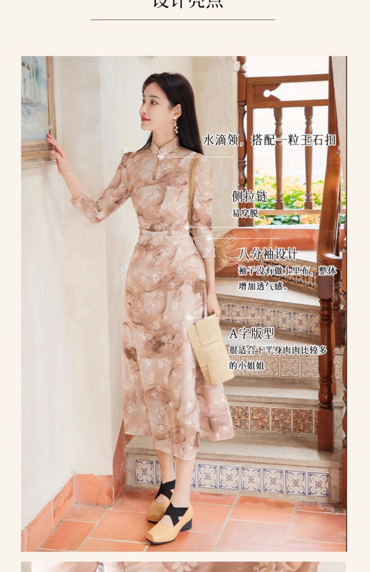上海逸红颜晚漾2025年春夏新款网布植绒印花水滴领抽褶改良旗袍裙