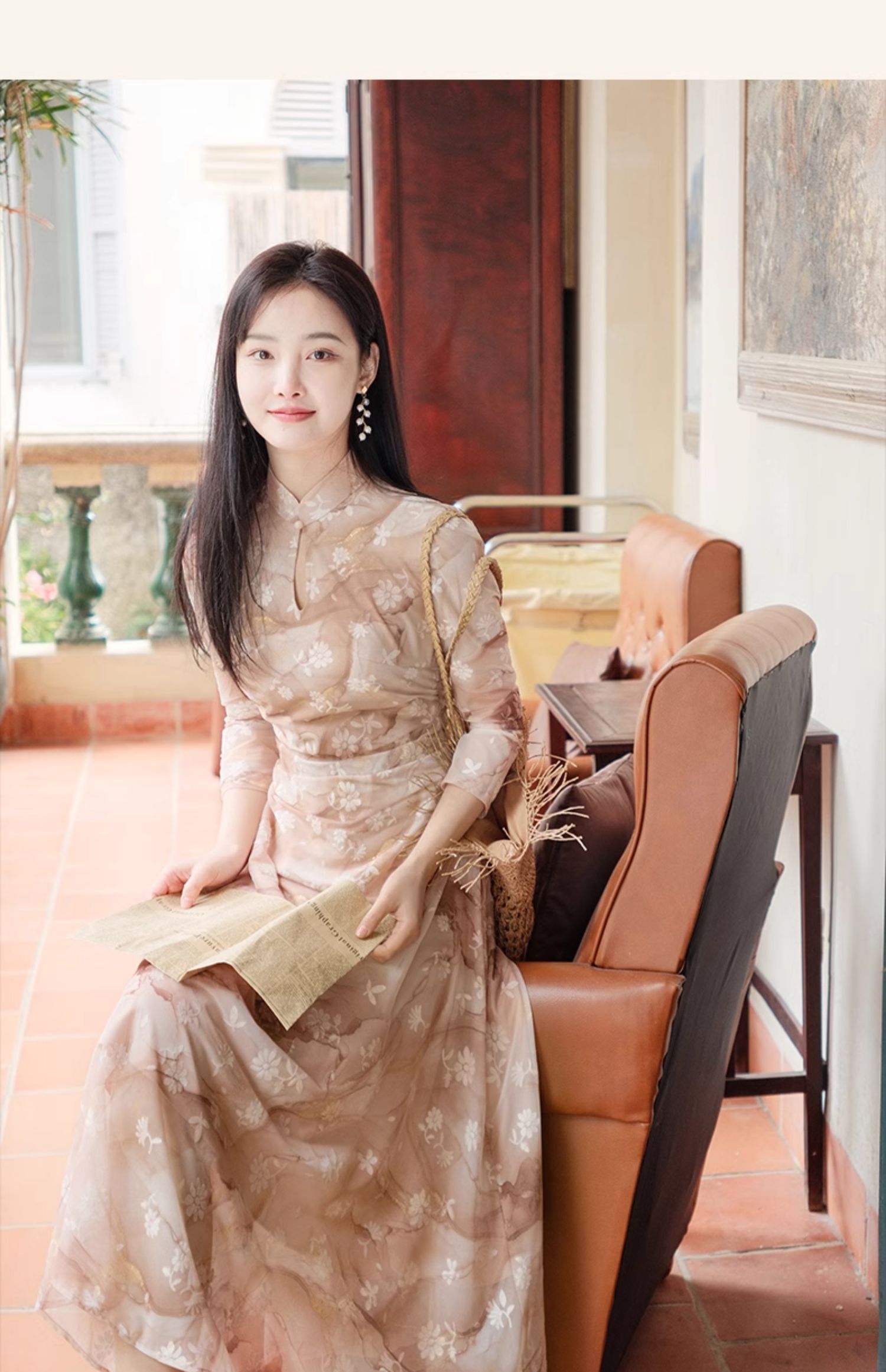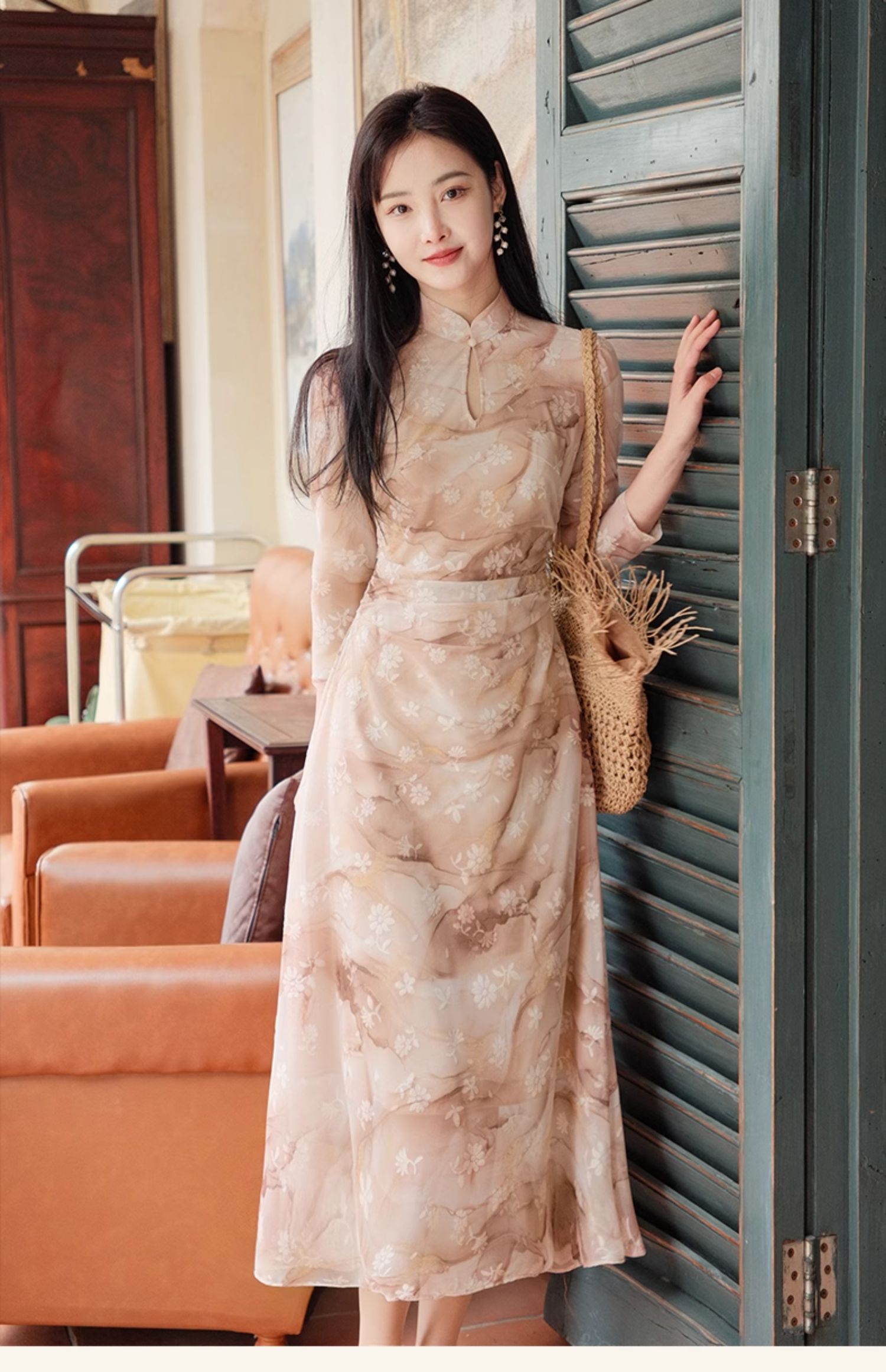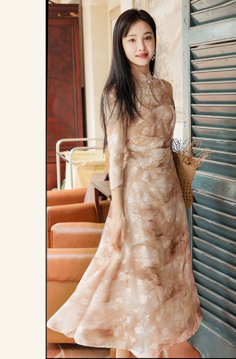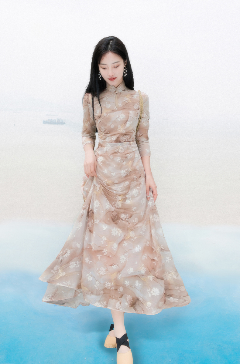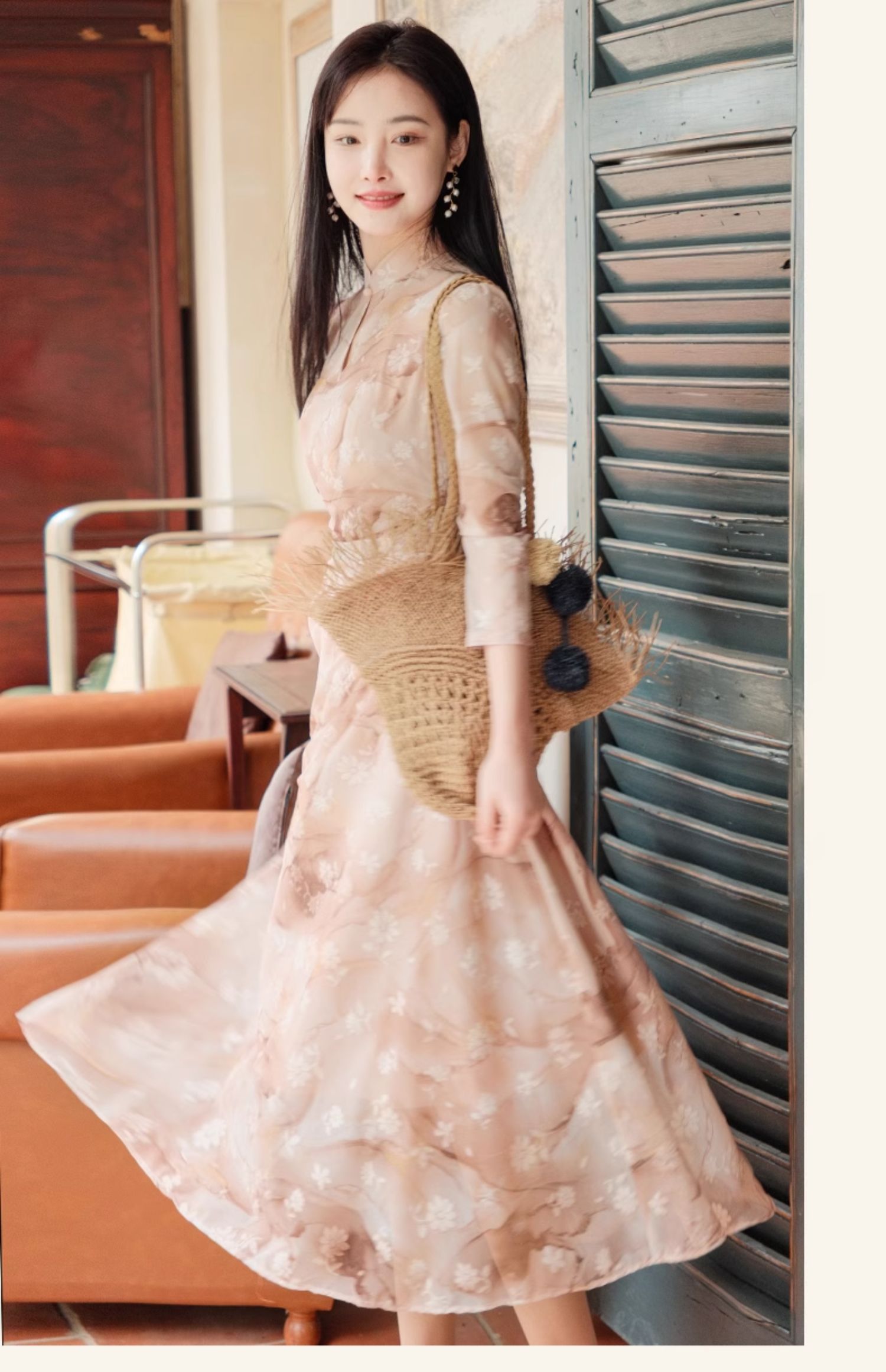 上海逸红颜晚漾2025年春夏新款网布植绒印花水滴领抽褶改良旗袍裙