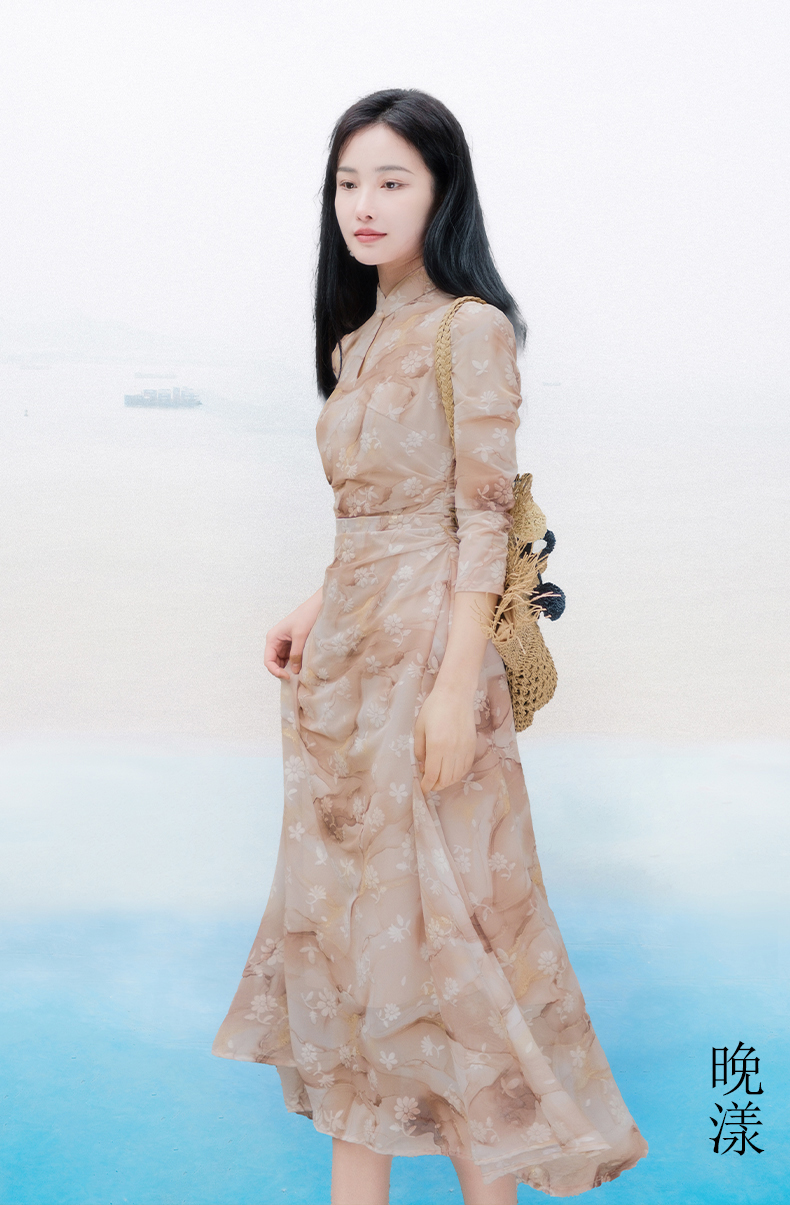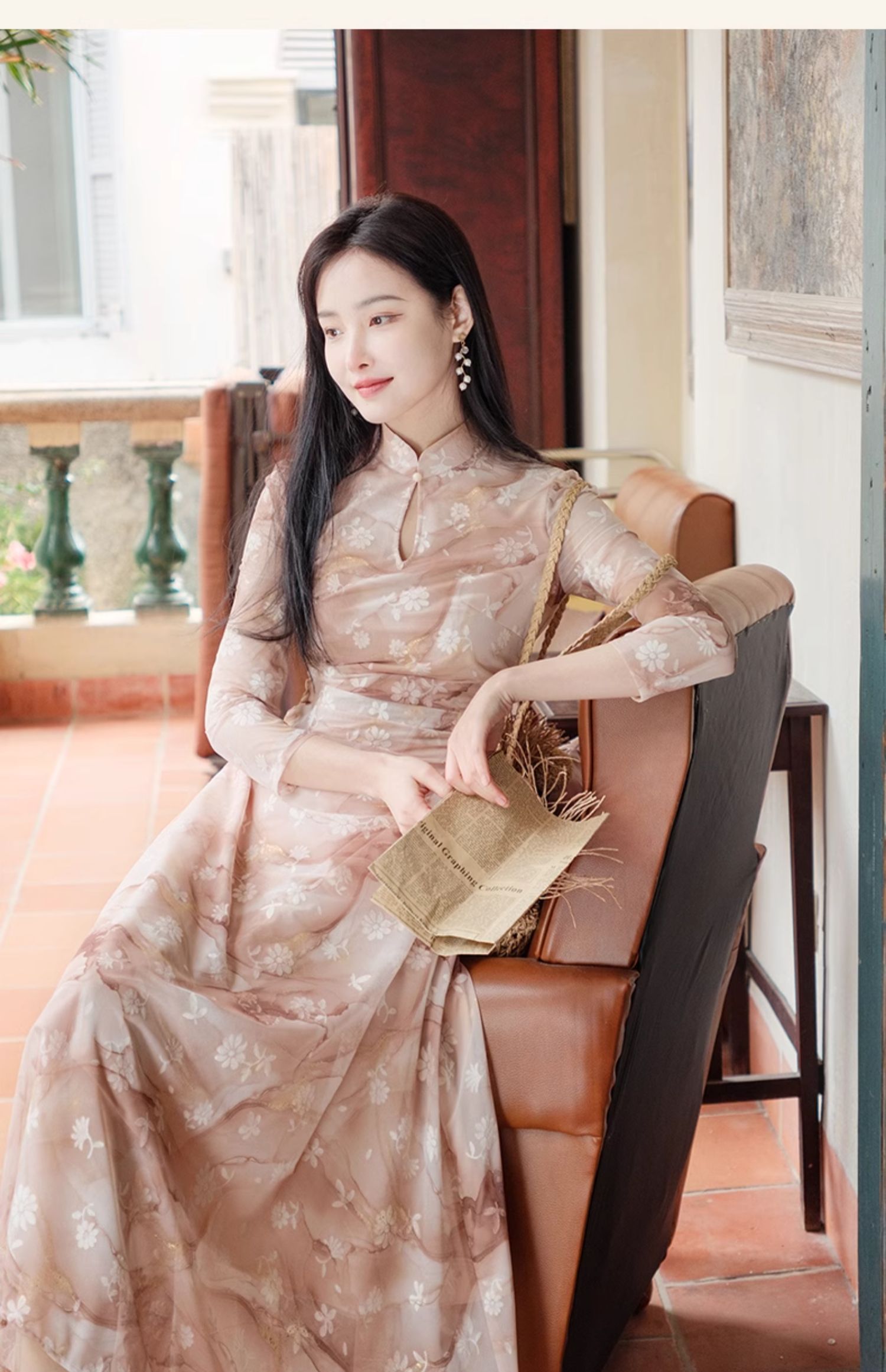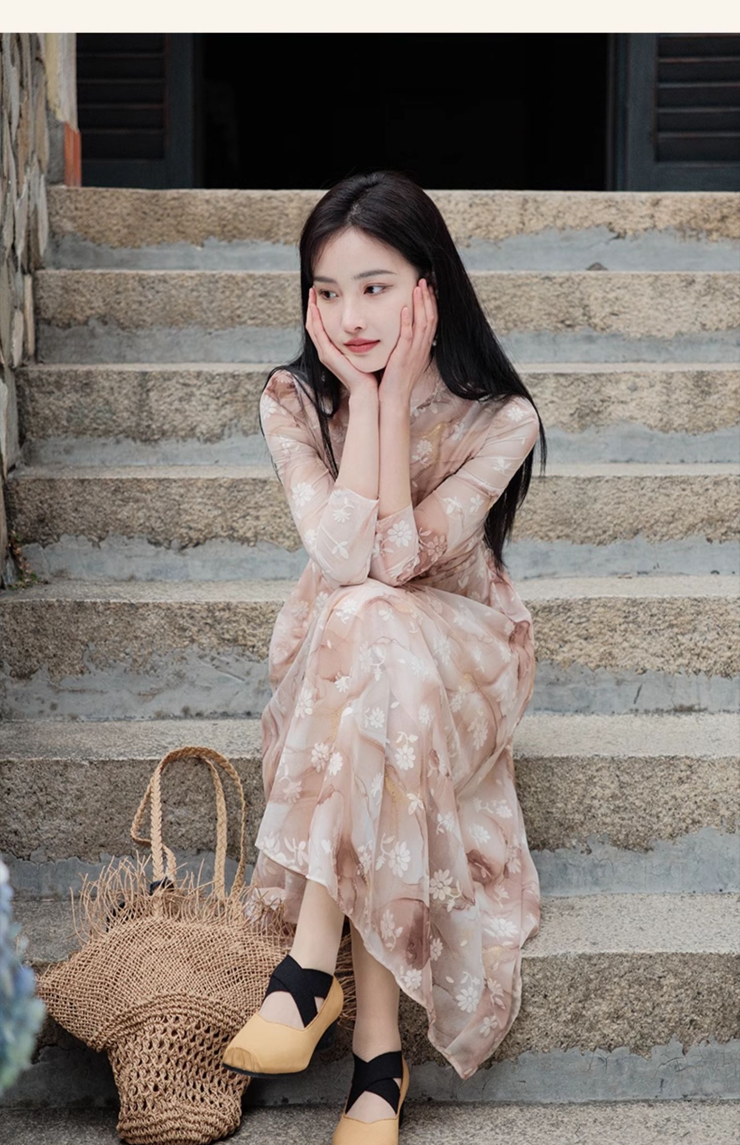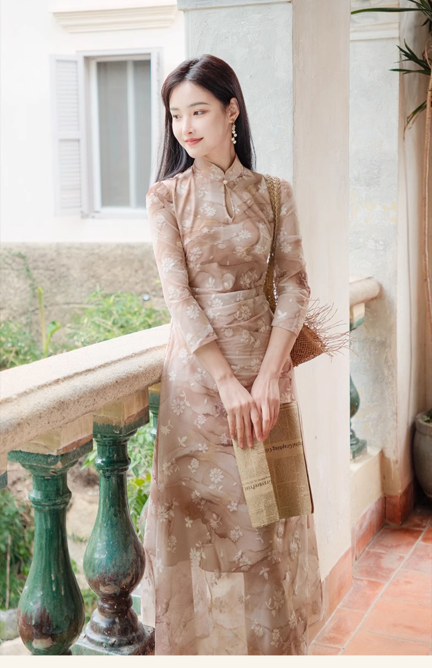 上海逸红颜晚漾2025年春夏新款网布植绒印花水滴领抽褶改良旗袍裙