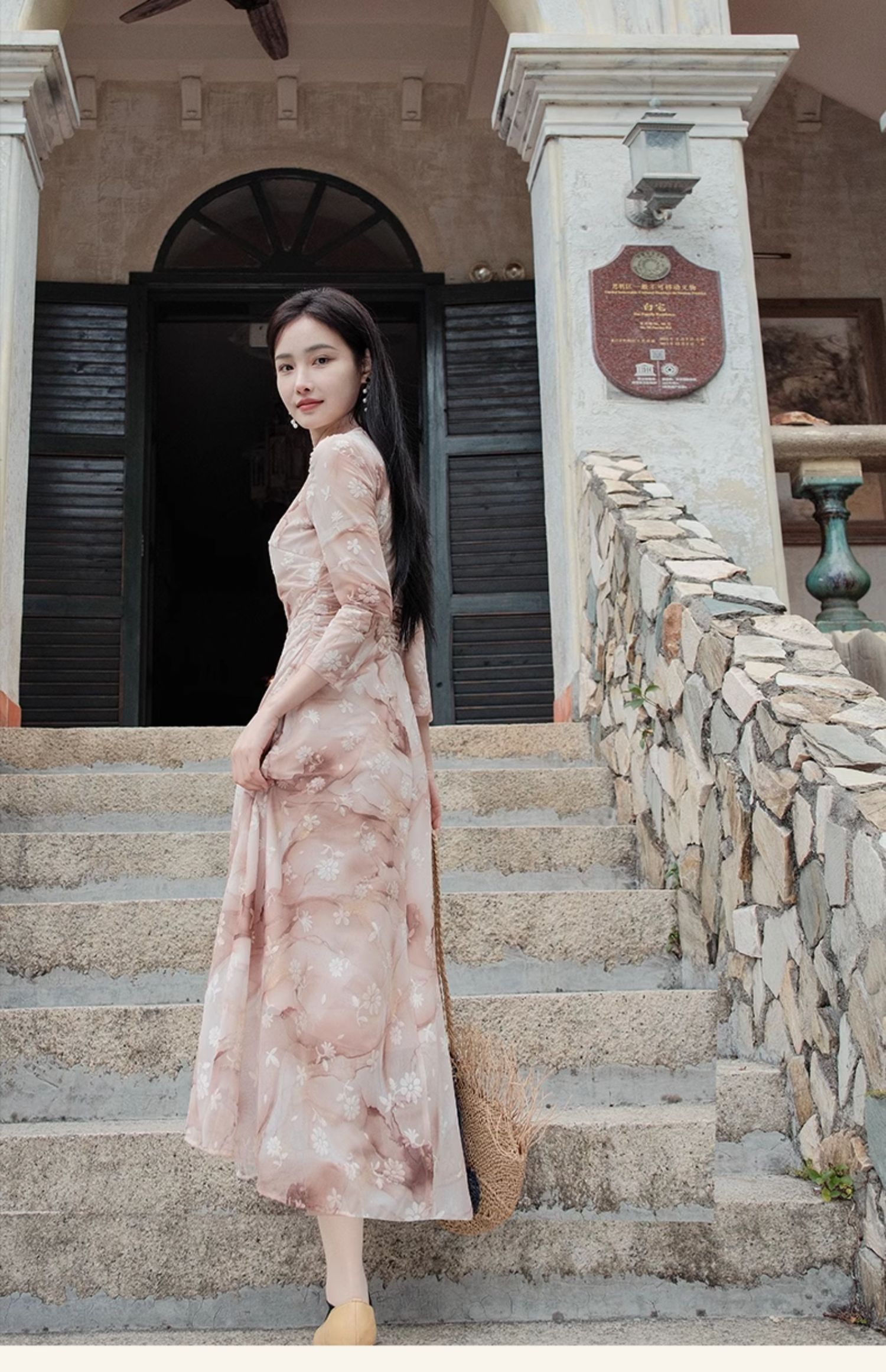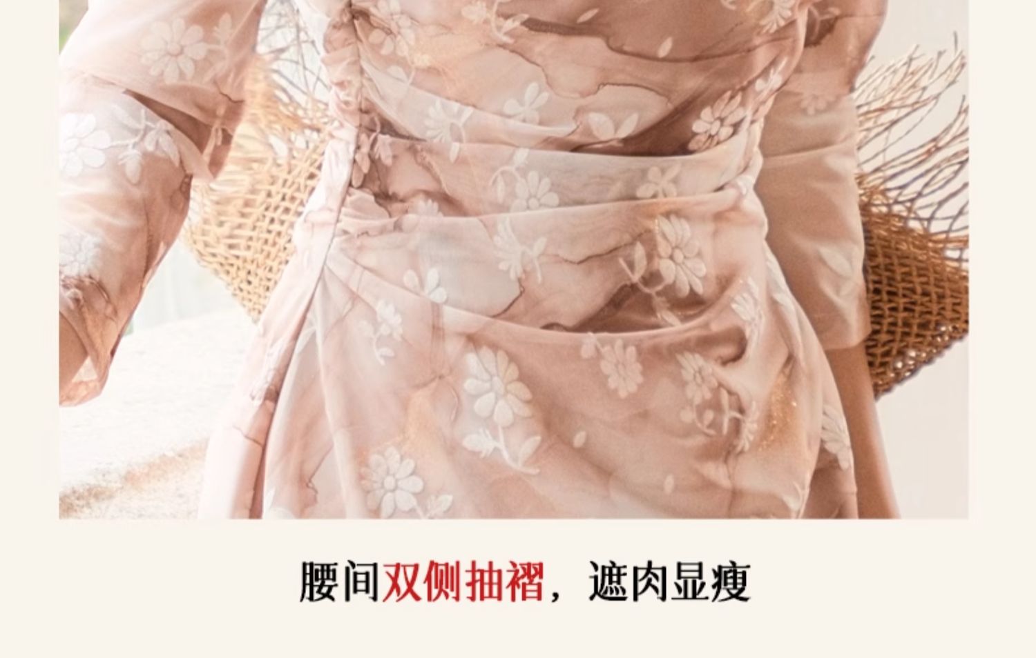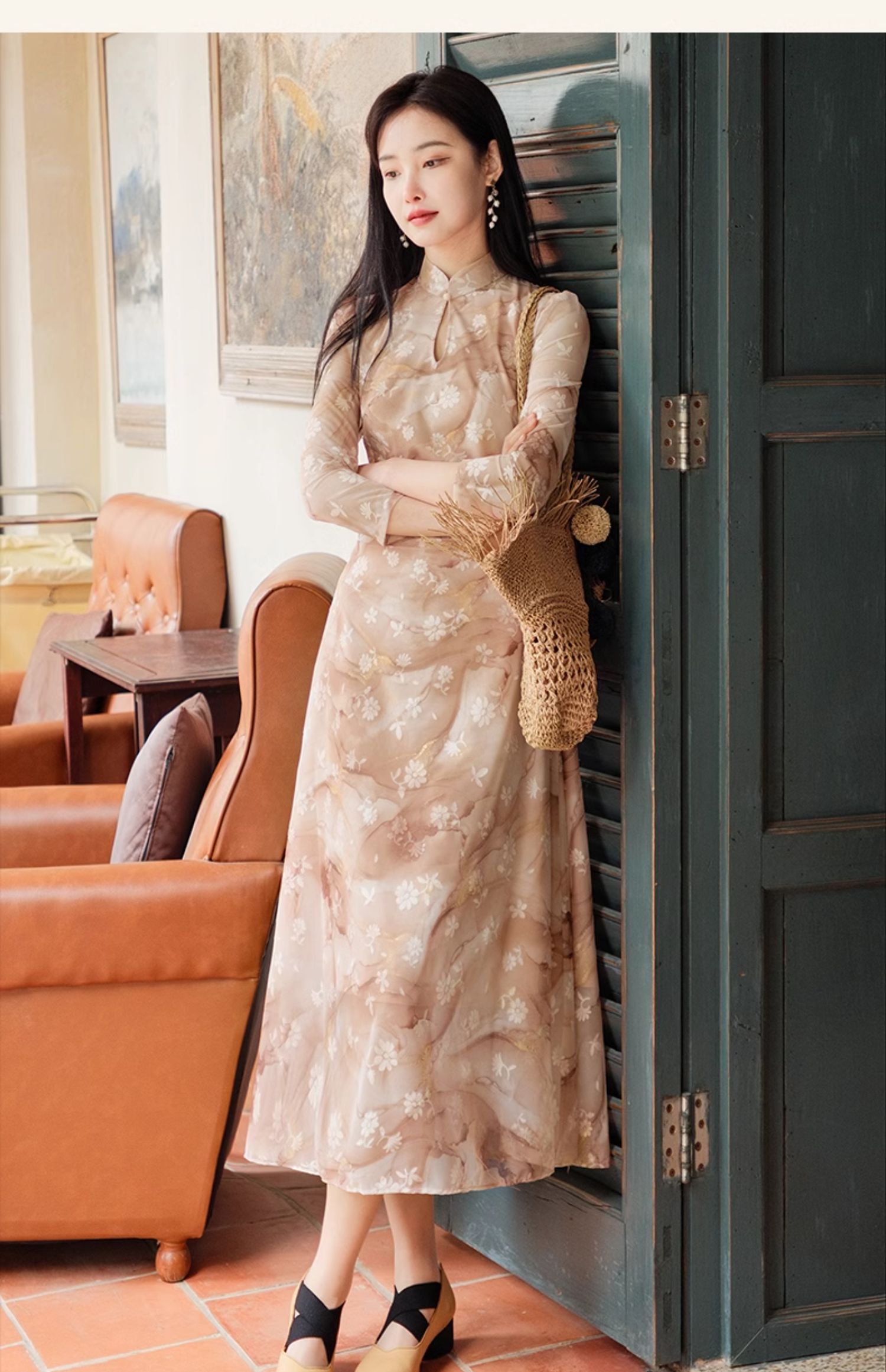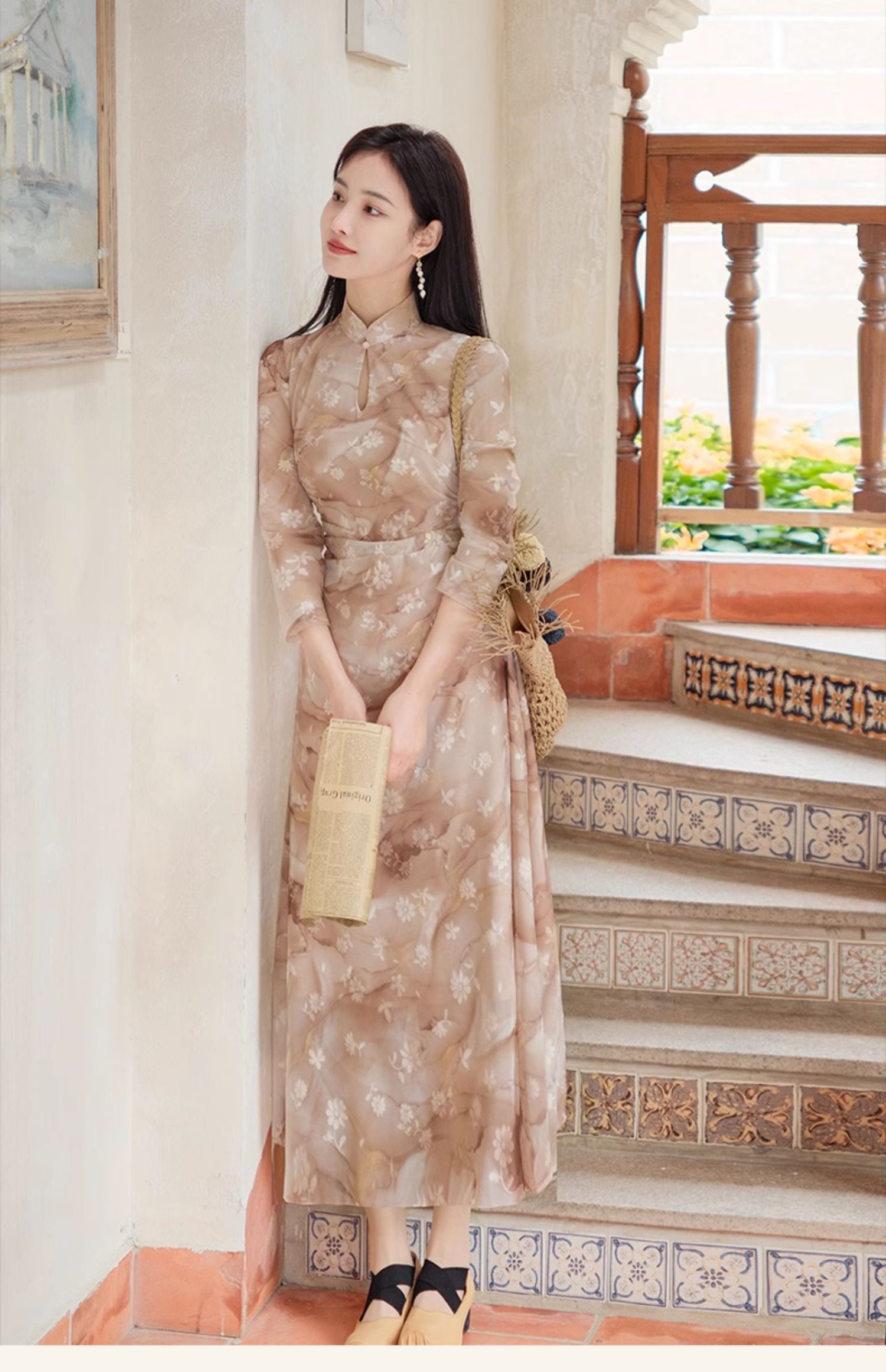 上海逸红颜晚漾2025年春夏新款网布植绒印花水滴领抽褶改良旗袍裙