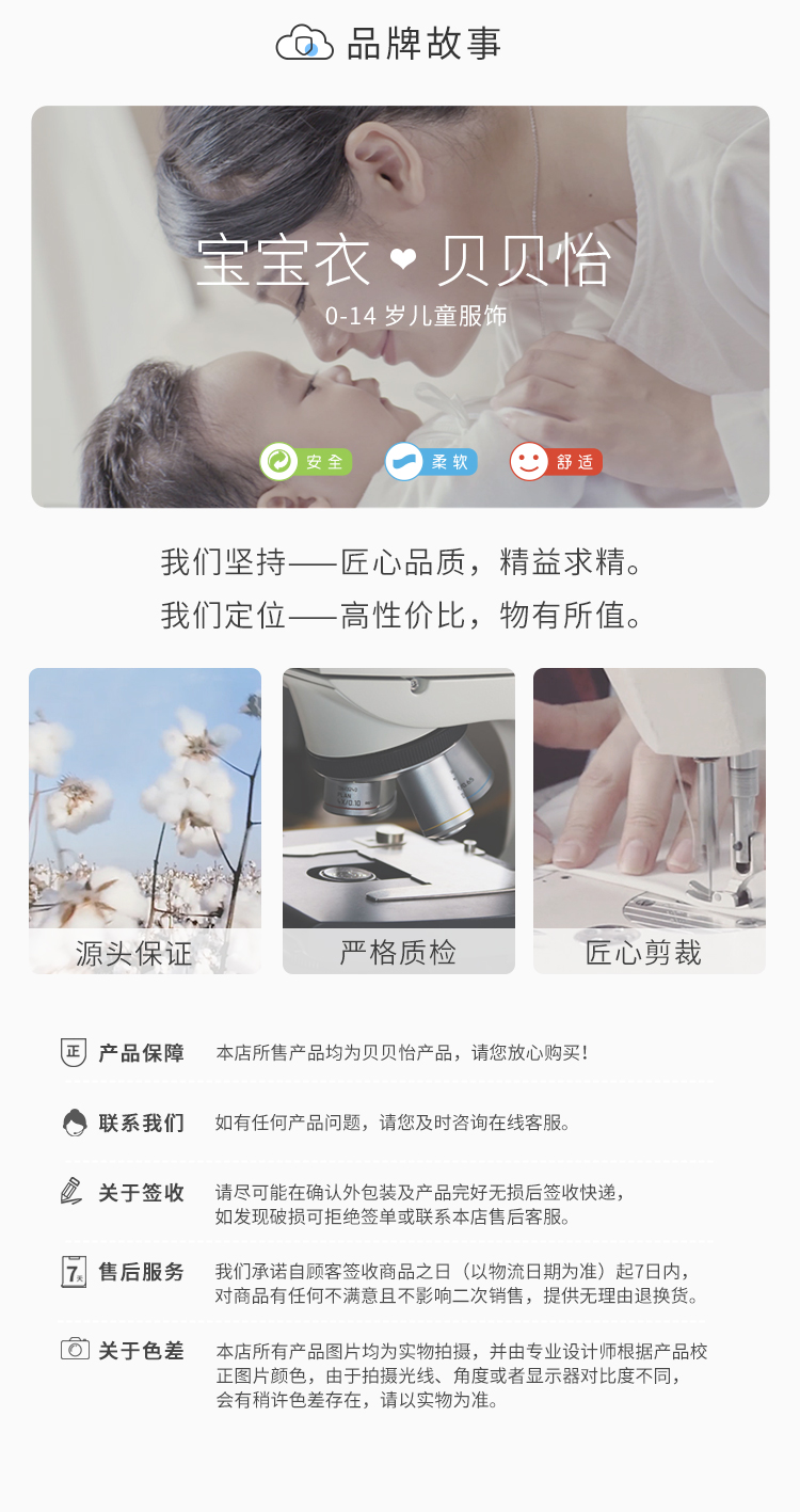 - 贝贝怡专注0-6岁婴幼儿服饰,坚持安全、柔软、舒适的产品理念,为千万中国家庭提供超高品质、安全可靠的婴幼儿服饰产品,妈妈放心,宝宝开心!