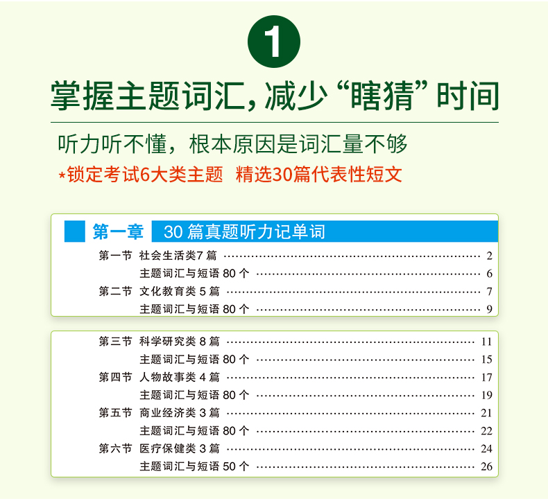 3. 强化英语六级词汇,30篇主题听力记六级单词,总结大学英语六级听力主题词汇与短语;