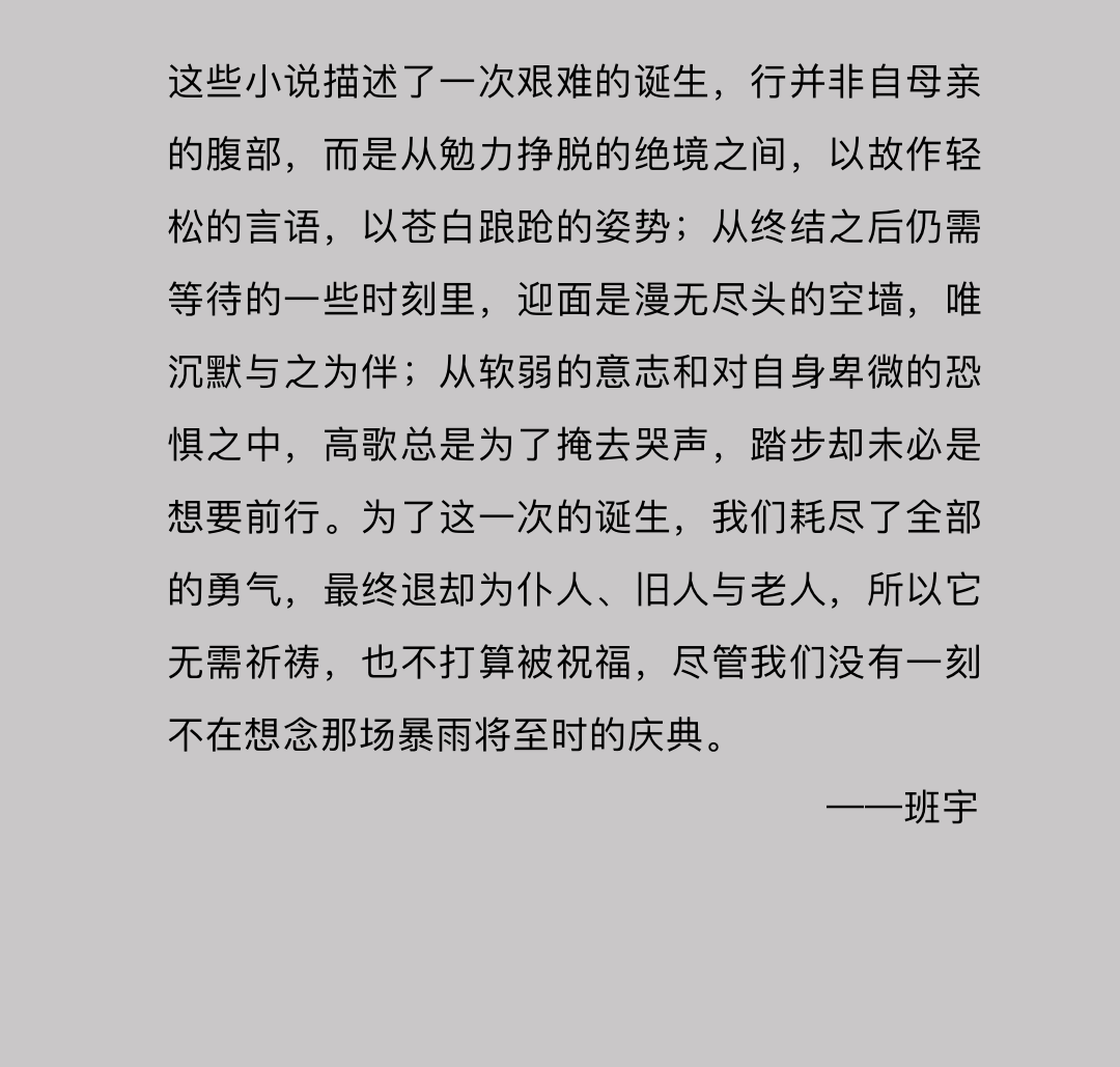 这些小说,读来多是关于一男一女、“非正常关系”的情感故事。他们不停转换场景,在不同的年龄、以不同的身份相遇,上演着一出出或平淡乏味、隐而不发,或暴雨腥风、无疾而终的悲喜剧。作者明写二人,实则在写世界、写人间。二人关系的背后,实为我们今日所有人当下的精神状况、真实处境——那离合与背叛,不是一个人对另一个人的背叛,是我们自己,对曾经的信仰的背叛,是弃绝对探索的背叛,是今天对昨天的背叛,是人类灵魂深处,难抗时代和岁月的退变。