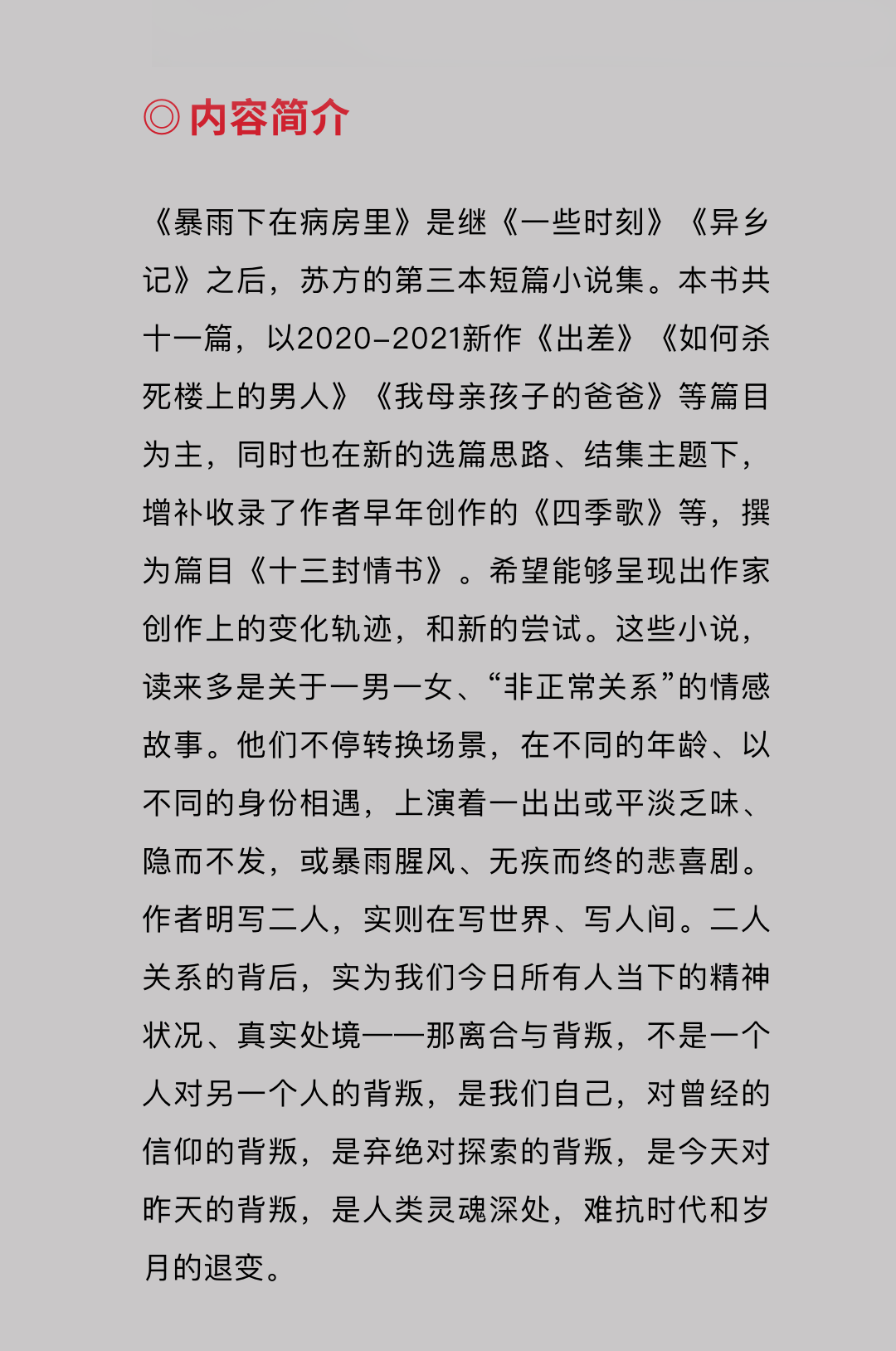 《暴雨下在病房里》是继《一些时刻》《异乡记》之后,苏方的第三本短篇小说集。