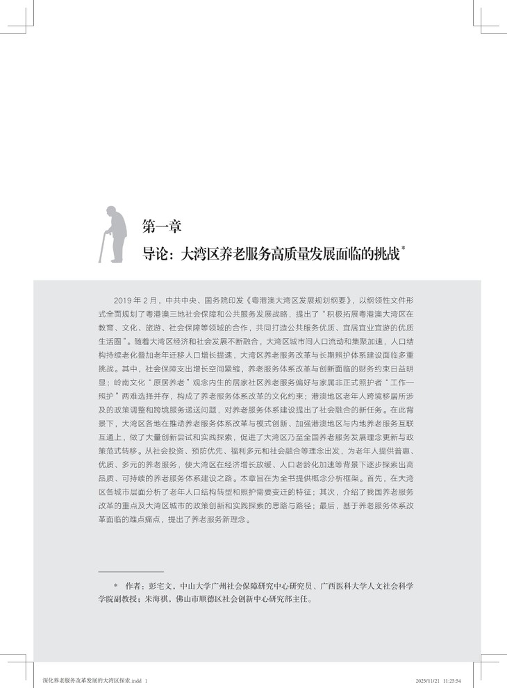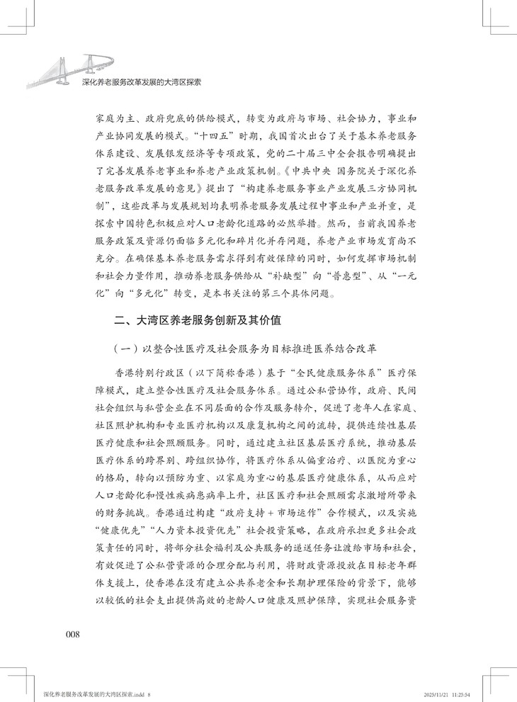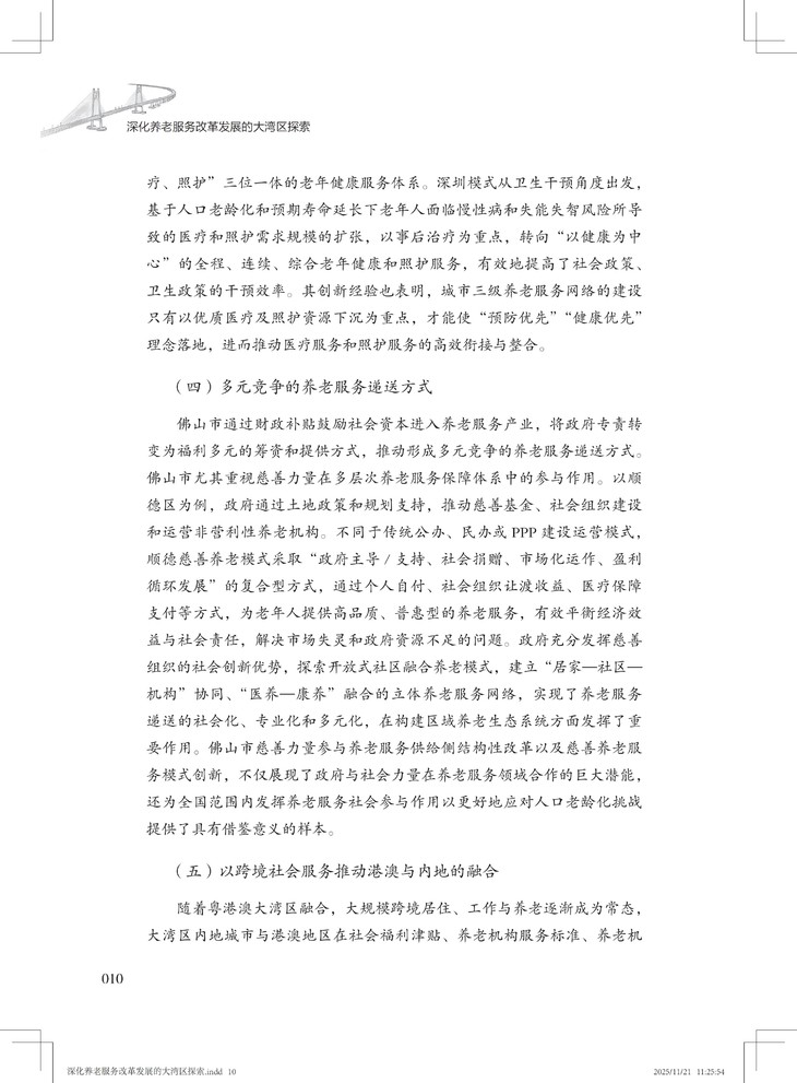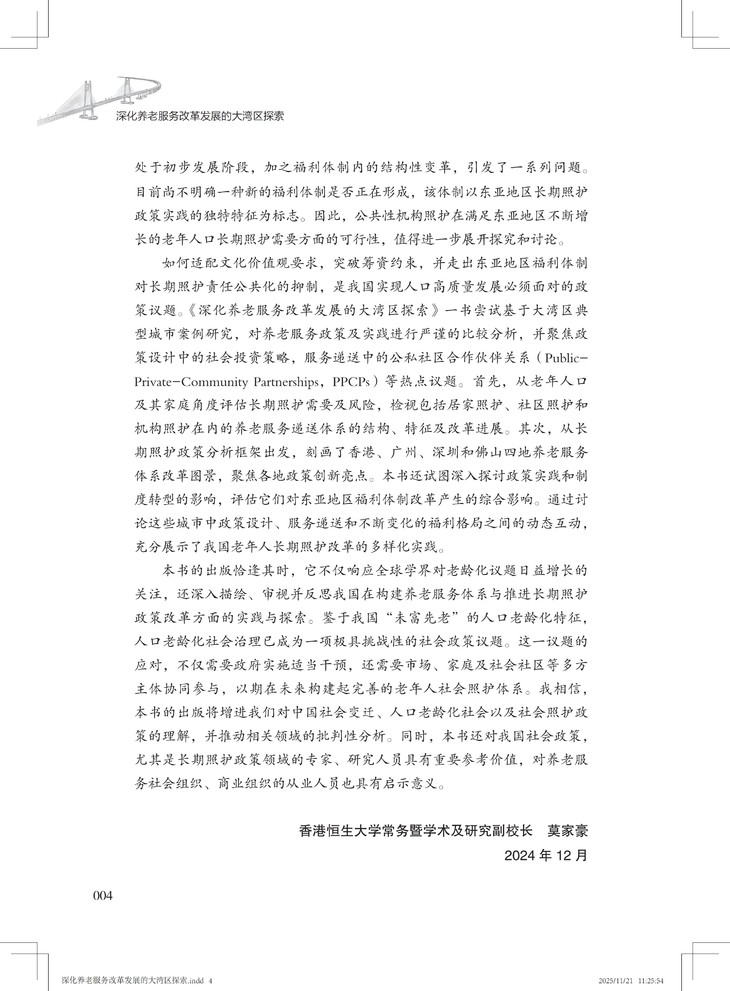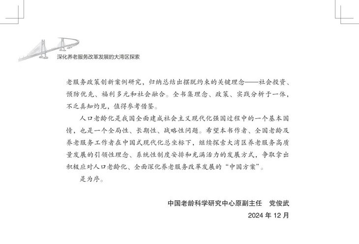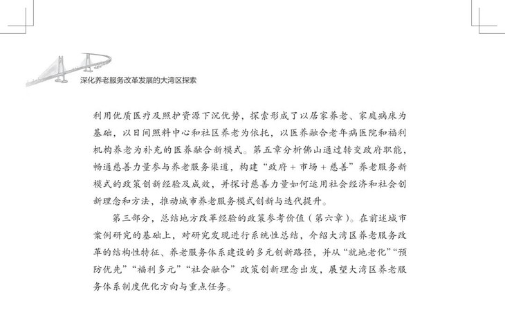 该书兼具战略高度、实践价值和理论创新,不仅创新融合应对老龄化、健康中国与大湾区建设三大国家战略,形成可复制、可推广的大湾区养老服务改革创新经验,并以国际前沿理论本土化推动学术话语创新,又以扎实案例为政策制定者提供决策依据,更为养老从业者提供可操作化路径。
