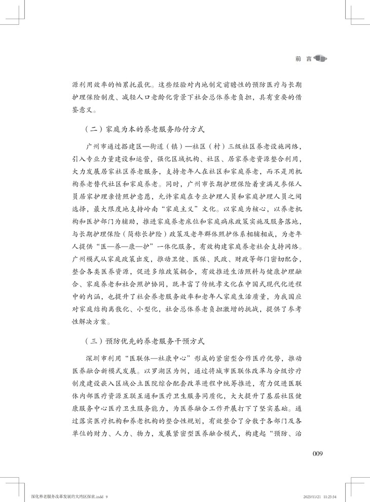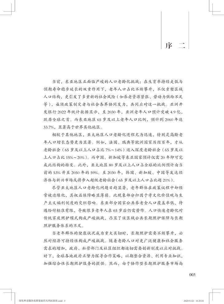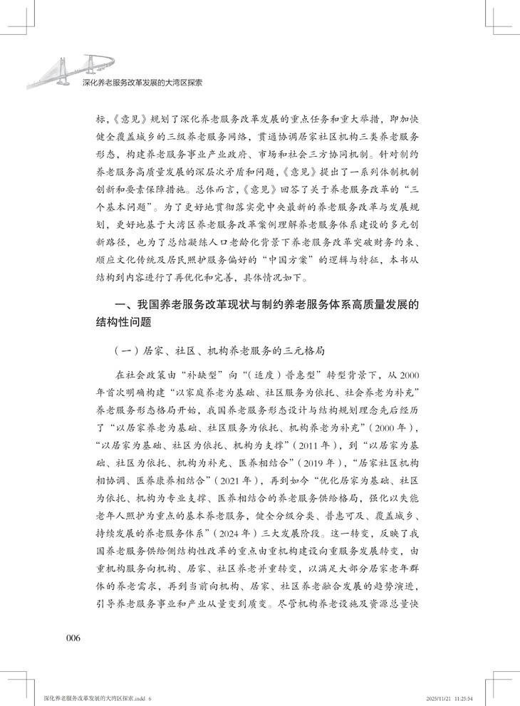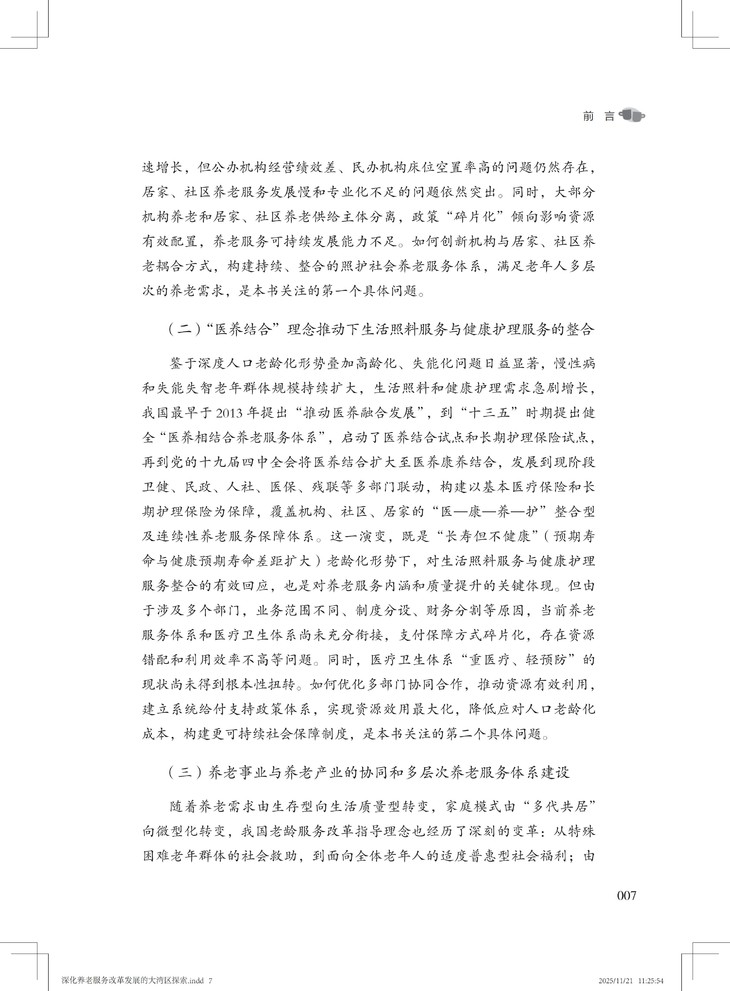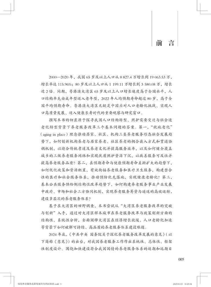 该书兼具战略高度、实践价值和理论创新,不仅创新融合应对老龄化、健康中国与大湾区建设三大国家战略,形成可复制、可推广的大湾区养老服务改革创新经验,并以国际前沿理论本土化推动学术话语创新,又以扎实案例为政策制定者提供决策依据,更为养老从业者提供可操作化路径。