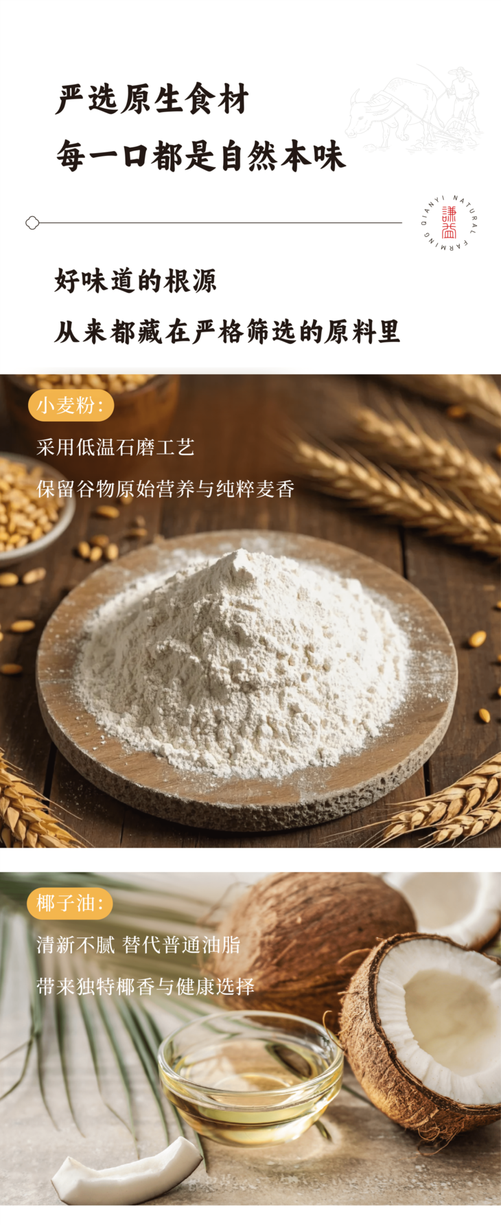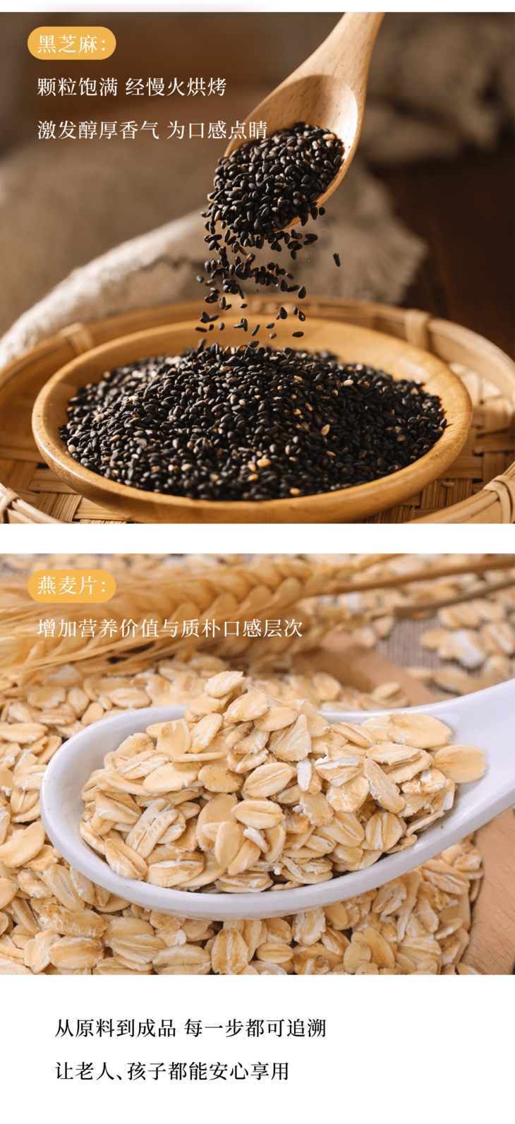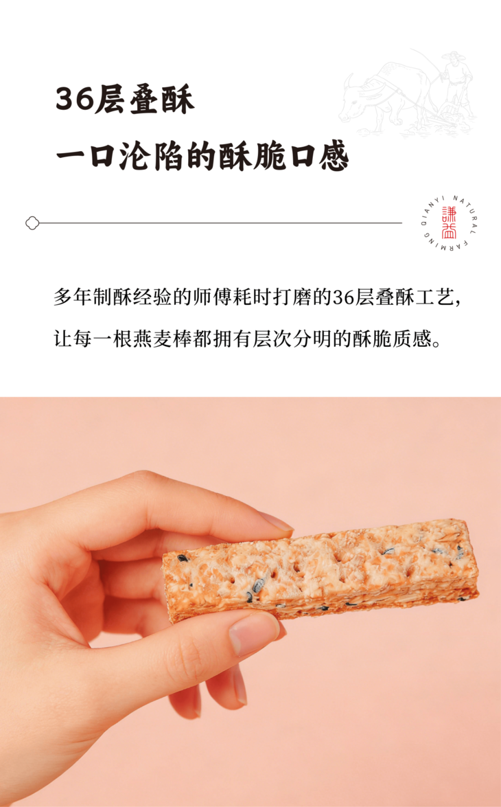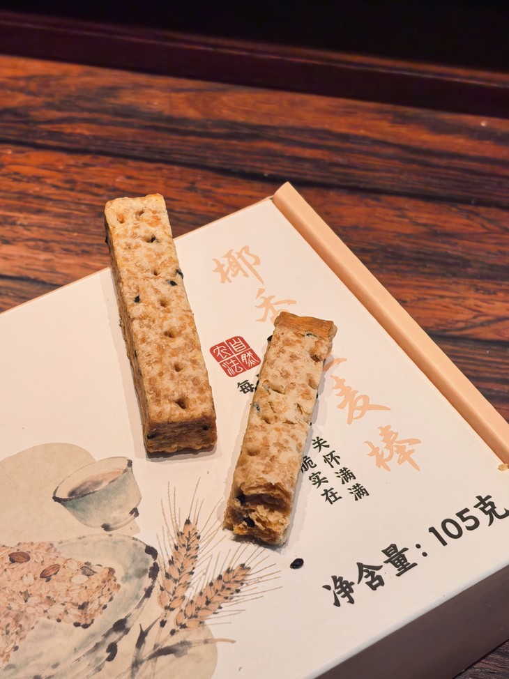 椰香燕麦棒,都是以原生食材为基底。低温石磨小麦粉,最大程度保留谷物原始营养与纯粹麦香;清新不腻的椰子油替代普通油脂,带来独特椰香的同时更加健康;颗粒饱满的黑芝麻,经慢火烘烤,激发醇厚香气为口感点睛;还有燕麦片加持,丰富营养价值的同时勾勒出质朴的口感层次。更有多年制酥经验的师傅耗时打磨的36层叠酥工艺,让每一根燕麦棒都拥有层次分明的酥脆质感。从原料到成品每一步均可溯源,老人孩子都能安心享用。