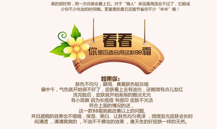 产品简介:自然偏白色、不油腻、轻薄服贴、修颜润色、1支多效、隔离、抗辐射、遮暇、保湿,令面容清爽干净,美白、改善皱纹、防紫外线,同时具有超强保湿能力,对肌肤无刺激,可以轻松达到裸状效果。