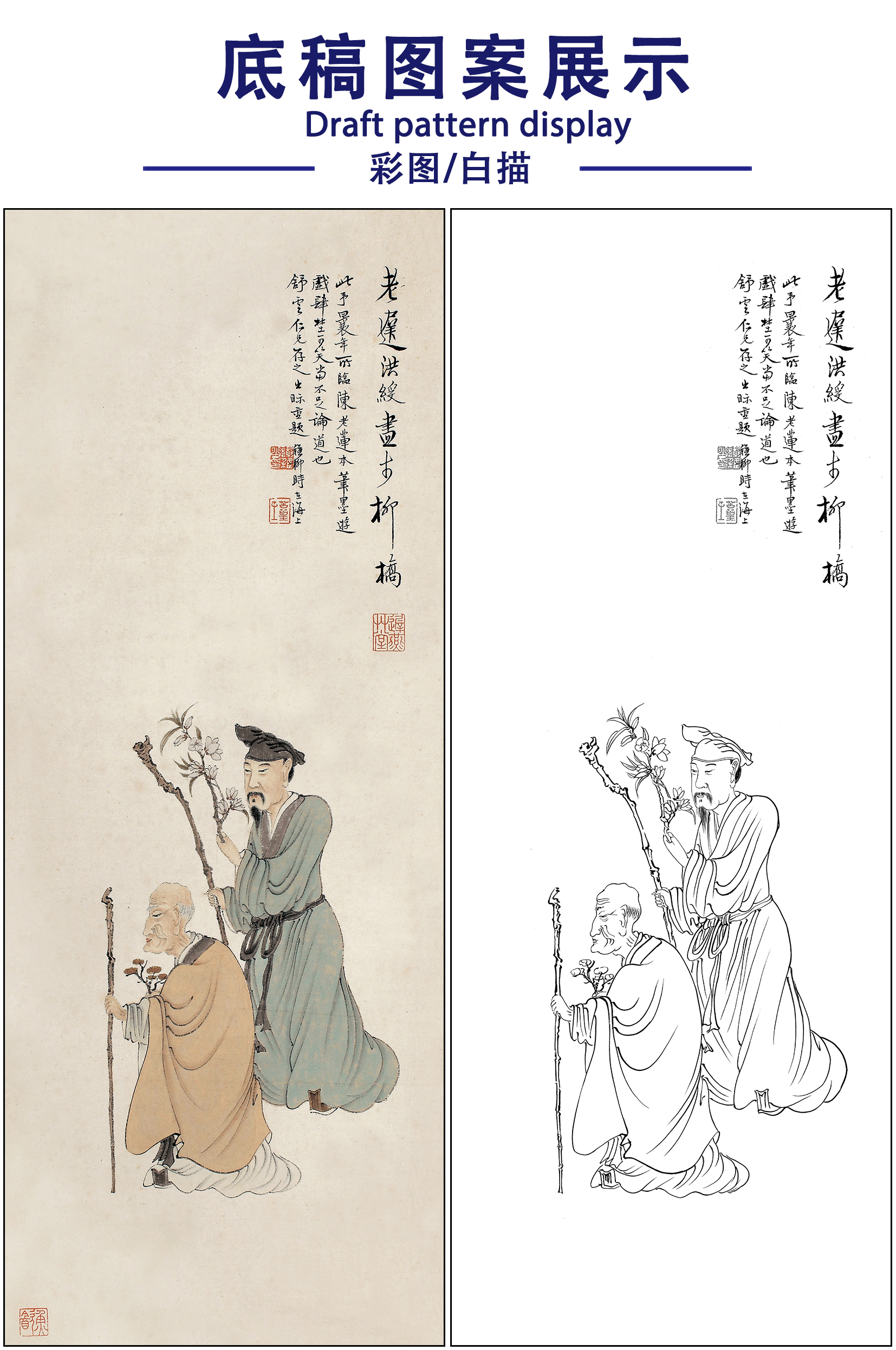 谢稚柳人物工笔画白描底稿《仿陈老莲笔意图》临摹勾线高清打印稿XZ24