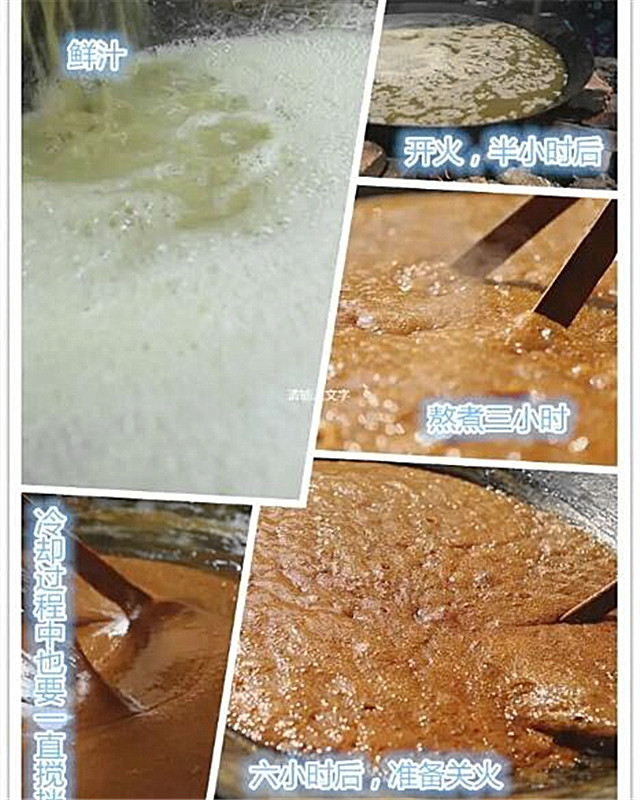 (上图)古方红糖的熬制,简单、机械、略带枯燥,这是甘蔗汁浓缩蜕变的过程,为什么嚼甘蔗没有手工红糖的功能,这主要在熬制的过程,蔗糖的性质发生了神奇的变化。