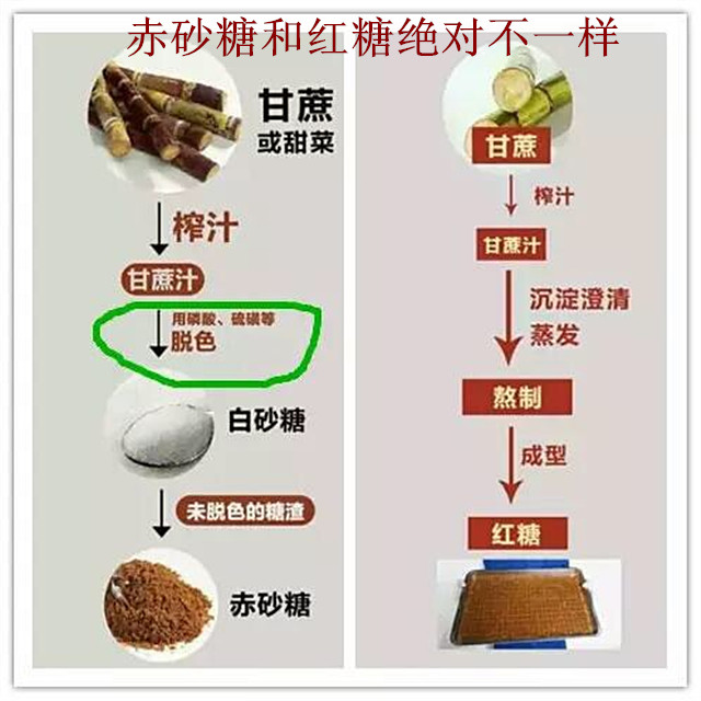 (上图)红糖是经过一些土制的方法制作出来的,它的营养价值是比较高的,而赤砂糖是工业提纯白糖后的残渣,混入提纯剂的糖渣再进行加工的副产品,被堂而皇之的作为女性补血老红糖销售。