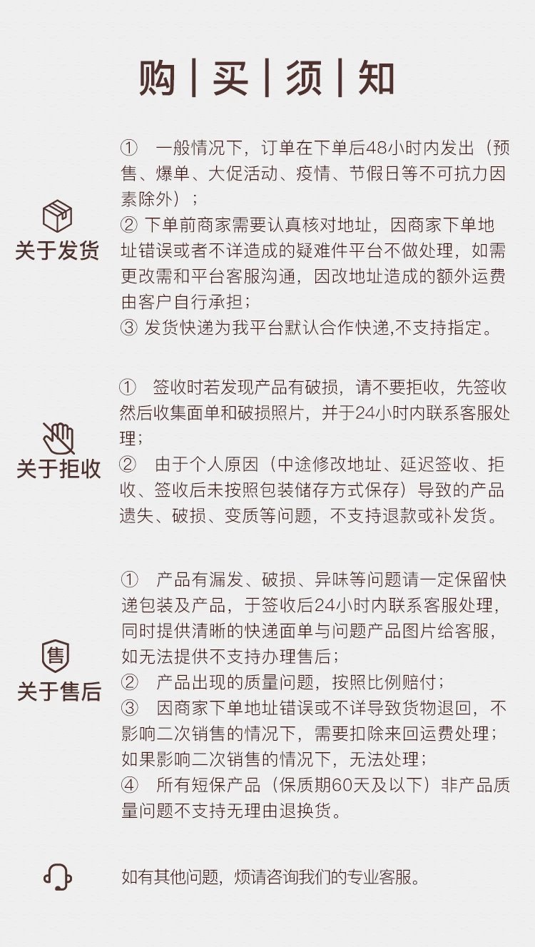 售后规则:签收24小时内如发现产品质量问题把产品和快递面单一起拍照联系客服处理,非质量问题食品类产品不退换~
