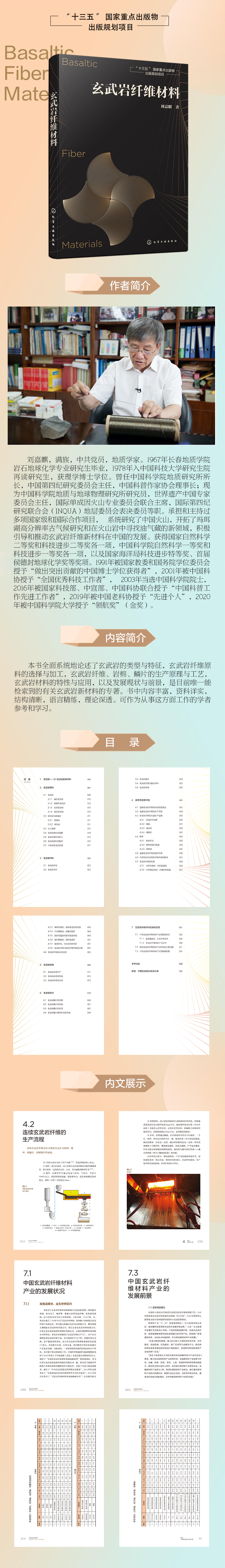 刘嘉麒院士基于多年的研究成果及对玄武岩纤维材料产业的深入了解,撰写《玄武岩纤维材料》一书,全面系统地论述了玄武岩的类型与特征,玄武岩纤维原料的选择与加工,玄武岩纤维、岩棉、鳞片的生产原理与工艺,玄武岩材料的特性与应用,以及这种新材料的发展现状与前景。对指导玄武岩的开发利用,促进玄武岩纤维材料产业的发展,必将产生巨大的推动作用。