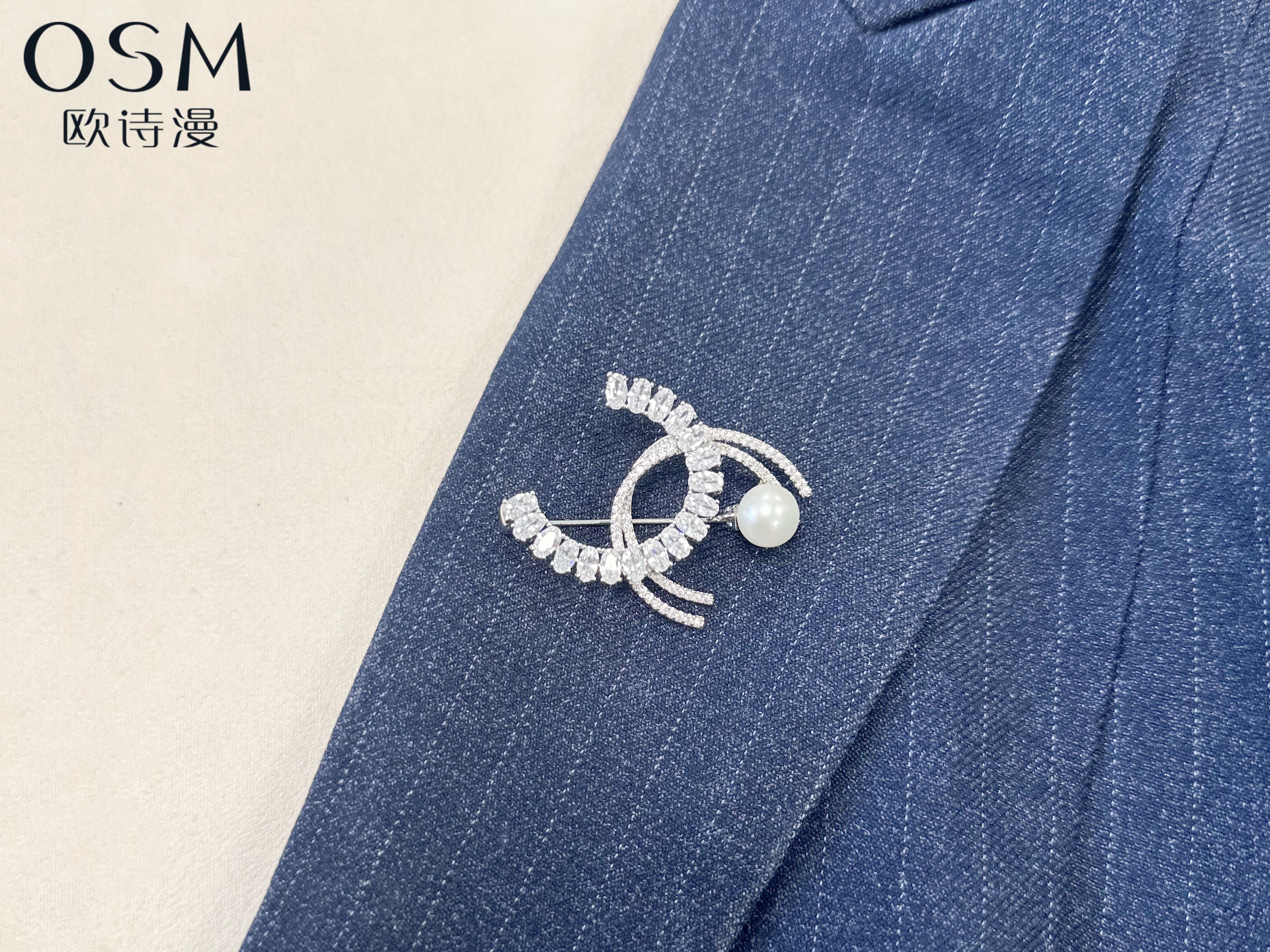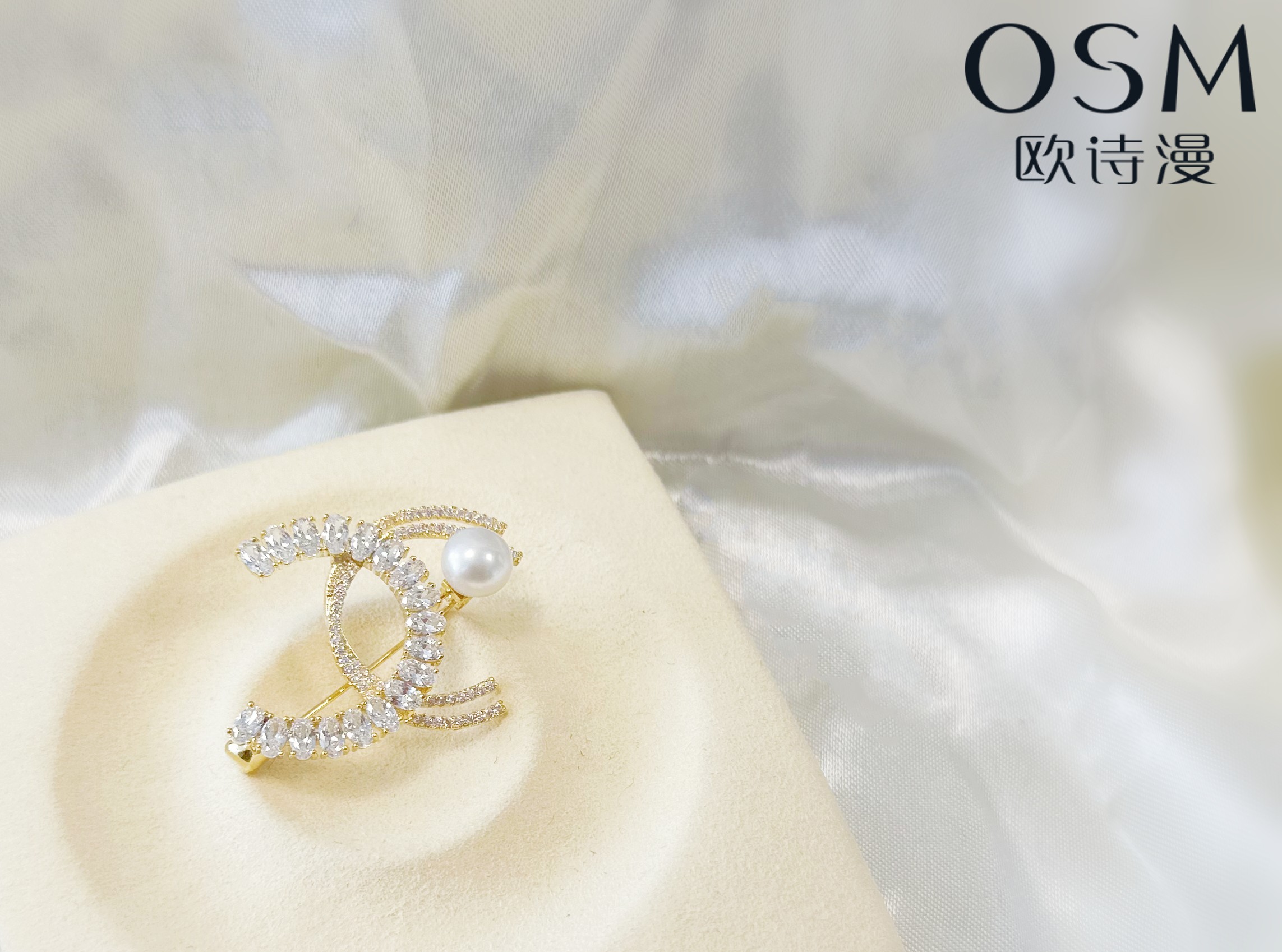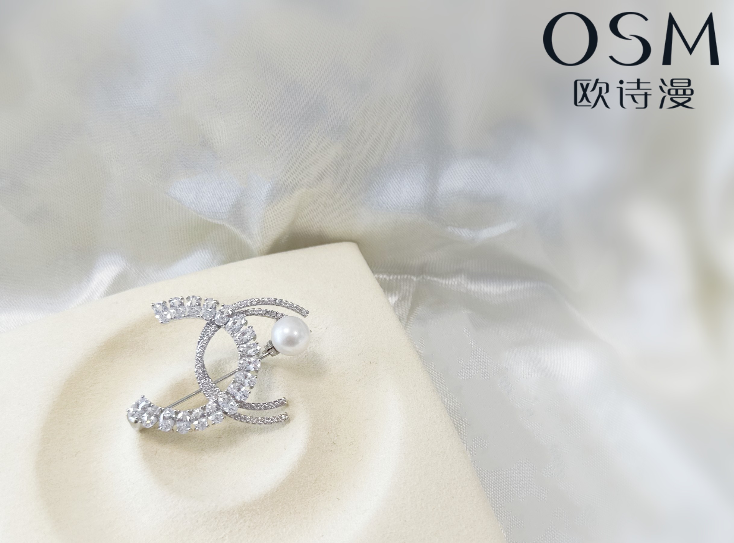 欧诗漫双C珍珠胸针丝巾扣白色淡水珍珠