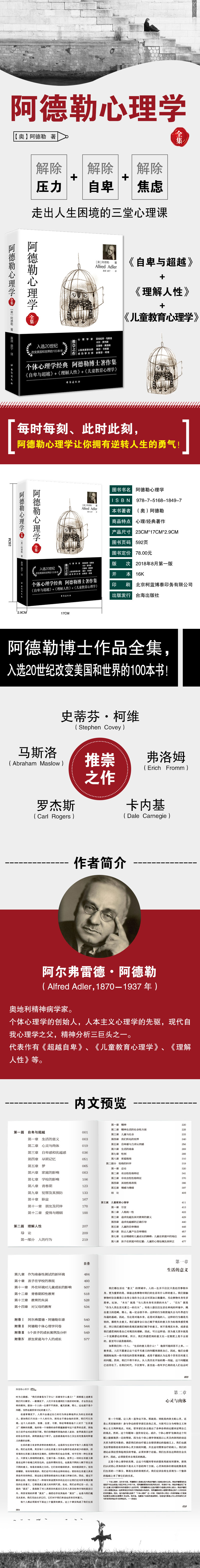 ☆阿德勒博士作品全集,入选20世纪改变美国和世界的100本书 1.个体心理学大师阿德勒代表作,影响西方世界、台湾地区的通俗心理学疗愈书! 2.超越自卑、人性透视和心灵励志,帮你发挥自身潜能、过好人生中的每一天! 3.真实案例、精彩图解,影响了心理学家华生、杜威、马斯洛和罗杰斯的通俗心理学读本! 4.一套适用性广泛的人生指南:你对人生、事业、爱情、家庭、教育的困惑,在这里都能找到答案! ☆解除压力、自卑、焦虑,走出人生困境的三堂心理课 1.《自卑与超越》:成年人超越自卑的勇气,青少年的成长读本。 2.《理解人性》:阿德勒美国心理自助巡讲合集,看透你周围的人,处理好日常关系。 3.《儿童教育心理学》:美国S.T.E.P.父母效能系统训练核心课程, 成年人原生家庭自我诊断读本。 ☆阿德勒心理学:拥抱内在的小孩,遇见更好的自己! |