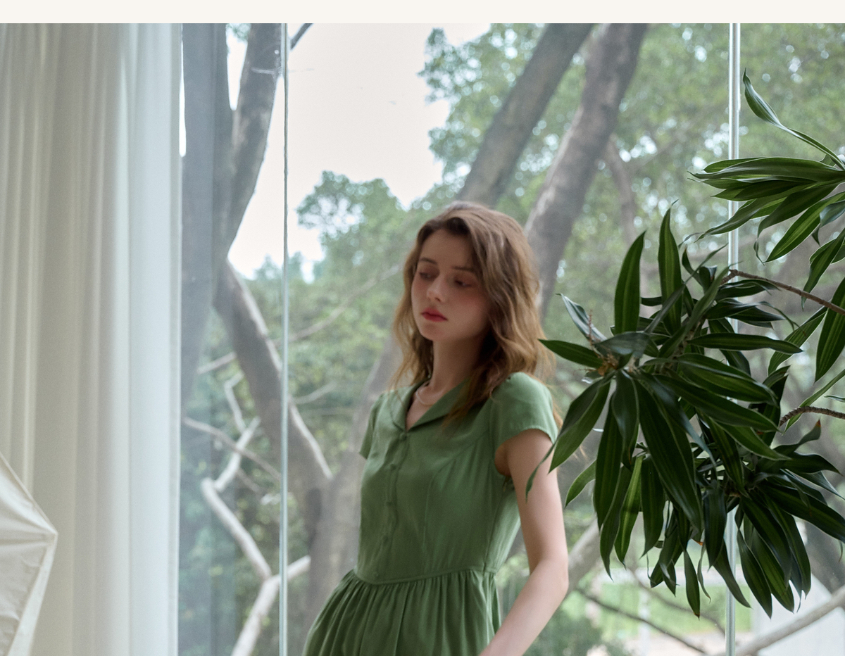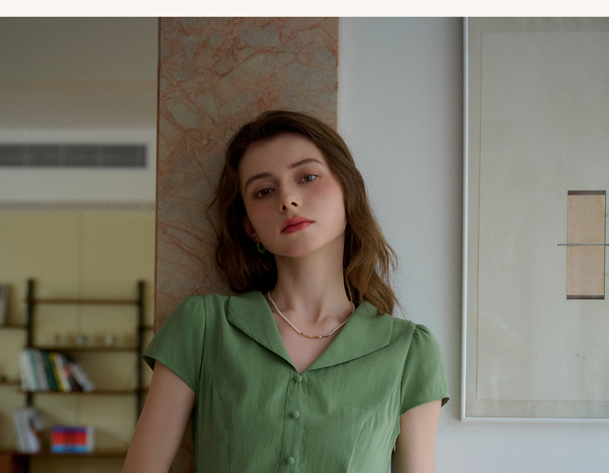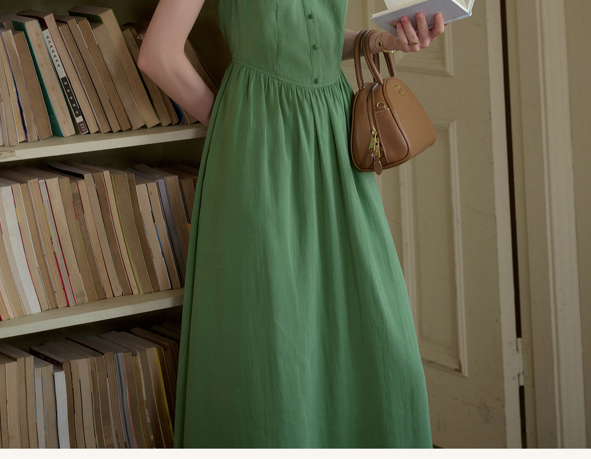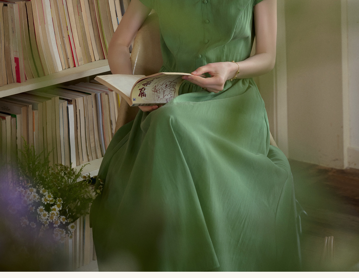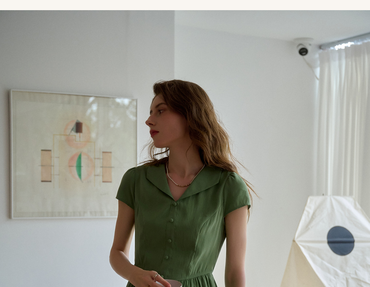 (小眠专属)SimpleRetro复古法式V领绿色连衣裙女衬衫裙