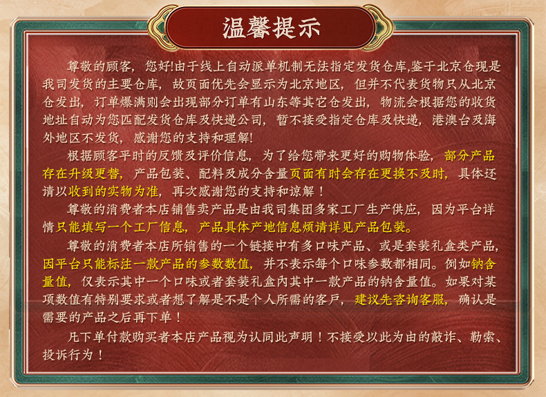 发货提示:购买宝贝生产日期已收到实物为准;新疆,西藏,香港,澳门,台湾地区,国外及国际集运仓等地址由于快递原因无法中转,店铺无法发货,请亲慎拍!望亲知悉!