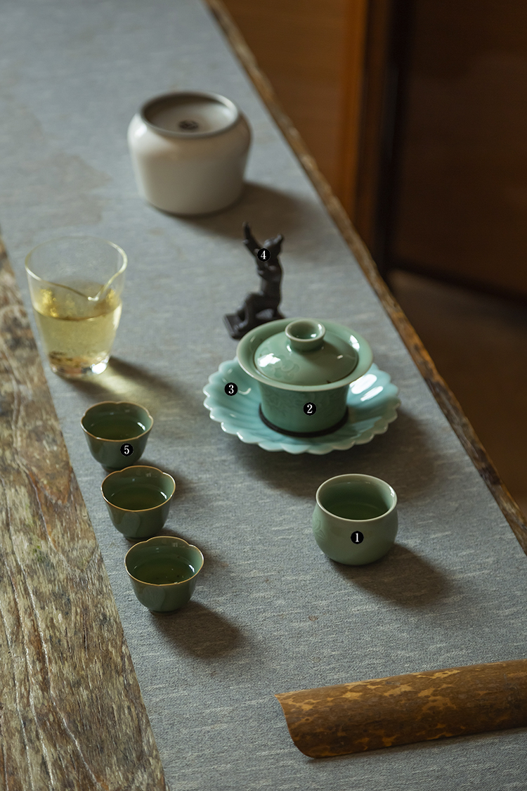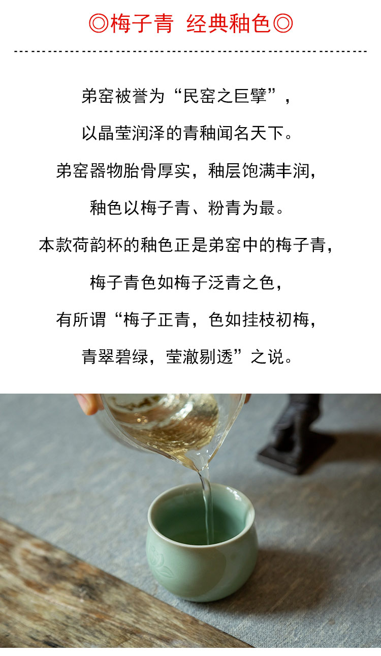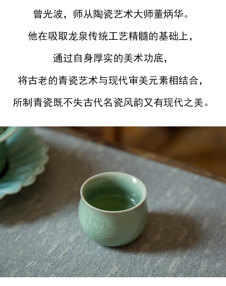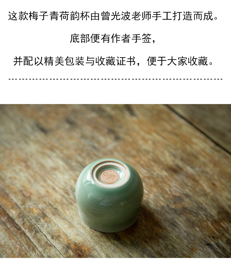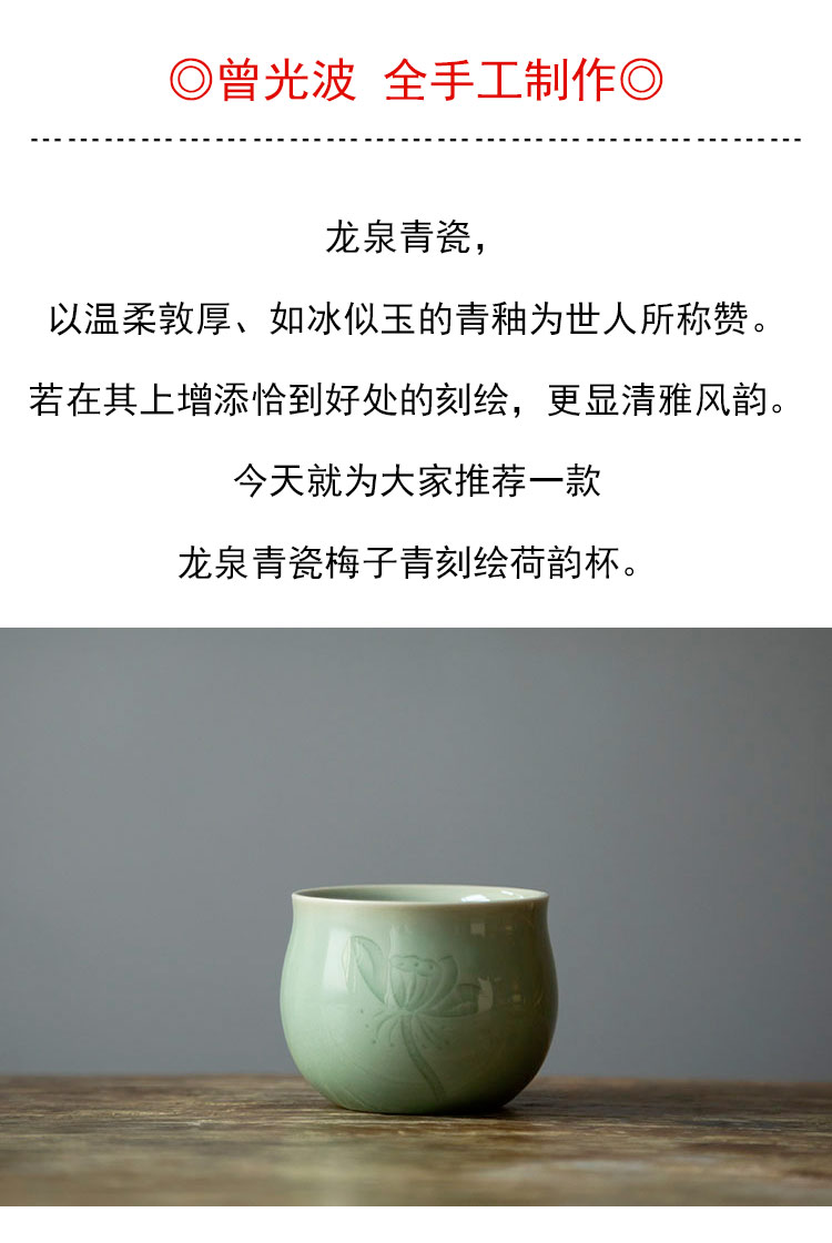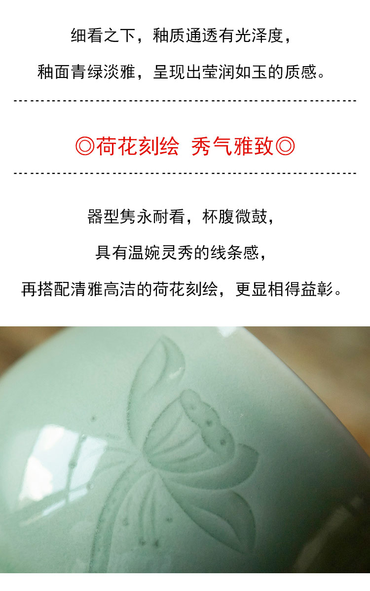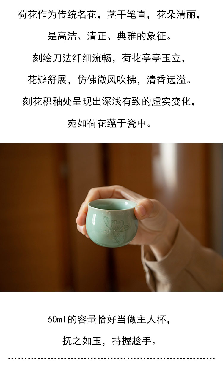 茶香记 龙泉青瓷弟窑梅子青古杯60ml荷韵手工刻绘陶瓷茶杯主人杯