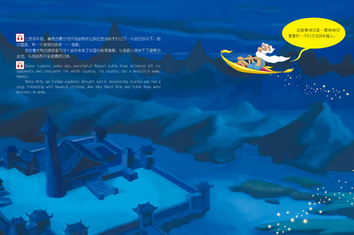 这是一本故事书,用精美的图画和流畅的英汉两种文字,讲述了伟大的探险家马可·波罗的后代小马可与香都国的邪恶宰相福林之间斗智斗勇的奇幻探险故事,故事情节曲折动人,环环相扣。
