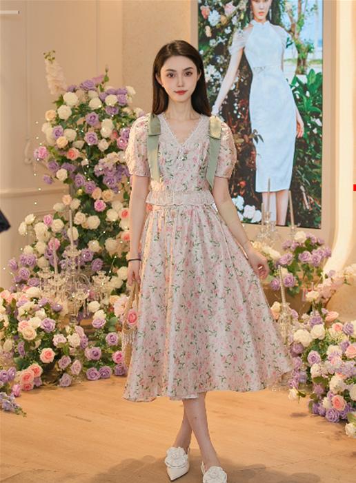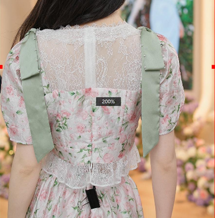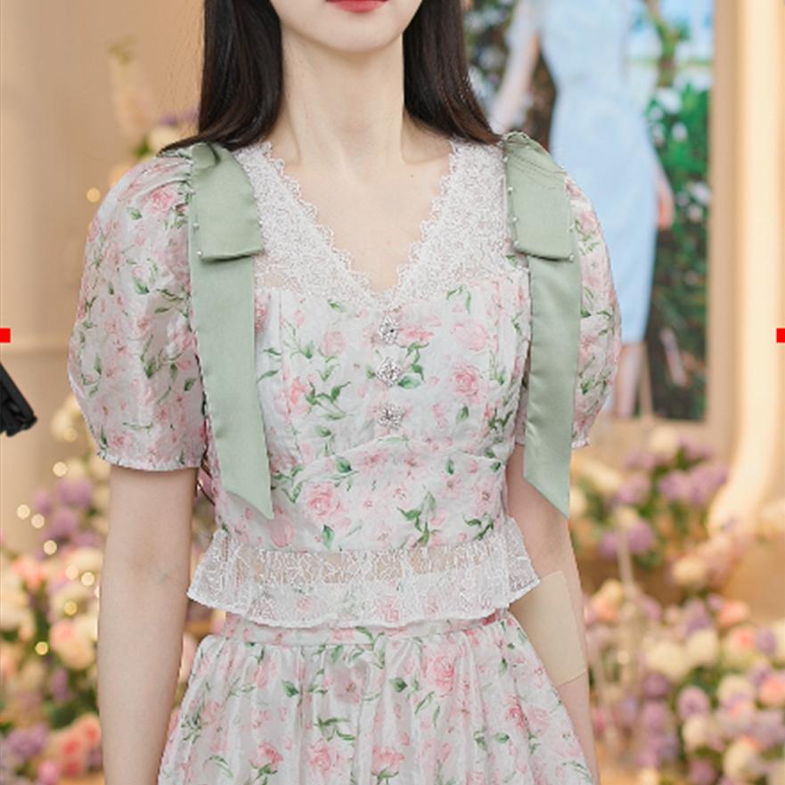 MAXRIENY2024年新款碎花显瘦绿色蝴蝶结复古上衣(货号:MS85TP053)