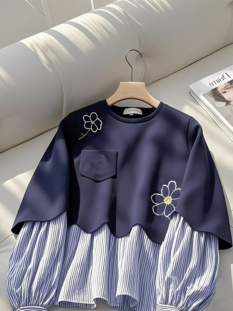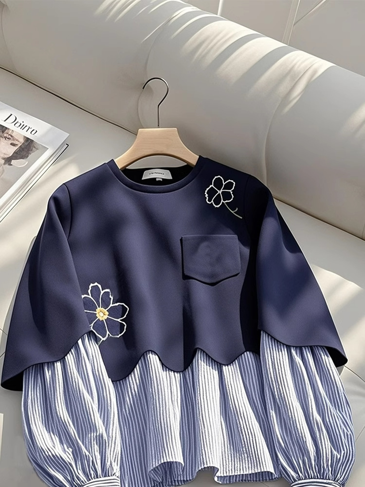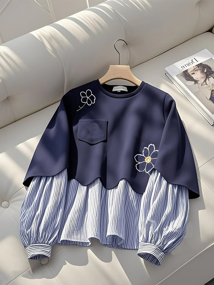 丁摩 秋季新款爆款美式宽松慵懒上衣藏蓝色假两件圆领卫衣女5ZF-4082