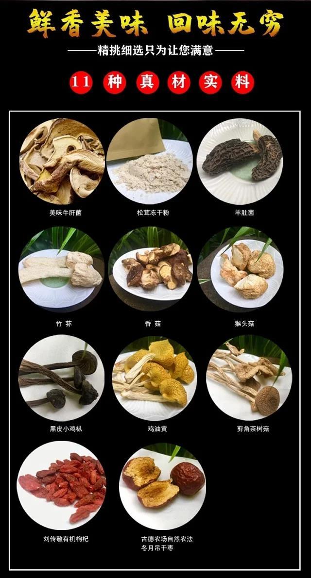 配 料:松茸冻干粉、美味牛肝菌、竹荪、羊肚菌、猴头菇、鸡油黄、黑皮鸡枞、剪角茶树菇、香菇、 古德农场自然农法冬月吊干枣、刘传敬有机枸杞。