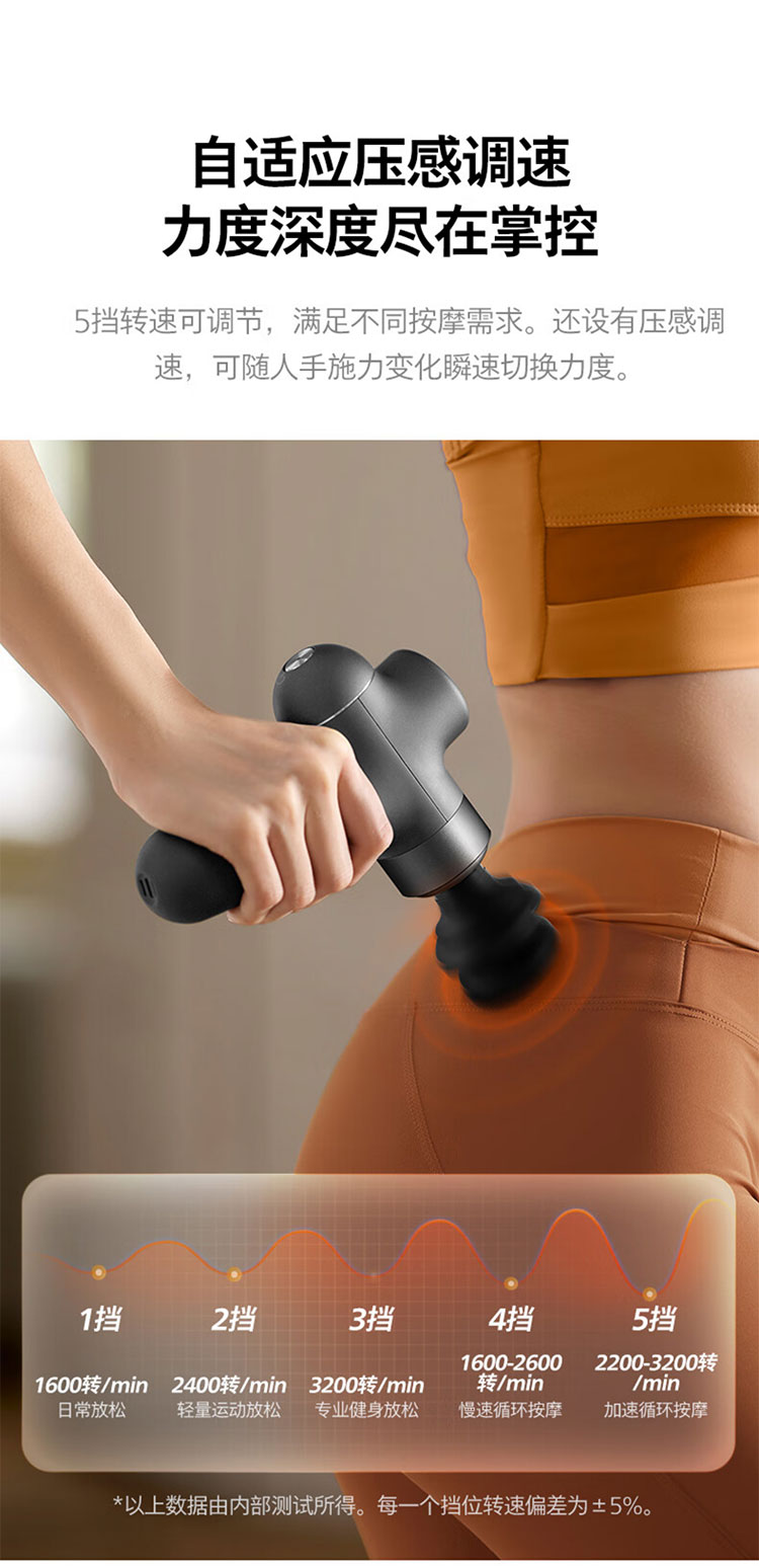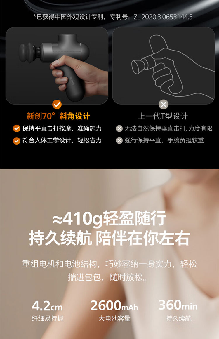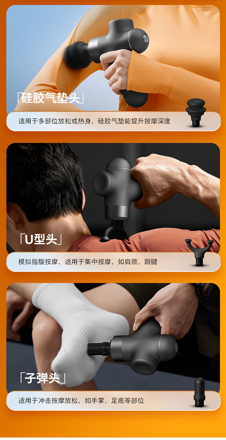 4款按摩头,5个档位;70°斜角设计,更省力,按摩更精准